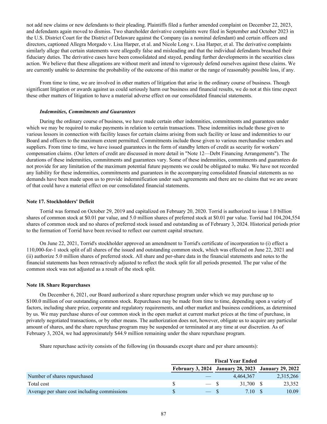 不得在诉状中增加新的诉讼请求或新的被告。原告于2023年12月22日提交了进一步修正的诉状,被告再次动议驳回。两起股东派生诉讼分别于2023年9月和2023年10月在美国特拉华州地方法院针对公司(作为名义被告)以及某些高级职员和董事提起,标题分别为Allegra Morgado诉Lisa Harper等人和Nicole Long诉Lisa Harper等人。派生诉讼同样声称,某些陈述涉嫌虚假和误导性,个别被告违反了其受托责任。衍生工具案件已被合并和搁置,等待证券集体诉讼的进一步发展。我们认为,这些指控毫无根据,并打算针对这些指控进行有力的辩护。我们目前无法确定此事结果的概率或合理可能损失的范围,如果有的话。我们不时涉及在日常业务过程中出现的其他诉讼事项。尽管针对我们的重大诉讼或裁决可能会严重损害我们的业务和财务业绩,但我们目前预计这些其他诉讼事项不会对我们的合并财务报表产生重大不利影响。赔偿、承诺和保证在日常业务过程中,我们已作出某些其他赔偿、承诺和保证,根据这些承诺、承诺和保证,我们可能需要就某些交易进行付款。这些弥偿包括就有关设施租赁而给予不同出租人的弥偿,以应付因该等设施或租赁而产生的某些索偿,以及在允许的最大范围内向我们的董事会和高级人员作出弥偿。承诺包括给予各种商品供应商和供应商的承诺。我们不时以备用信用证的形式出具保函,作为劳动者赔偿索赔的担保。(我们的信用证在“附注12 ——债务融资安排”中有更详细的讨论)。这些赔偿、承诺和保证的期限各不相同。其中一些赔偿、承诺和保证没有规定我们可能有义务支付的最大潜在未来付款的任何限制。我们没有在随附的综合财务报表中记录这些赔偿、承诺和保证的任何责任,因为没有要求我们根据此类协议提供赔偿,也没有我们知道可能对我们的综合财务报表产生重大影响的索赔。注17。股东赤字Torrid成立于2019年10月29日,于2020年2月20日资本化。Torrid被授权以0.01美元的面值发行10亿股普通股,以及以0.01美元的面值发行500万股优先股。截至2024年2月3日,Torrid拥有104,204,554股普通股,没有已发行和流通的优先股。Torrid成立前的历史时期已被修正,以反映我们目前的资本结构。2021年6月22日,Torrid的股东批准了对Torrid公司注册证书的修订,以(i)对已发行和已发行普通股的所有股份进行110,000比1的股票分割,该修订于2021年6月22日生效,并(ii)授权500万股优先股。财务报表和财务报表附注中的所有股份和每股数据均已追溯调整,以反映所有呈报期间的股票分割情况。普通股的面值没有因股票分割而调整。注18。股票回购2021年12月6日,我们的董事会批准了一项股票回购计划,根据该计划,我们可以购买最多1亿美元的已发行普通股。可能会不时进行回购,这取决于多种因素,包括股价、公司和监管要求,以及由我们确定的其他市场和业务条件。我们可以在公开市场以购买时的当前市场价格、私下协商交易或通过其他方式购买我们的普通股。然而,该授权并不要求我们有义务收购任何特定数量的股份,我们可酌情随时暂停或终止股份回购计划。截至2024年2月3日,我们在股票回购计划下剩余约4490万美元。股票回购活动包括以下(以千为单位,股票和每股金额除外):截至2024年2月3日的财政年度2023年1月28日2022年1月29日回购的股票数量— 4,464,367,315,266总成本$ — 31,700 $ 23,352包括佣金在内的平均每股成本$ — 7.10 $ 10.0987