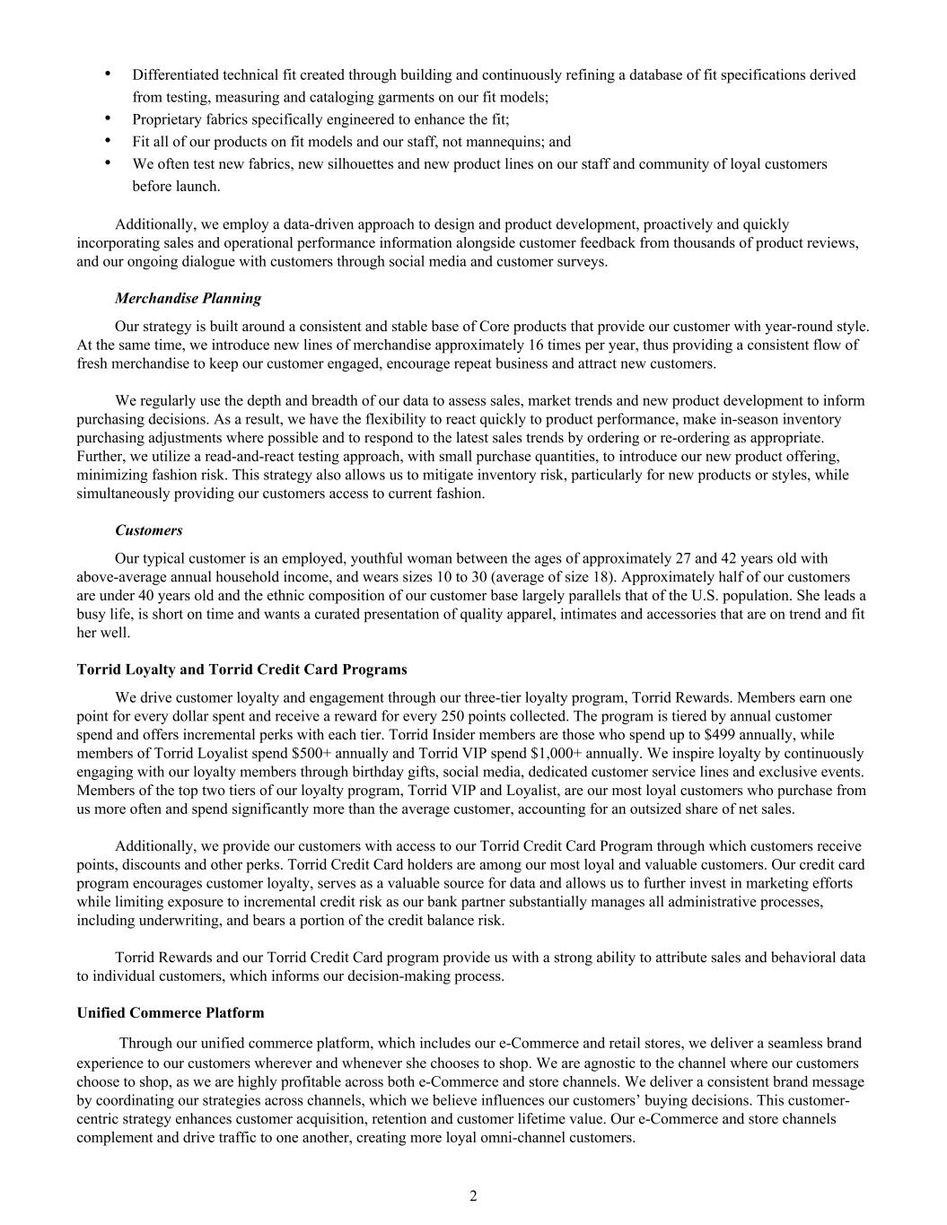 •通过在我们的合身模特上建立并不断完善一个来自测试、测量和编目服装的合身规格数据库,创建了差异化的技术合身;•专为增强合身度而设计的专有面料;•将我们所有的产品适合合身模特和我们的工作人员,而不是人体模型;•我们经常在推出之前在我们的员工和忠实客户社区上测试新面料、新轮廓和新产品线。此外,我们采用数据驱动的方法进行设计和产品开发,主动快速地结合销售和运营绩效信息以及来自数千条产品评论的客户反馈,以及我们通过社交媒体和客户调查与客户进行的持续对话。商品规划我们的战略建立在一个始终如一和稳定的核心产品基础之上,为我们的客户提供全年的风格。同时,我们每年大约16次引入新的商品线,从而提供持续的新鲜商品流,以保持我们的客户参与度,鼓励回头客并吸引新客户。我们经常使用数据的深度和广度来评估销售、市场趋势和新产品开发,为购买决策提供信息。因此,我们可以灵活地对产品性能做出快速反应,在可能的情况下进行当季库存采购调整,并通过酌情订购或重新订购来响应最新的销售趋势。此外,我们利用读取和反应测试方法,以少量的购买量,介绍我们的新产品,最大限度地减少时尚风险。这一策略还使我们能够降低库存风险,特别是对于新产品或款式,同时为我们的客户提供当前时尚的途径。顾客我们的典型顾客是一位年龄在大约27至42岁之间、家庭年收入高于平均水平、穿着10至30码(平均18码)的受雇、年轻女性。我们大约一半的客户年龄在40岁以下,我们客户群的种族构成在很大程度上与美国人口相似。她过着忙碌的生活,时间紧迫,想要一场精心策划的展示,展示符合潮流且非常适合她的优质服装、内衣和配饰。Torrid Loyalty和Torrid信用卡计划我们通过我们的三级忠诚度计划Torrid Rewards来提高客户的忠诚度和参与度。会员每消费1美元可获得1分,每获得250分可获得奖励。该计划按年度客户支出进行分层,并为每一层提供增量福利。Torrid Insider会员是那些每年花费高达499美元的人,而Torrid Loyalist的会员每年花费500美元+,Torrid VIP每年花费1000美元+。我们通过生日礼物、社交媒体、专门的客户服务线和独家活动不断与我们的忠诚会员互动,从而激发忠诚度。我们忠诚度计划的前两级成员Torrid VIP和Loyalist是我们最忠实的客户,他们从我们这里购买的频率更高,花费明显高于普通客户,在净销售额中占了很大份额。此外,我们为客户提供使用我们的Torrid信用卡计划的权限,客户可以通过该计划获得积分、折扣和其他福利。Torrid信用卡持卡人是我们最忠实和最有价值的客户之一。我们的信用卡计划鼓励客户忠诚度,作为宝贵的数据来源,使我们能够进一步投资于营销工作,同时限制增量信用风险的敞口,因为我们的银行合作伙伴实质上管理所有行政流程,包括承保,并承担部分信用余额风险。Torrid Rewards和我们的Torrid信用卡计划为我们提供了将销售和行为数据归于个人客户的强大能力,这为我们的决策过程提供了信息。统一商务平台通过我们的统一商务平台,其中包括我们的电子商务和零售店,我们为客户提供无缝的品牌体验,无论何时何地,她选择购物。我们不知道客户选择购物的渠道,因为我们在电子商务和商店渠道都有很高的利润。我们通过跨渠道协调我们的战略来传递一致的品牌信息,我们认为这会影响客户的购买决策。这种以客户为中心的战略增强了客户获取、保留和客户生命周期价值。我们的电商和门店渠道相辅相成,互相带动流量,创造了更多忠诚的全渠道客户。2