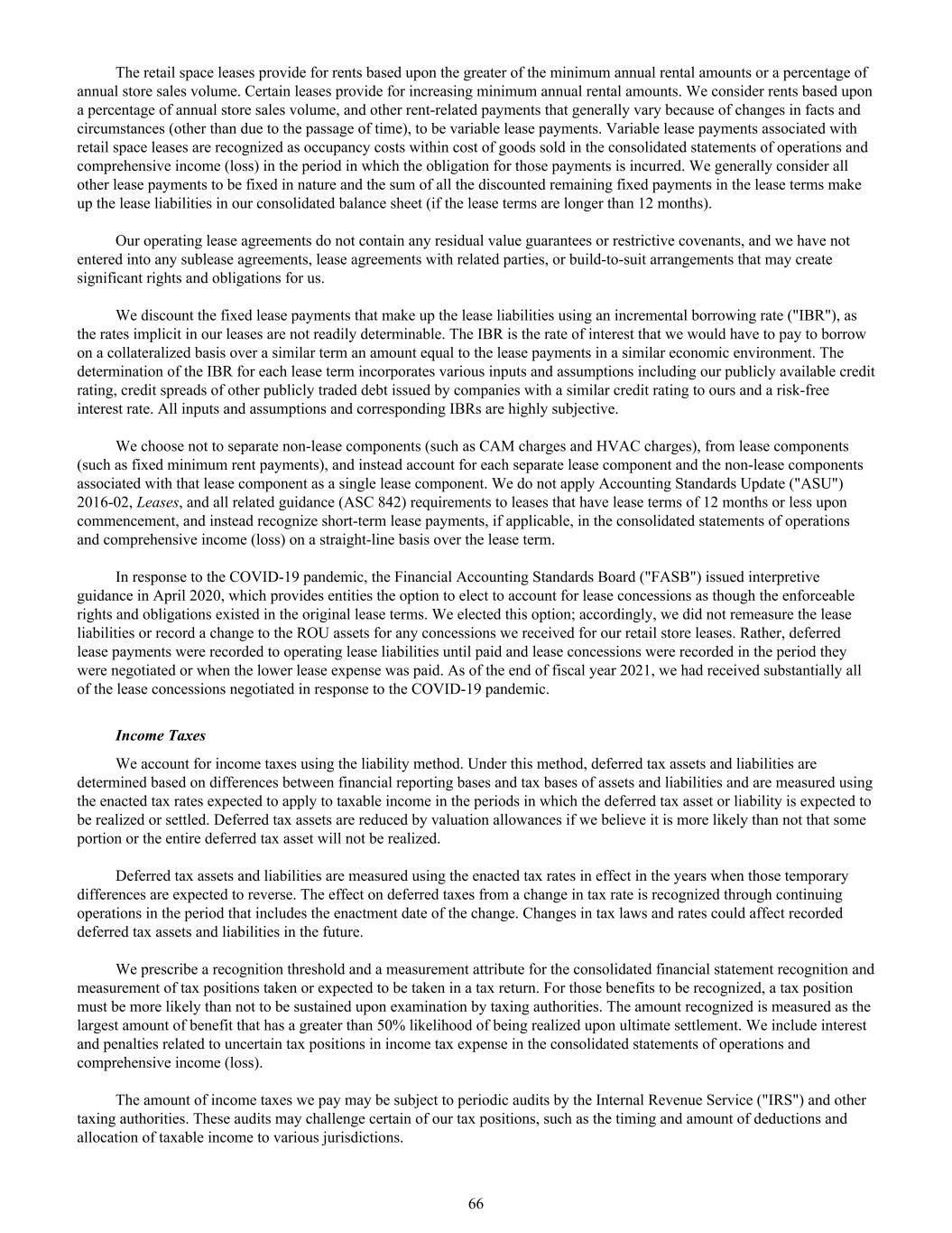 零售空间租约根据最低年租金金额或商店年销售量百分比中的较大者提供租金。某些租约规定增加最低年租金金额。我们认为基于门店年销售量百分比的租金,以及通常因事实和情况的变化而不同的其他与租金相关的付款(除了由于时间的推移),属于可变租赁付款。与零售空间租赁相关的可变租赁付款在这些付款的义务发生期间在综合经营报表和综合收益(亏损)中的已售商品成本内确认为占用成本。我们一般认为所有其他租赁付款在性质上是固定的,并且租赁条款中所有贴现剩余固定付款的总和构成我们综合资产负债表中的租赁负债(如果租赁条款超过12个月)。我们的经营租赁协议不包含任何剩余价值保证或限制性契约,我们没有与相关方订立任何转租协议、租赁协议或可能为我们创造重大权利和义务的定制安排。我们使用增量借款利率(“IBR”)对构成租赁负债的固定租赁付款进行贴现,因为我们租赁中隐含的利率不易确定。IBR是在类似的经济环境中,我们必须支付的利率,才能在类似的期限内以抵押方式借款,金额等于租赁付款。每个租赁期限的IBR的确定包括各种输入和假设,包括我们公开的信用评级、与我们信用评级相似的公司发行的其他公开交易债务的信用利差和无风险利率。所有的输入和假设以及相应的IBR都是高度主观的。我们选择不将非租赁部分(如CAM费用和HVAC费用)与租赁部分(如固定最低租金付款)分开,而是将每个单独的租赁部分和与该租赁部分相关的非租赁部分作为单一租赁部分进行核算。我们不将会计准则更新(“ASU”)2016-02(租赁)和所有相关指引(ASC 842)的要求应用于租赁期在启动时为12个月或更短的租赁,而是在租赁期内以直线法在综合经营报表和综合收益(亏损)中确认短期租赁付款(如适用)。为应对新冠肺炎大流行,财务会计准则委员会(“FASB”)于2020年4月发布了解释性指南,该指南为实体提供了选择对租赁特许权进行会计处理的选项,就好像原始租赁条款中存在可执行的权利和义务一样。我们选择了这个选项;因此,我们没有重新计量租赁负债或记录ROU资产的变化,以获得我们的零售店租赁的任何优惠。相反,递延租赁付款记录在经营租赁负债中,直到在谈判期间或支付较低的租赁费用时已支付和租赁特许权被记录。截至2021财年末,我们收到了为应对新冠肺炎大流行而谈判达成的几乎所有租赁特许权。所得税我们采用负债法核算所得税。在这种方法下,递延所得税资产和负债是根据资产和负债的财务报告基础和计税基础之间的差异确定的,并使用预期实现或结算递延所得税资产或负债的期间内预期适用于应纳税所得额的已颁布税率计量。递延所得税资产在我们认为部分或全部递延所得税资产很可能无法变现的情况下,由估值备抵减少。递延税项资产和负债使用预期该等暂时性差异将转回的年度内有效的已颁布税率计量。税率变动对递延税项的影响通过包括变动颁布日期的期间内的持续经营确认。税法和税率的变化可能会影响未来记录在案的递延所得税资产和负债。我们为合并财务报表确认和计量纳税申报表中采取或预期采取的税务头寸规定了确认门槛和计量属性。为了让那些好处得到认可, 税务状况必须更有可能在税务机关审查后得以维持。确认的金额以最终结算时实现的可能性大于50%的最大利益金额计量。我们将与不确定税务状况相关的利息和罚款计入合并经营报表和综合收益(亏损)的所得税费用中。我们缴纳的所得税金额可能会受到美国国税局(“IRS”)和其他税务机关的定期审计。这些审计可能会挑战我们的某些税务立场,例如扣除的时间和金额以及应税收入分配给不同的司法管辖区。66
