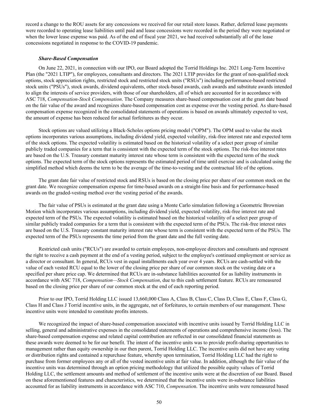 记录我们收到的零售店租赁优惠的ROU资产的变化。相反,递延租赁付款记入经营租赁负债,直到在协商期间或支付较低的租赁费用时已支付和租赁特许权入账。截至2021财年末,我们收到了为应对新冠肺炎大流行而谈判达成的几乎所有租赁特许权。以股份为基础的薪酬2021年6月22日,就我们的首次公开发行股票而言,我们的董事会通过了Torrid Holdings Inc. 2021年长期激励计划(“2021年长期激励计划”),对象为员工、顾问和董事。2021年LTIP规定授予不合格股票期权、股票增值权、限制性股票和限制性股票单位(“RSU”),包括基于业绩的限制性股票单位(“PSU”)、股票奖励、股息等价物、其他基于股票的奖励、现金奖励和替代奖励,旨在使服务提供商的利益与我们的股东的利益保持一致,所有这些都按照ASC 718(补偿-股票补偿)进行会计处理。公司在授予日根据奖励的公允价值计量股份补偿成本,并在归属期内将股份补偿成本确认为费用。由于在综合经营报表中确认的股份补偿费用是基于最终预期归属的奖励,因此在发生实际没收时减少了费用金额。股票期权采用Black-Scholes期权定价模型(“OPM”)进行估值。用于对股票期权进行估值的OPM包含了各种假设,包括股息收益率、预期波动率、无风险利率和股票期权的预期期限。预期波动率是根据与股票期权预期期限一致的类似上市公司的选定同业组的历史波动率估计的。无风险利率以期限与股票期权预期期限一致的美国国债恒定期限利率为基准。股票期权的预期期限是指至行使的估计期限,采用认为期限为期权归属时间和合同期限的平均值的简易法计算。限制性股票和RSU的授予日公允价值基于我们普通股在授予日的每股收盘价。我们在奖励的归属期内以直线法确认基于时间的奖励以及以分级归属法确认基于绩效的奖励的补偿费用。PSU的公允价值是在授予日使用蒙特卡洛模拟按照几何布朗运动估计的,其中包含各种假设,包括股息收益率、预期波动性、无风险利率和PSU的预期期限。预期波动率是根据与PSU预期期限一致的类似上市公司的选定同业组的历史波动率估计的。无风险利率以期限与PSU预期期限一致的美国国债恒定期限利率为基准。PSU的预期期限是指自授予日和全部归属日起的时间段。受限制现金单位(“RCU”)授予某些雇员、非雇员董事和顾问,并代表在归属期结束时获得现金付款的权利,但须视雇员是否继续受雇或担任董事或顾问的情况而定。一般来说,RCU在4年内每年以等额分期付款的方式归属。RCU以现金结算,每个既得RCU的价值等于归属日期我们普通股的每股收盘价或指定的每股价格上限中的较低者。由于这种现金结算特征,我们根据ASC 718,补偿—股票补偿,确定RCU为作为负债工具核算的实质负债。RCU是根据每个报告期末我们普通股的每股收盘价重新计量的。在我们IPO之前,Torrid Holding LLC向我们管理层的某些成员发行了总计13,660,000个A类、B类、C类、D类、E类、F类、G类、H类和J类Torrid激励单位,扣除没收后。该等激励单位拟构成利润权益。我们认识到Torrid Holding LLC在出售、 综合经营报表及综合收益(亏损)中的一般及行政开支。股份补偿费用和相关出资反映在我们的综合财务报表中,因为这些奖励被认为是为了我们的利益。激励单位的意图是向管理层提供利润分享机会,而不是我们当时的母公司Torrid Holding LLC的股权所有权。激励单位没有任何投票权或分配权,并包含回购特征,据此,在终止时,Torrid Holding LLC有权以公允价值向前雇员购买任何或所有已归属的激励单位。此外,虽然激励单位的公允价值是通过利用Torrid Holding LLC可能的股权价值的期权定价方法确定的,但激励单位的结算金额和结算方法由我们的董事会酌情决定。基于前述这些特征和特征,我们按照ASC 710,薪酬确定激励单位为作为负债工具核算的实质负债。激励单位重新计量基于50