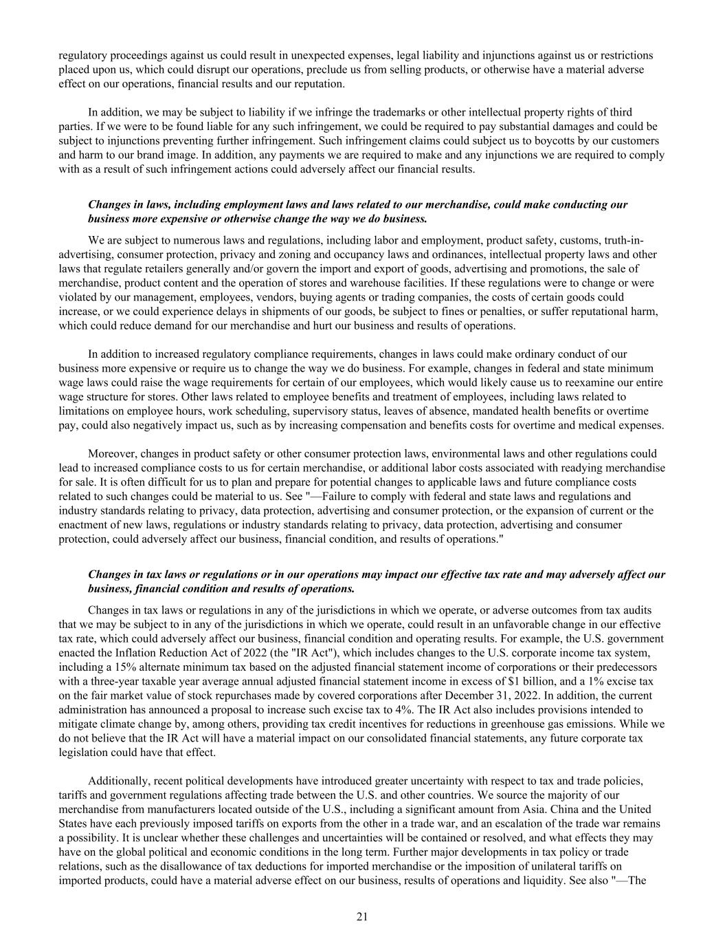 针对我们的监管程序可能会导致针对我们的意外费用、法律责任和禁令或对我们施加的限制,这可能会扰乱我们的运营,阻止我们销售产品,或以其他方式对我们的运营、财务业绩和我们的声誉产生重大不利影响。此外,如果我们侵犯了第三方的商标或其他知识产权,我们可能会承担责任。如果我们被认定对任何此类侵权行为负有责任,我们可能会被要求支付巨额损害赔偿,并可能受到禁止进一步侵权的禁令的约束。此类侵权索赔可能会使我们受到客户的抵制,并损害我们的品牌形象。此外,由于此类侵权行为,我们被要求支付的任何款项以及我们被要求遵守的任何禁令都可能对我们的财务业绩产生不利影响。法律的变化,包括就业法和与我们的商品相关的法律,可能会使我们开展业务的成本更高,或者以其他方式改变我们开展业务的方式。我们受众多法律法规的约束,包括劳动和就业、产品安全、海关、广告真相、消费者保护、隐私和分区和占用法律法规、知识产权法和其他一般规范零售商和/或规范货物进出口、广告和促销、商品销售、产品内容以及商店和仓库设施运营的法律。如果这些规定发生变化或被我们的管理层、员工、供应商、采购代理或贸易公司违反,某些商品的成本可能会增加,或者我们可能会遇到货物发货延迟、受到罚款或处罚,或者遭受声誉损害,这可能会减少对我们商品的需求并损害我们的业务和经营业绩。除了增加监管合规要求外,法律的变化可能会使我们开展业务的普通行为变得更加昂贵,或者要求我们改变我们开展业务的方式。例如,联邦和州最低工资法的变化可能会提高我们某些员工的工资要求,这可能会导致我们重新审视商店的整个工资结构。其他与员工福利和员工待遇相关的法律,包括与员工工时限制、工作安排、监管状态、请假、强制性健康福利或加班费相关的法律,也可能对我们产生负面影响,例如增加加班和医疗费用的补偿和福利成本。此外,产品安全或其他消费者保护法、环境法和其他法规的变化可能导致我们对某些商品的合规成本增加,或与准备销售的商品相关的额外劳动力成本。我们通常很难为适用法律的潜在变更进行规划和准备,与此类变更相关的未来合规成本对我们来说可能是重大的。请参阅“—未能遵守与隐私、数据保护、广告和消费者保护相关的联邦和州法律法规和行业标准,或扩大现行或颁布与隐私、数据保护、广告和消费者保护相关的新法律、法规或行业标准,可能会对我们的业务、财务状况和经营业绩产生不利影响。”税法或法规或我们的运营的变化可能会影响我们的有效税率,并可能对我们的业务、财务状况和经营业绩产生不利影响。我们经营所在的任何司法管辖区的税法或法规的变化,或我们在经营所在的任何司法管辖区可能受到的税务审计的不利结果,都可能导致我们的有效税率发生不利变化,从而可能对我们的业务、财务状况和经营业绩产生不利影响。例如,美国政府颁布了2022年《通胀削减法案》(简称“IR法案”),其中包括对美国企业所得税制度的修改,包括根据三年纳税年度年均调整后财务报表收入超过10亿美元的公司或其前身的调整后财务报表收入征收15%的替代最低税,以及对2022年12月31日之后覆盖公司进行的股票回购的公平市场价值征收1%的消费税。此外,本届政府已宣布将此类消费税提高至4%的提案。《投资者关系法》还包括旨在缓解气候变化的条款,其中包括为减少温室气体排放提供税收抵免激励措施。虽然我们认为投资者关系法案不会对我们的合并财务报表产生实质性影响,但未来的任何公司税务立法都可能产生这种影响。此外, 最近的政治事态发展在影响美国与其他国家贸易的税收和贸易政策、关税和政府法规方面带来了更大的不确定性。我们的大部分商品都是从位于美国以外的制造商那里采购的,其中很大一部分来自亚洲。中美此前已在贸易战中各自对对方出口产品征收关税,贸易战升级仍有可能。目前还不清楚这些挑战和不确定性是否会得到遏制或解决,以及它们可能在长期内对全球政治和经济状况产生何种影响。税收政策或贸易关系的进一步重大发展,例如不允许对进口商品进行税收减免或对进口产品征收单边关税,可能会对我们的业务、经营业绩和流动性产生重大不利影响。另见" — The 21