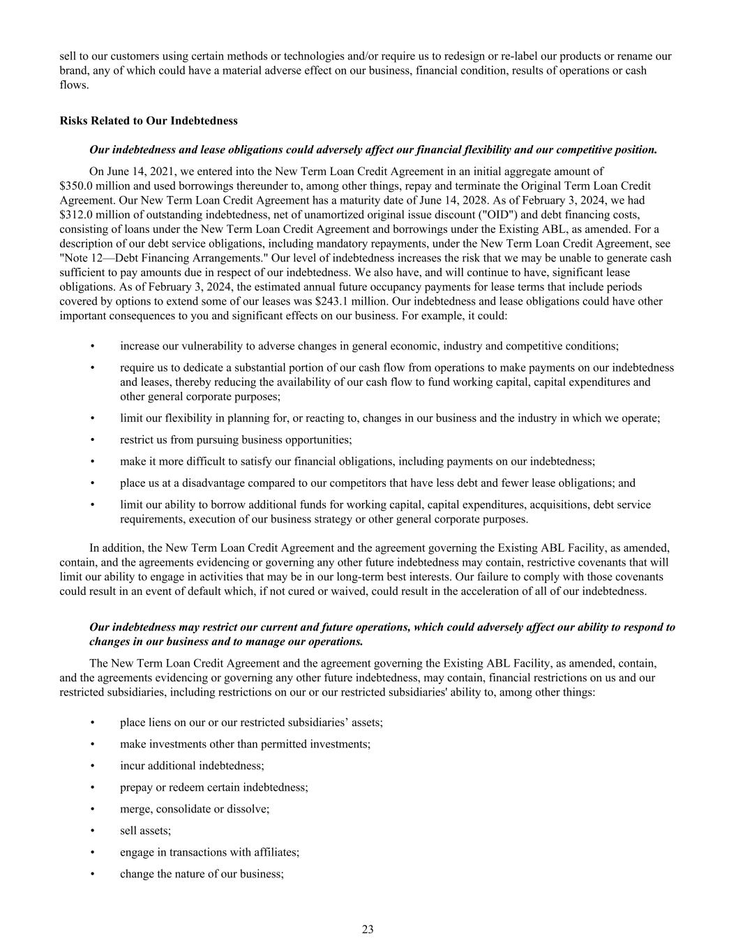 使用某些方法或技术向我们的客户销售产品和/或要求我们重新设计或重新标记我们的产品或重新命名我们的品牌,其中任何一项都可能对我们的业务、财务状况、经营业绩或现金流量产生重大不利影响。与我们的债务相关的风险我们的债务和租赁义务可能会对我们的财务灵活性和我们的竞争地位产生不利影响。于2021年6月14日,我们订立新的定期贷款信贷协议,初步总金额为3.50亿美元,并使用根据该协议的借款(其中包括)偿还及终止原定期贷款信贷协议。我们新的定期贷款信贷协议的到期日为2028年6月14日。截至2024年2月3日,我们有3.12亿美元的未偿债务,扣除未摊销的原始发行折扣(“OID”)和债务融资成本,包括新定期贷款信贷协议下的贷款和经修订的现有ABL下的借款。有关我们在新定期贷款信贷协议下的偿债义务(包括强制还款)的描述,请参阅“附注12 ——债务融资安排”。我们的负债水平增加了风险,即我们可能无法产生足够的现金来支付与我们的债务相关的到期金额。我们也有并将继续有重大的租赁义务。截至2024年2月3日,包括延长我们部分租约的选择权所涵盖期间在内的租赁条款的估计年度未来占用付款为2.431亿美元。我们的债务和租赁义务可能会对您产生其他重要后果,并对我们的业务产生重大影响。例如,它可能:•增加我们对总体经济、行业和竞争条件不利变化的脆弱性;•要求我们将运营现金流的很大一部分用于支付我们的债务和租赁,从而减少我们的现金流为营运资金、资本支出和其他一般公司用途提供资金的可用性;•限制我们在规划或应对我们的业务和我们经营所在行业的变化方面的灵活性;•限制我们寻求商业机会;•使我们更难履行我们的财务义务,包括偿还我们的债务;•与债务较少、租赁义务较少的竞争对手相比,我们处于不利地位;•限制我们为营运资金、资本支出、收购、偿债要求、执行我们的业务战略或其他一般公司目的借入额外资金的能力。此外,经修订的新定期贷款信贷协议和管理现有ABL融资的协议包含,以及证明或管理任何其他未来债务的协议可能包含限制性契约,这些契约将限制我们从事可能符合我们长期最佳利益的活动的能力。我们未能遵守这些盟约可能会导致违约事件,如果不予以纠正或豁免,可能会导致我们所有债务的加速偿还。我们的负债可能会限制我们当前和未来的运营,这可能会对我们应对业务变化和管理运营的能力产生不利影响。经修订的新定期贷款信贷协议和管理现有ABL融资的协议包含,以及证明或管理任何其他未来债务的协议可能包含对我们和我们的受限制子公司的财务限制,包括限制我们或我们的受限制子公司的能力,其中包括:•对我们或我们的受限制子公司的资产设置留置权;•进行许可投资以外的投资;•产生额外债务;•预付或赎回某些债务;•合并、合并或解散;•出售资产;•与关联公司进行交易;•改变我们的业务性质;23