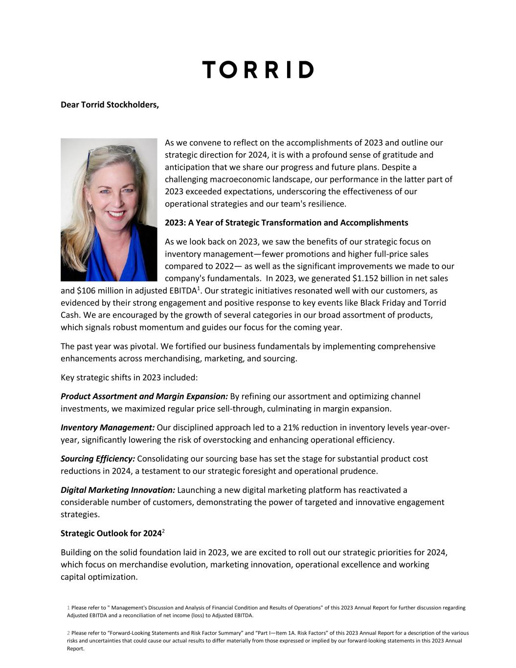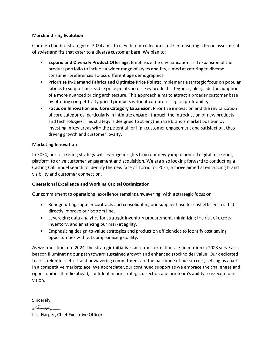 尊敬的Torrid股民朋友们,在我们召开会议,反思2023年的成就,勾勒2024年的战略方向之际,我们正是怀着一种深深的感激和期待,分享我们的进步和未来的规划。尽管宏观经济形势充满挑战,但我们在2023年下半年的表现超出预期,凸显了我们运营战略的有效性和我们团队的韧性。2023年:战略转型和成就的一年当我们回顾2023年时,我们看到了我们将战略重点放在库存管理上的好处——与2022年相比,促销活动更少,全价销售更高——以及我们对公司基本面的显着改善。2023年,我们产生了11.52亿美元的净销售额和1.06亿美元的调整后EBITDA 1。我们的战略举措与客户产生了良好的共鸣,他们对黑色星期五和Torrid Cash等关键事件的强烈参与和积极回应就是明证。我们对我们广泛的产品分类中的几个类别的增长感到鼓舞,这标志着强劲的势头,并指导了我们来年的重点。过去的一年至关重要。我们通过在商品销售、营销和采购方面实施全面增强来加强我们的业务基础。2023年的关键战略转变包括:产品分类和利润率扩张:通过完善我们的分类和优化渠道投资,我们最大限度地提高了正价销售,最终实现了利润率扩张。库存管理:我们严谨的方法导致库存水平同比下降21%,显着降低了库存积压的风险并提高了运营效率。采购效率:巩固我们的采购基础为2024年大幅降低产品成本奠定了基础,这证明了我们的战略远见和运营审慎。数字营销创新:推出新的数字营销平台重新激活了相当数量的客户,展示了有针对性的创新参与策略的力量。20242年战略展望在2023年奠定的坚实基础上,我们很高兴推出我们2024年的战略重点,重点是商品进化、营销创新、卓越运营和营运资本优化。1有关调整后EBITDA和净收入(亏损)与调整后EBITDA的对账的进一步讨论,请参阅本2023年年度报告的“管理层对财务状况和经营业绩的讨论与分析”。2请参阅“前瞻性陈述和风险因素摘要”和“第一部分——第1a项。风险因素”这份2023年年度报告,用于描述可能导致我们的实际结果与我们在这份2023年年度报告中的前瞻性陈述中明示或暗示的结果存在重大差异的各种风险和不确定性。
