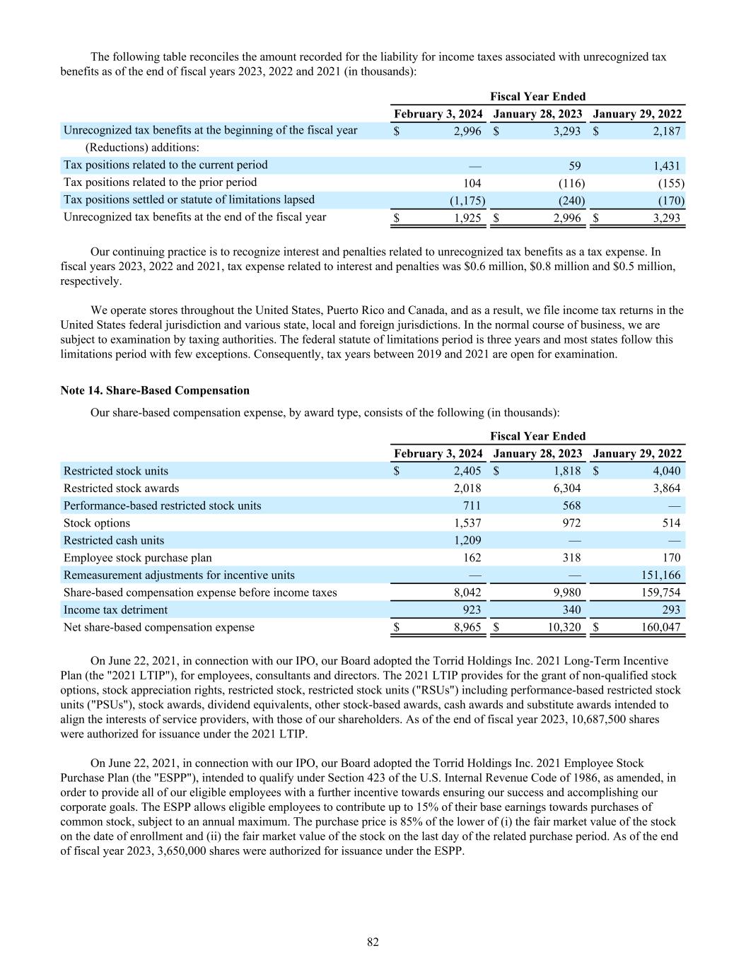 下表调节了截至2023、2022和2021财年末与未确认的税收优惠相关的所得税负债的记录金额(单位:千):截至2024年2月3日的财政年度2023年1月28日1月29日,2022财年年初未确认的税收优惠$ 2,996 $ 3,293 $ 2,187(减少)增加:与本期相关的税收头寸— 591,431与上一期相关的税收头寸104(116)(155)已结算的税收头寸或时效失效(1,175)(240)(170)财年末未确认的税收优惠$ 1,925 $ 2,996 $ 3,293我们的持续做法是将与未确认的税收优惠相关的利息和罚款确认为税收费用。在2023、2022和2021财年,与利息和罚款相关的税收支出分别为0.6百万美元、0.8百万美元和0.5百万美元。我们在美国、波多黎各和加拿大各地经营门店,因此,我们在美国联邦司法管辖区以及各州、地方和外国司法管辖区提交所得税申报表。在正常经营过程中,我们要接受税务机关的审查。联邦时效期限为三年,大多数州遵循这一时效期限,几乎没有例外。因此,2019年至2021年的纳税年度开放审查。注14。基于股份的薪酬我们的基于股份的薪酬费用,按奖励类型,包括以下(以千为单位):截至2024年2月3日的财政年度2023年1月28日1月29日,2022限制性股票单位$ 2,405 $ 1,818 $ 4,040限制性股票奖励2,0186,3043,864基于业绩的限制性股票单位711568 —股票期权1,537972514限制性现金单位1,209 ——员工股票购买计划162318170激励单位的重新计量调整—— 151,166所得税前股权激励费用8,0429,980159,754所得税减损923340293股权激励费用净额8,965美元10,320美元160,047美元2021年6月22日,就我们的首次公开募股而言,我们的董事会通过了《Torrid Holdings Inc. 2021年长期激励计划》(“2021年LTIP”),为员工,顾问和董事。2021年LTIP规定授予不合格股票期权、股票增值权、限制性股票、限制性股票单位(“RSU”),包括基于业绩的限制性股票单位(“PSU”)、股票奖励、股息等价物、其他基于股票的奖励、现金奖励和替代奖励,旨在使服务提供商的利益与我们股东的利益保持一致。截至2023财年末,根据2021年LTIP授权发行的股票为1068.75万股。2021年6月22日,就我们的首次公开募股而言,我们的董事会通过了Torrid Holdings Inc. 2021年员工股票购买计划(“ESPP”),该计划旨在符合经修订的1986年美国国内税收法第423条规定的资格,以便为我们所有符合条件的员工提供进一步的激励,以确保我们的成功和实现我们的公司目标。ESPP允许符合条件的员工将最多15%的基本收入用于购买普通股,但须遵守年度最高限额。购买价格为(i)股票在注册日期的公平市场价值和(ii)相关购买期最后一天的股票公平市场价值两者中较低者的85%。截至2023财年末,根据ESPP授权发行的股票为3,650,000股。82