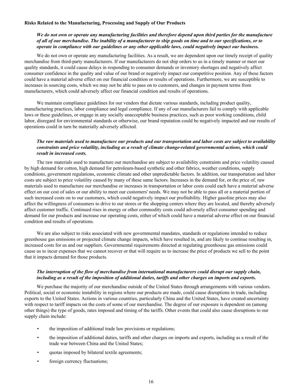 与我们产品的制造、加工和供应相关的风险我们不拥有或经营任何制造设施,因此我们的所有商品的制造依赖于第三方。制造商无法按时按我们的规格发货,或无法按照我们的准则或任何其他适用法律运营,可能会对我们的业务产生负面影响。我们不拥有或经营任何制造设施。因此,我们依赖于我们及时收到第三方制造商的优质商品。如果我们的制造商没有及时向我们发货订单或达到我们的质量标准,可能会导致延迟响应消费者的需求或库存短缺,并对消费者对我们品牌的质量和价值的信心产生负面影响或对我们的竞争地位产生负面影响。任何这些因素都可能对我们的财务状况或经营业绩产生重大不利影响。此外,我们容易受到采购成本增加的影响,我们可能无法将其转嫁给客户,以及制造商付款条件的变化,这可能会对我们的财务状况和经营业绩产生不利影响。我们为我们的供应商维护合规准则,这些准则规定了各种标准,包括产品质量、制造实践、劳工合规和法律合规。如果我们的任何制造商未能遵守适用的法律或这些准则,或从事任何社会上不可接受的商业行为,例如恶劣的工作条件、童工、无视环境标准或其他情况,我们的品牌声誉可能会受到负面影响,我们的经营业绩也可能反过来受到重大不利影响。用于制造我们产品的原材料以及我们的运输和劳动力成本受到供应限制和价格波动的影响,包括与气候变化相关的政府行动的结果,这可能导致成本增加。用于制造我们商品的原材料受到对棉花的高需求、对以石油为基础的合成和其他织物的高需求、天气条件、供应条件、政府法规、经济气候和其他不可预测因素造成的供应限制和价格波动。此外,我们的运输和劳动力成本受制于许多相同因素造成的价格波动。对用于制造我们商品的原材料的需求或价格的增加,或运输或劳动力成本的增加,都可能对我们的销售成本或我们满足客户需求的能力产生重大不利影响。我们可能无法将这种增加的成本的全部或重要部分转嫁给我们的客户,这可能会对我们的盈利能力产生负面影响。较高的汽油价格也可能影响消费者驾车前往我们门店或所在购物中心的意愿,从而对客流量产生不利影响。能源或其他商品成本的持续上涨可能会对消费者支出和对我们产品的需求产生不利影响,并增加我们的运营成本,这两种情况都可能对我们的财务状况和经营业绩产生重大不利影响。我们还面临与旨在减少温室气体排放或预计的气候变化影响的新的政府授权、标准或法规相关的风险,这些已经并可能继续导致我们和我们的供应商的成本增加。旨在监管温室气体排放的政府要求可能会导致我们产生无法收回的费用,或者这将要求我们提高所销售产品的价格,以至于影响对这些产品的需求。国际制造商的商品流中断可能会扰乱我们的供应链,包括对进出口征收额外关税、关税和其他费用。我们通过与各种供应商的安排,在美国境外采购我们的大部分商品。我们生产产品的地区的政治、社会或经济不稳定,可能会导致贸易中断,包括对美国的出口。各国的行动,特别是中国和美国的行动,对我们的一些商品的成本造成了关税影响方面的不确定性。我们的风险敞口程度取决于(除其他外)商品类型、征收的税率和征收关税的时间。其他也可能对我们的供应链造成中断的事件包括:•对进出口征收额外的贸易法律条款或条例;•对进出口征收额外关税、关税和其他费用, 包括中美贸易战的结果;•双边纺织品协议规定的配额;•外汇波动;16