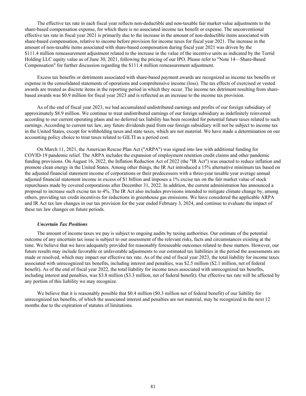 每个会计年度的有效税率反映了对股份补偿费用的不可抵扣和不可征税的公平市场价值调整,对此不存在相关的所得税优惠或费用。2021财年的非常规有效税率主要是由于与基于股份的薪酬相关的不可扣除项目的金额增加,相对于2021财年所得税拨备前的收入。2021财年与股份薪酬相关的非应税项目金额的增加是由于根据我们的IPO定价,与截至2021年6月30日的Torrid Holding LLC股权价值所示的激励单位价值增加相关的1.114亿美元的重新计量调整所推动的。有关1.114亿美元重新计量调整的进一步讨论,请参阅“附注14 ——基于股份的薪酬”。与股份支付奖励相关的超额税收利益或不利因素在综合经营报表和综合收益(亏损)中确认为所得税利益或费用。行使或既得奖励的税务影响在其发生的报告期内作为离散项目处理。2023财年,基于股份的奖励产生的所得税减损为0.9百万美元,反映为所得税拨备的增加。截至2023财年末,我们的外国子公司累计未分配收益和利润约为890万美元。根据我们目前的经营计划,我们继续将我们的外国子公司的未分配收益视为无限期再投资,并且没有记录与此类收益相关的潜在未来税项的递延所得税负债。根据现行税法,未来从我们的外国子公司支付的任何股息将不需要在美国缴纳所得税,但预扣税和州税除外,这并不重要。我们已经就我们的会计政策选择做出了决定,将与GILTI相关的税收视为期间成本。2021年3月11日,《美国救援计划法案》(简称“ARPA”)签署成为法律,为新冠疫情救济提供额外资金。ARPA包括扩大就业保留信贷申请和其他流行病资助条款。2022年8月16日,《2022年通胀削减法案》(简称“IR法案”)在美国颁布,旨在降低通胀并促进清洁能源。除其他事项外,《投资者关系法》引入了基于三年纳税年度年均调整后财务报表收入超过10亿美元的公司或其前身的调整后财务报表收入的15%的替代最低税,并对2022年12月31日之后涵盖公司进行的股票回购的公平市场价值征收1%的消费税。此外,本届政府已宣布将此类消费税提高至4%的提案。《投资者关系法案》还包括旨在缓解气候变化的条款,其中包括为减少温室气体排放提供税收抵免激励措施。我们在截至2024年2月3日止年度的税收条款中考虑了适用的ARPA和IR法案税法变化,并继续评估这些税法变化对未来期间的影响。不确定的税务状况我们缴纳的所得税金额将受到税务机关的持续审计。我们对任何不确定税务问题的潜在结果的估计取决于我们对当时存在的相关风险、事实和情况的评估。我们认为,我们已经为与这些事项相关的合理可预见的结果提供了充分的准备。然而,我们未来的业绩可能包括在作出评估或解决评估期间对我们的估计税务负债进行有利或不利的调整,这可能会影响我们的有效税率。截至2023财年末,与未确认的税收优惠(包括利息和罚款)相关的所得税总负债为250万美元(210万美元,扣除联邦福利)。截至2022财年末,与未确认的税收优惠(包括利息和罚款)相关的所得税总负债为380万美元(330万美元,扣除联邦福利)。我们的有效税率将受到我们可能确认的这一负债的任何部分的影响。我们认为,由于诉讼时效到期,我们有可能在未来12个月内确认我们对未确认的税收优惠的负债中的40万美元(扣除联邦福利后的30万美元),其中相关的利息和罚款并不重要。81