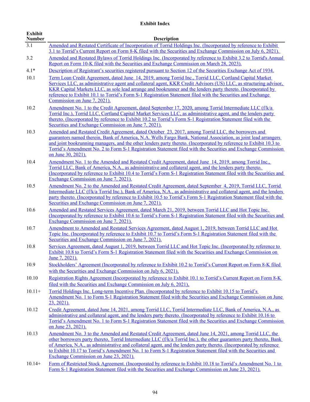 附件指数附件编号说明3.1经修订及重列的Torrid Holdings Inc.的公司注册证书(通过参考TORrid于2021年7月6日向美国证券交易委员会提交的有关表格8-K的当前报告附件 3.1而注册成立)。3.2经修订和重述的《Torrid Holdings Inc.章程》(参照Torrid于2023年3月28日向美国证券交易委员会提交的10-K表格年度报告的附件 3.2纳入)。4.1 *根据1934年《证券交易法》第12条登记的注册人证券的说明。10.1 Torrid Inc.、Torrid LLC、Cortland Capital Market Services LLC(作为行政代理人和抵押品代理人)、KKR Credit Advisors(US)LLC(作为结构顾问)、KKR Capital Markets LLC(作为唯一牵头安排和账簿管理人)以及贷款方之间日期为2019年6月14日的定期贷款信贷协议。(通过参考附件 10.1纳入Torrid于2021年6月7日向美国证券交易委员会提交的表格S-1注册声明)。10.2 Torrid Intermediate LLC(f/k/a Torrid Inc.)、Torrid LLC、Cortland Capital Market Services LLC(作为行政代理人)及其贷款方于2020年9月17日对信贷协议进行的第1号修订。(通过参考附件 10.2纳入Torrid于2021年6月7日向美国证券交易委员会提交的S-1表格注册声明)。10.3 Torrid LLC、其中指定的借款人和担保人、美国银行、N.A. 富国银行银行、全国协会作为联席牵头安排人和联席簿记管理人以及其他贷款方于2017年10月23日签订的经修订和重述的信贷协议。(藉参考附件 10.3纳入Torrid于2021年6月30日向美国证券交易委员会提交的表格S-1注册声明的第2号修订)。10.4日期为2019年6月14日的经修订和重述的信贷协议的第1号修正案,由作为行政和抵押代理人的Torrid Inc.、Torrid LLC、Bank of America,N.A.及其贷款方签署。(通过参考附件 10.4纳入Torrid于2021年6月7日向美国证券交易委员会提交的S-1表格注册声明)。10.5对2019年9月4日经修订和重述的信贷协议的第2号修订,Torrid LLC、Torrid Intermediate LLC(f/k/a Torrid Inc.)、Bank of America,N.A.作为行政和抵押代理人,以及贷款方。(通过参考附件 10.5纳入Torrid于2021年6月7日向美国证券交易委员会提交的S-1表格注册声明)。10.6 Torrid LLC与Hot Topic Inc.于2019年3月21日签订的经修订和重述的服务协议(通过参考Torrid于2021年6月7日向美国证券交易委员会提交的S-1表格注册声明中的附件 10.6纳入)。10.7 Torrid LLC与Hot Topic Inc.于2019年8月1日对经修订和重述的服务协议进行修订(通过参考Torrid于2021年6月7日向美国证券交易委员会提交的S-1表格注册声明的附件 10.7纳入)。Torrid LLC与Hot Topic Inc.签订的日期为2019年8月1日的10.8服务协议(通过参考Torrid于2021年6月7日向美国证券交易委员会提交的表格S-1注册声明的附件 10.8纳入)。10.9股东协议(通过参考Torrid于2021年7月6日向美国证券交易委员会提交的关于表格8-K的当前报告的附件 10.2纳入)。10.10注册权协议(通过参考附件 10.1纳入Torrid于2021年7月6日向美国证券交易委员会提交的关于表格8-K的当前报告)。10.11 + Torrid Holdings Inc.长期激励计划。(通过参考附件 10.15纳入Torrid于2021年6月23日向美国证券交易委员会提交的表格S-1注册声明的第1号修订)。10.12 Torrid LLC、Torrid Intermediate LLC、Bank of America,N.A.作为行政和抵押代理人及其贷款方之间的信贷协议,日期为2021年6月14日。(通过参考附件 10.16纳入Torrid于2021年6月23日向美国证券交易委员会提交的表格S-1注册声明的第1号修订)。10.13 Torrid LLC、其他借款方Torrid Intermediate LLC(f/k/a Torrid Inc.)、其他担保方、美国银行(Bank of America,N.A.)作为行政和抵押代理人以及贷款方于2021年6月14日对经修订和重述的信贷协议进行的第3号修订。(藉参考附件 10.17纳入Torrid于6月23日向美国证券交易委员会提交的表格S-1注册声明的第1号修订, 2021).10.14 +限制性股票协议的形式。(通过参考附件 10.18纳入Torrid于2021年6月23日向美国证券交易委员会提交的表格S-1注册声明的第1号修订)。94