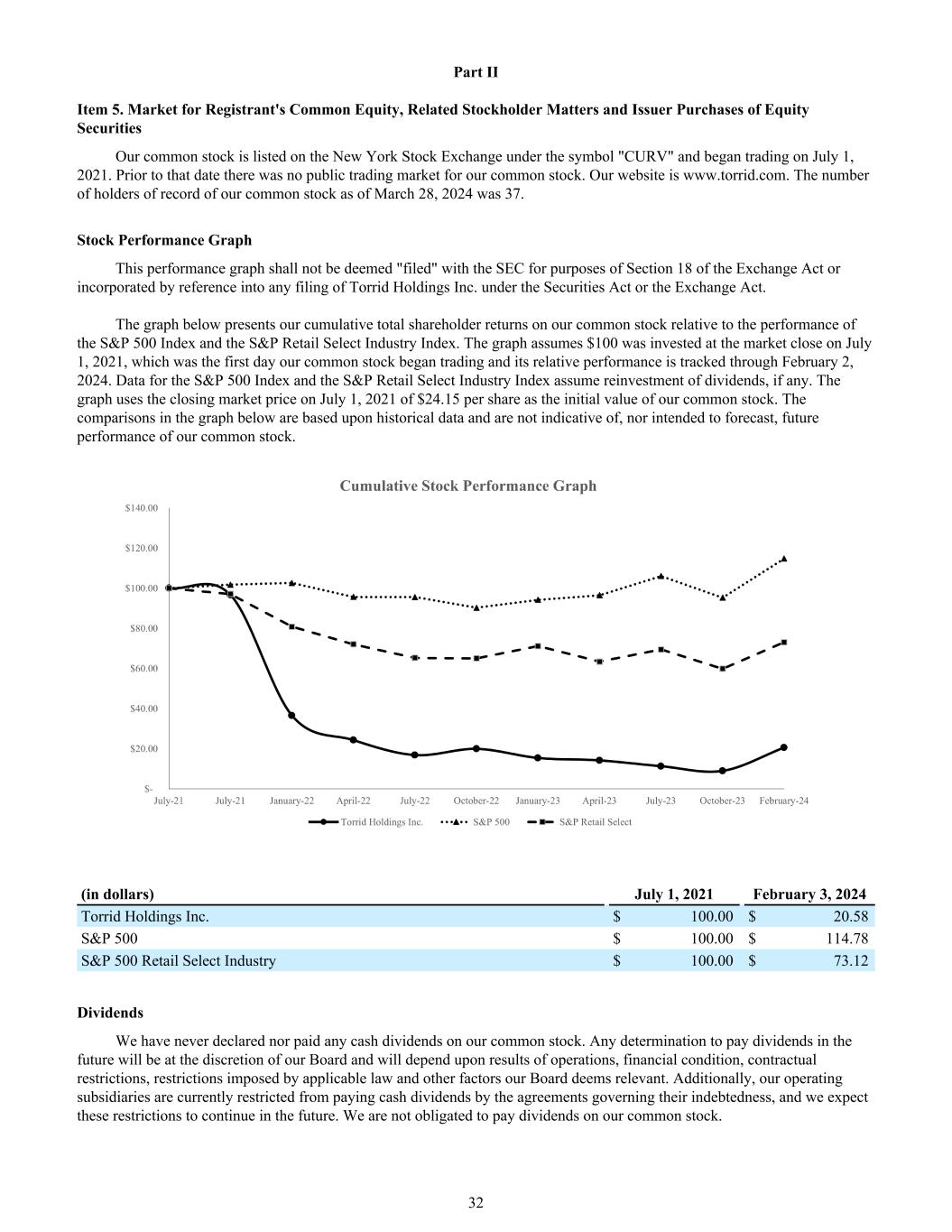 第二部分第5项。市场为注册人的普通股、相关股东事项和发行人购买股本证券我们的普通股在纽约证券交易所上市,代码为“CURV”,并于2021年7月1日开始交易。在此日期之前,我们的普通股没有公开交易市场。我们的网站是www.torrid.com。截至2024年3月28日,我国普通股的记录持有人数量为37。股票表现图表就《交易法》第18条而言,该表现图表不应被视为“已向SEC提交”,或通过引用并入Torrid Holdings Inc.根据《证券法》或《交易法》提交的任何文件中。下图显示了我们普通股的累计总股东回报率相对于标普 500指数和标普零售精选行业指数的表现。该图假设在2021年7月1日收盘时投资了100美元,这是我们的普通股开始交易的第一天,其相对表现被跟踪到2024年2月2日。标普 500指数和标普零售精选行业指数的数据假设有股息再投资。该图使用2021年7月1日的收盘价每股24.15美元作为我们普通股的初始价值。下图中的比较基于历史数据,并不表示,也不打算预测我们普通股的未来表现。(以美元计)2021年7月1日2024年2月3日Torrid Holdings Inc. 100.00美元20.58美元标普 500美元100.00美元114.78美元标普 500零售精选行业100.00美元73.12美元我们从未宣布或支付任何普通股现金股息。未来派发股息的任何决定将由董事会酌情决定,并将取决于经营业绩、财务状况、合同限制、适用法律施加的限制以及董事会认为相关的其他因素。此外,我们的运营子公司目前受到管理其债务的协议的限制,无法支付现金股息,我们预计这些限制将在未来继续。我们没有义务为我们的普通股支付股息。32