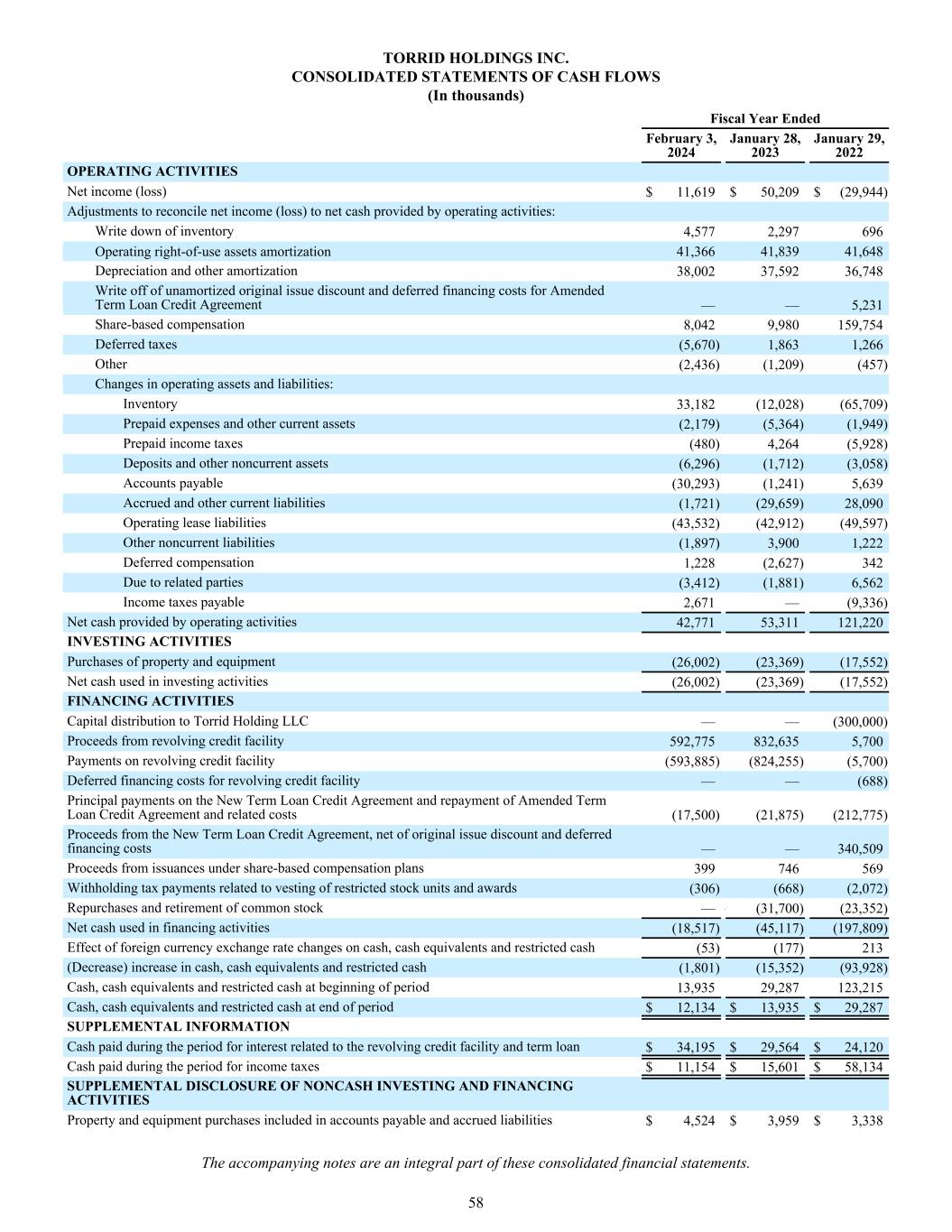 Torrid Holdings Inc.合并现金流量表(单位:千)截至2024年2月3日的财政年度2023年1月28日1月29日,2022年经营活动净收入(亏损)11,619美元50,209美元(29,944)调整净收益(亏损)与经营活动提供的现金净额:减记存货4,5772,297696经营使用权资产摊销41,36641,83941,648折旧和其他摊销38,00237,59236,748核销经修订的定期贷款信贷协议的未摊销原发行贴现和递延融资成本—— 5,231以股份为基础的补偿8,0429,980159,754递延税项(5,670)1,8631,266其他(2,436)(1,209)(457)经营资产和负债变动:存货33,182(12,028)(65,709)预付费用及其他流动资产(2,179)(5,364)(1,949)预付所得税(480)4,264(5,928)存款及其他非流动资产(6,296)(1,712)(3,058)应付账款(30,293)(1,241)5,639应计及其他流动负债(1,721)(29,659)28,090经营租赁负债(43,532)(42,912)(49,597)其他非流动负债(1,897)3,9001,222递延补偿款1,228(2,627)342应付关联方款项(3,412)(1,881)6,562应交所得税2,671 —(9,336)经营活动提供的现金净额42,77153,311121和设备(26,002)(23,369)(17,552)投资活动使用的现金净额(26,002)(23,369)(17,552)融资活动向Torrid Holding LLC的资本分配——(300,000)循环信贷融资收益592,775832,635,700循环信贷融资付款(593,885)(824,255)(5,700)循环信贷融资的递延融资成本——(688)新定期贷款信贷协议的本金支付和偿还经修订的定期贷款信贷协议及相关成本(17,500)(21,875)(212,775)新定期贷款信贷协议的收益,扣除原发行贴现和递延融资成本—— 340,509根据股份补偿计划发行的收益399746569与归属限制性股票单位和奖励相关的预扣税款(306)(668)(2,072)回购和报废普通股——(31,700)(23,352)筹资活动使用的现金净额(18,517)(45,117)(197,809)外币汇率变动对现金、现金等价物和限制性现金的影响(53)(177)213(减少)现金、现金等价物和限制性现金增加(1,801)(15,352)(93,928)期初现金、现金等价物和限制性现金13,93529,287123,215现金,期末现金等价物和受限现金12,134美元13,935美元29,287美元补充信息期间为与循环信贷额度和定期贷款相关的利息支付的现金34,195美元29,564美元24,120美元期间为所得税支付的现金11,154美元15,601美元58,134美元非现金投资和融资活动的补充披露包括在应付账款和应计负债中的财产和设备采购4,524美元3,959美元3,338美元附注是这些综合财务报表的组成部分。58