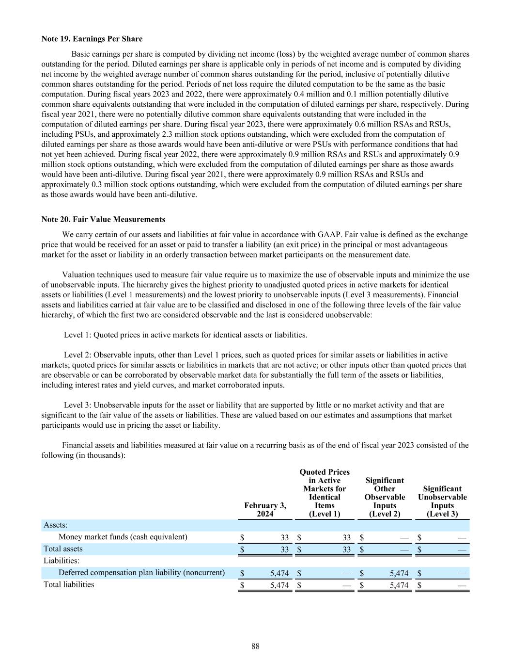 注19。每股收益基本每股收益的计算方法是用净收益(亏损)除以当期已发行普通股的加权平均数。稀释每股收益仅适用于净收益期间,计算方法是将净收益除以该期间已发行普通股的加权平均数,其中包括该期间已发行普通股的潜在稀释性。净损失期间要求稀释计算与基本计算相同。在2023财年和2022财年,分别有大约40万股和10万股潜在稀释性普通股等价物被纳入稀释每股收益的计算中。在2021财年,没有潜在的稀释性普通股等价物被纳入稀释每股收益的计算。2023财年期间,约有60万个RSA和RSU,包括PSU,以及约230万个未行使的股票期权,这些被排除在稀释每股收益的计算之外,因为这些奖励本来是反稀释的,或者是业绩条件尚未实现的PSU。2022财年期间,约有90万份RSA和RSU以及约90万份未行使的股票期权,由于这些奖励将具有反稀释性,因此被排除在稀释每股收益的计算之外。在2021财年,约有90万份RSA和RSU以及约30万份未行使的股票期权,这些都被排除在稀释每股收益的计算之外,因为这些奖励本来是反稀释的。注20。公允价值计量我们根据公认会计原则以公允价值计量我们的某些资产和负债。公允价值定义为在计量日市场参与者之间的有序交易中,资产或负债在主要或最有利的市场上将收到或支付的转移负债的交换价格(退出价格)。用于计量公允价值的估值技术要求我们最大限度地使用可观察输入值,并尽量减少使用不可观察输入值。层次结构给予相同资产或负债活跃市场中未经调整的报价最高优先级(第1级计量),给予不可观察输入值最低优先级(第3级计量)。以公允价值计量的金融资产和负债将在公允价值层次结构的以下三个层次中的一个进行分类和披露,其中前两个被认为是可观察的,最后一个被认为是不可观察的:第一层次:相同资产或负债在活跃市场中的报价。第2级:除第1级价格以外的可观察输入值,例如活跃市场中类似资产或负债的报价;不活跃市场中类似资产或负债的报价;或资产或负债基本上整个期限内可观察或可由可观察市场数据证实的报价以外的其他输入值,包括利率和收益率曲线,以及市场证实的输入值。第3级:由很少或没有市场活动支持且对资产或负债的公允价值具有重要意义的资产或负债的不可观察输入值。这些估值基于我们的估计和假设,市场参与者将在为资产或负债定价时使用这些估计和假设。截至2023财年末,以经常性基础以公允价值计量的金融资产和负债包括以下(单位:千):2024年2月3日相同项目活跃市场中的报价(第1级)重要的其他可观察投入(第2级)重要的不可观察投入(第3级)资产:货币市场基金(现金等价物)33美元33美元——总资产33美元—— 33美元——负债:递延补偿计划负债(非流动)5,474美元—— 5,474美元——总负债5,474美元—— 5,474美元—— 88