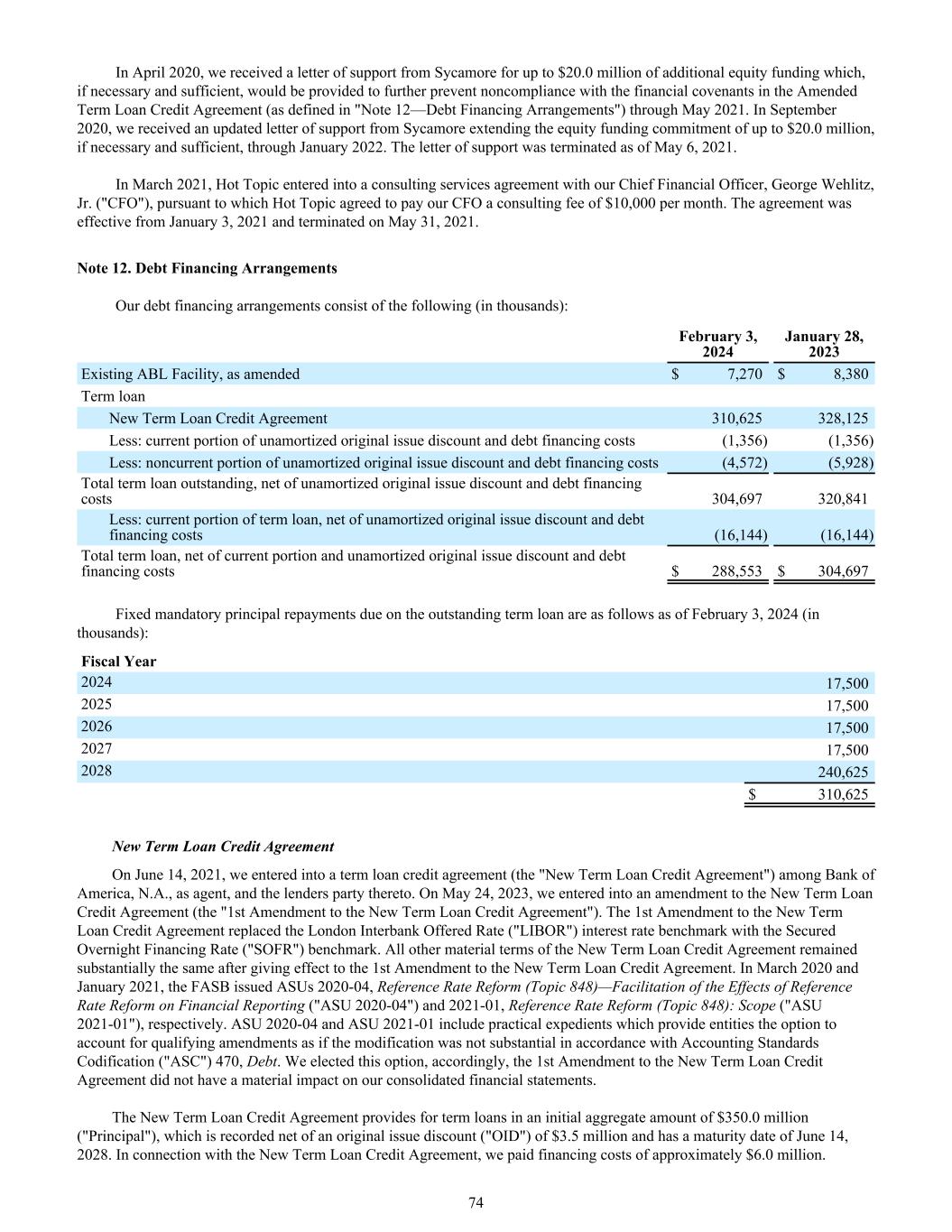 2020年4月,我们收到了Sycamore的一封支持函,要求提供高达2000万美元的额外股权融资,如有必要且足够,这些资金将用于在2021年5月之前进一步防止不遵守经修订的定期贷款信贷协议(定义见“附注12 ——债务融资安排”)中的财务契约。2020年9月,我们收到了来自Sycamore的更新支持函,如有必要且足够,将高达2000万美元的股权融资承诺延长至2022年1月。支持函于2021年5月6日终止。2021年3月,Hot Topic与我们的首席财务官George Wehlitz, Jr.(“CFO”)签订了咨询服务协议,据此,Hot Topic同意每月向我们的CFO支付10,000美元的咨询费。该协议自2021年1月3日起生效,并于2021年5月31日终止。注12。债务融资安排我们的债务融资安排包括以下内容(单位:千):2024年2月3日2023年1月28日现有ABL融资,经修订的7,270美元8,380美元定期贷款新定期贷款信贷协议310,625328,125减:未摊销的原始发行贴现和债务融资成本的流动部分(1,356)(1,356)减:未摊销的原始发行贴现和债务融资成本的非流动部分(4,572)(5,928)未偿还的定期贷款总额,扣除未摊销的原始发行贴现和债务融资成本304,697320,841减:定期贷款的流动部分,扣除未摊销的原始发行折扣和债务融资成本(16,144)(16,144)定期贷款总额,扣除流动部分和未摊销的原始发行折扣和债务融资成本288,553美元304,697美元截至2024年2月3日,未偿还定期贷款到期的固定强制性本金偿还如下(单位:千):财政年度2024 17,500202517,500202617,500202717,5002028240,625美元新的定期贷款信贷协议于2021年6月14日,我们作为代理人与美国银行签订了定期贷款信贷协议(“新的定期贷款信贷协议”),以及贷款方。于2023年5月24日,我们订立新定期贷款信贷协议的修订(“新定期贷款信贷协议的第1次修订”)。新的定期贷款信贷协议第1修正案以有担保隔夜融资利率(SOFR)基准取代伦敦银行间同业拆借利率(LIBOR)利率基准。新定期贷款信贷协议的所有其他重要条款在新定期贷款信贷协议第1次修订生效后基本保持不变。2020年3月和2021年1月,FASB分别发布了ASUS 2020-04,参考利率改革(主题848)—促进参考利率改革对财务报告的影响(“ASU 2020-04”)和2021-01,参考利率改革(主题848):范围(“ASU 2021-01”)。ASU2020-04和ASU2021-01包含实务变通,为实体提供了根据会计准则编纂(“ASC”)470对符合条件的修订进行会计处理的选择权,如同该修改不是实质性的一样,债务。我们选择了这一选项,因此,新定期贷款信贷协议的第1次修订对我们的合并财务报表没有重大影响。新的定期贷款信贷协议提供初始总额为3.50亿美元(“本金”)的定期贷款,扣除350万美元的原始发行折扣(“OID”)后入账,到期日为2028年6月14日。就新的定期贷款信贷协议而言,我们支付了约600万美元的融资成本。74
