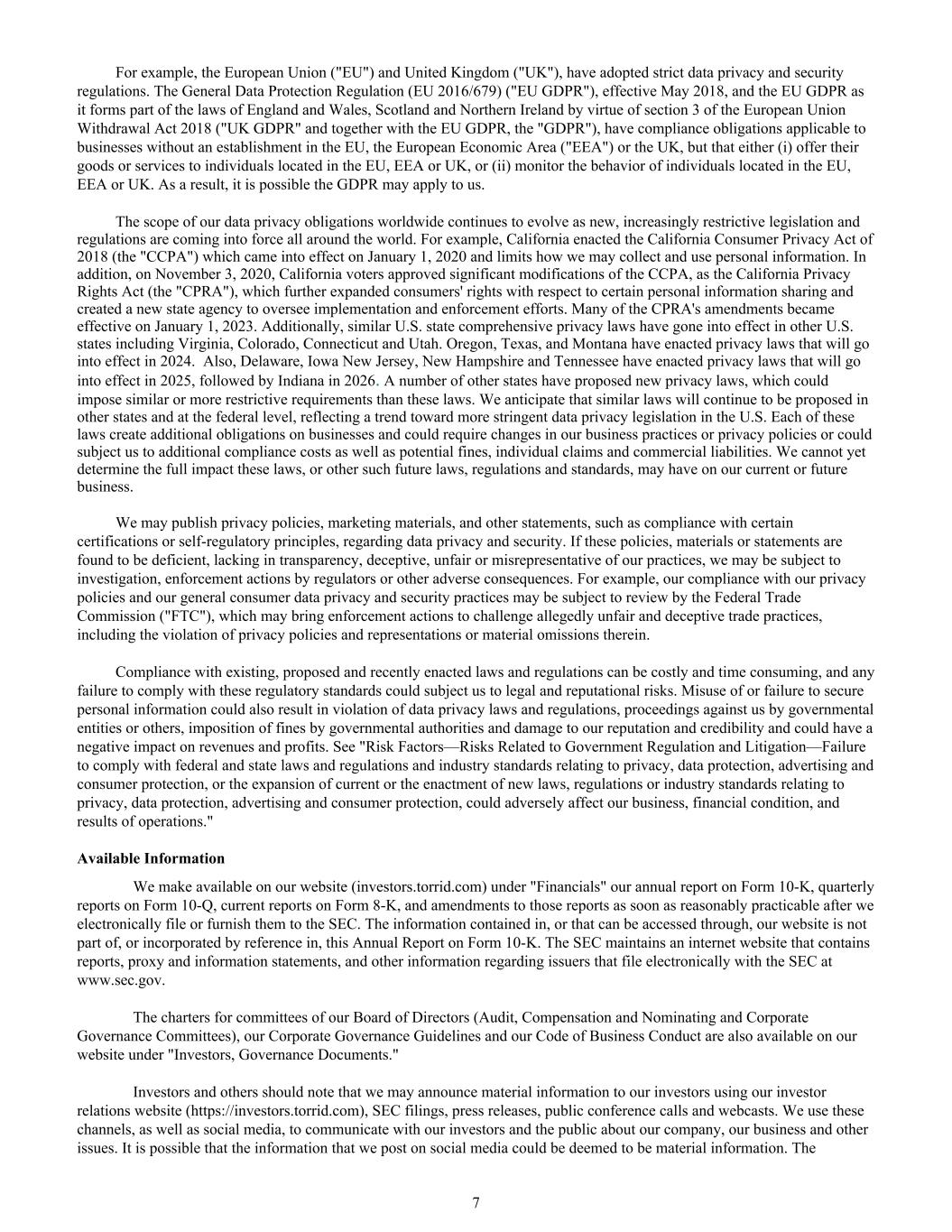 例如,欧盟(“EU”)和英国(“UK”),都采取了严格的数据隐私和安全规定。《通用数据保护条例》(EU 2016/679)(“EU GDPR”)于2018年5月生效,欧盟GDPR因其根据《2018年欧盟退出法案》(“英国GDPR”)第3条构成英格兰和威尔士、苏格兰和北爱尔兰法律的一部分,与欧盟GDPR一起,“GDPR”)具有适用于在欧盟、欧洲经济区(“EEA”)或英国没有机构的企业的合规义务,但(i)向位于欧盟、EEA或英国的个人提供其商品或服务,或(ii)监测位于欧盟、欧洲经济区或英国的个人的行为。因此,有可能GDPR可能适用于我们。随着新的、限制性越来越强的立法和法规在世界各地生效,我们在全球范围内的数据隐私义务范围不断演变。例如,加州颁布了2018年《加州消费者隐私法案》(CCPA),该法案于2020年1月1日生效,并限制了我们收集和使用个人信息的方式。此外,2020年11月3日,加州选民批准了对CCPA的重大修改,称为《加州隐私权法案》(“CPRA”),进一步扩大了消费者在某些个人信息共享方面的权利,并设立了一个新的州机构来监督实施和执法工作。CPRA的多项修正案于2023年1月1日生效。此外,类似的美国各州综合隐私法已在美国其他州生效,包括弗吉尼亚州、科罗拉多州、康涅狄格州和犹他州。俄勒冈州、得克萨斯州和蒙大拿州颁布了隐私法,将于2024年生效。此外,特拉华州、爱荷华州新泽西州、新罕布什尔州和田纳西州已颁布隐私法,将于2025年生效,随后印第安纳州将于2026年生效。其他一些州提出了新的隐私法,可能会施加与这些法律类似或更具限制性的要求。我们预计,类似的法律将继续在其他州和联邦一级提出,反映出美国数据隐私立法更加严格的趋势。这些法律中的每一项都对企业产生了额外的义务,可能要求改变我们的商业惯例或隐私政策,或者可能使我们承担额外的合规成本以及潜在的罚款、个人索赔和商业责任。我们尚无法确定这些法律或其他此类未来法律、法规和标准可能对我们当前或未来业务产生的全面影响。我们可能会发布有关数据隐私和安全的隐私政策、营销材料和其他声明,例如遵守某些认证或自律原则。如果这些政策、材料或声明被发现有缺陷、缺乏透明度、具有欺骗性、不公平或歪曲我们的做法,我们可能会受到监管机构的调查、执法行动或其他不良后果。例如,我们遵守我们的隐私政策以及我们的一般消费者数据隐私和安全做法可能会受到联邦贸易委员会(“FTC”)的审查,这可能会带来执法行动,以质疑所谓的不公平和欺骗性贸易做法,包括违反隐私政策和陈述或其中的重大遗漏。遵守现有的、提议的和最近颁布的法律和法规可能代价高昂且耗时,任何未能遵守这些监管标准的行为都可能使我们面临法律和声誉风险。滥用或未能保护个人信息还可能导致违反数据隐私法律法规、政府实体或其他人对我们提起诉讼、政府当局处以罚款以及损害我们的声誉和信誉,并可能对收入和利润产生负面影响。请参阅“风险因素——与政府监管和诉讼相关的风险——未能遵守与隐私、数据保护、广告和消费者保护相关的联邦和州法律法规和行业标准,或扩大现行或颁布与隐私、数据保护、广告和消费者保护相关的新法律、法规或行业标准,可能会对我们的业务、财务状况和经营业绩产生不利影响。”可用信息我们在我们的网站(investors.torrid.com)的“财务”项下提供我们的10-K表格年度报告、10-Q表格季度报告、8-K表格当前报告,以及在我们以电子方式向SEC提交或提供这些报告后在合理可行的范围内尽快对这些报告进行的修订。我们的网站中包含或可通过我们的网站访问的信息不属于,或通过引用并入, 这份关于10-K表格的年度报告。SEC维护着一个互联网网站,其中包含报告、代理和信息声明,以及有关以电子方式向SEC提交的发行人的其他信息,网址为www.sec.gov。我们的董事会委员会(审计、薪酬和提名委员会以及公司治理委员会)的章程、我们的公司治理准则和我们的商业行为准则也可在我们的网站“投资者、治理文件”下查阅。投资者和其他人应注意,我们可能会使用我们的投资者关系网站(https://investors.torrid.com)、SEC文件、新闻稿、公开电话会议和网络广播向我们的投资者公布重要信息。我们利用这些渠道,以及社交媒体,与我们的投资者和公众就我们的公司、我们的业务和其他问题进行沟通。我们在社交媒体上发布的信息有可能被视为重要信息。The 7