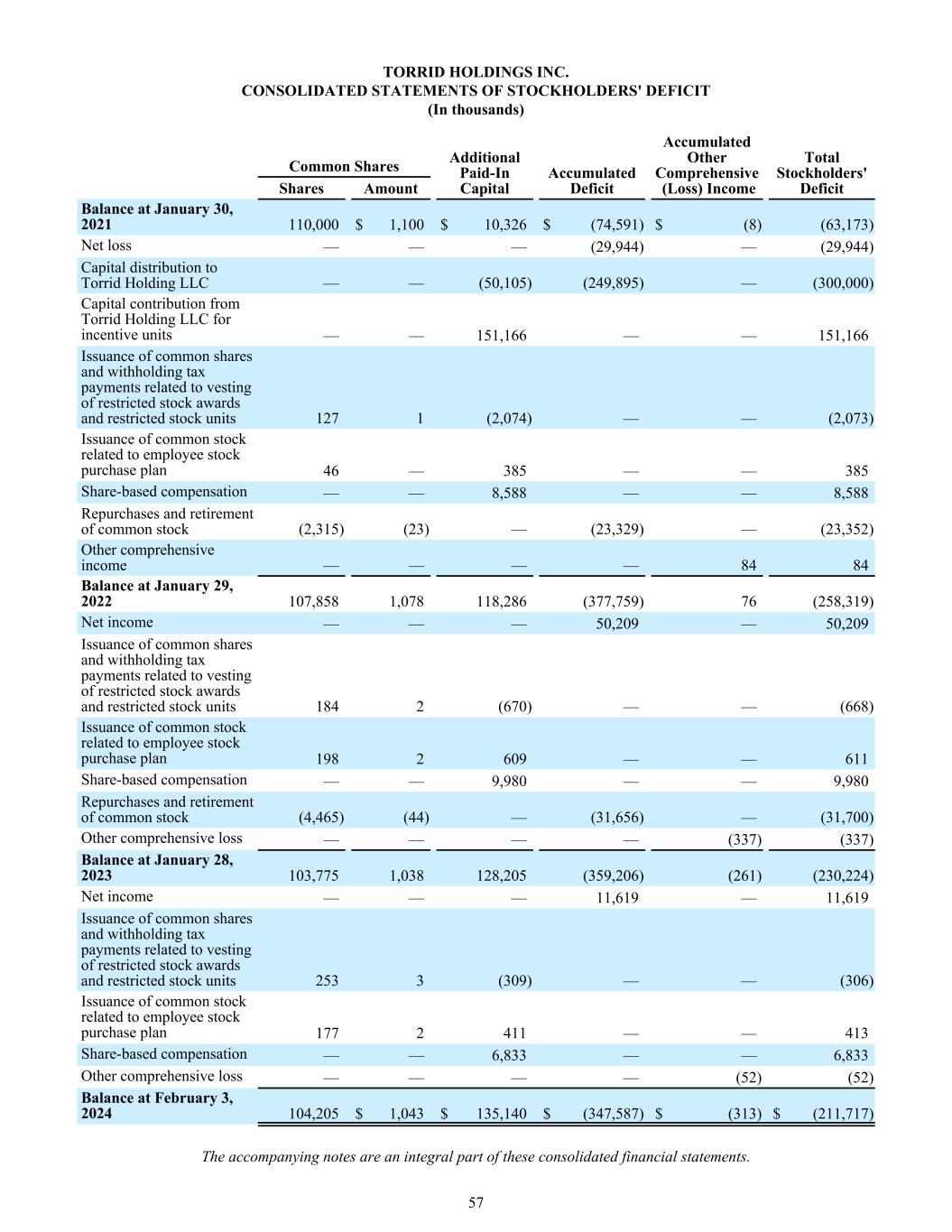 Torrid Holdings Inc.股东赤字合并报表(单位:千)普通股追加实收资本累计赤字累计其他综合(亏损)收益股东赤字总额1月30日余额,202110000 $ 1,100 $ 10,326 $(74,591)$(8)(63,173)净亏损————(29,944)——(29,944)对Torrid Holding LLC的资本分配——(50,105)(249,895)——(300,000)Torrid Holding LLC对激励单位的出资—— 151,166 —— 151,166发行普通股和与授予限制性股票奖励和限制性股票单位相关的预扣税款1271(2,074)——(2,073)发行与员工股票购买计划相关的普通股46 — 385 —— 385股份补偿—— 8,588 —— 8,588回购和退普通股(2,315)(23)—(23,329)—(23,352)其他综合收益———— 8484 1月29日余额,2022107,8581,078118,286(377,759)76(258,319)净收入———— 50,209 — 50,209发行普通股和与归属限制性股票奖励和限制性股票单位相关的预扣税款1842(670)——(668)发行与员工股票购买计划相关的普通股1982609 —— 611股份补偿—— 9,980 —— 9,980回购和报废普通股(4,465)(44)——(31,656)——(31,700)其他综合损失————(337)(337)1月28日余额,2023103,7751,038128,205(359,206)(261)(230,224)净收益———— 11,619 — 11,619发行普通股和与授予限制性股票奖励和限制性股票单位相关的预扣税款2533(309)——(306)发行与员工股票购买计划相关的普通股1772411 —— 413股份补偿——6,833 —— 6,833其他综合损失————(52)(52)2月3日余额,2024104,205美元1,043美元135,140美元(347,587)美元(313)美元(211,717)所附附注是这些综合财务报表的组成部分。57
