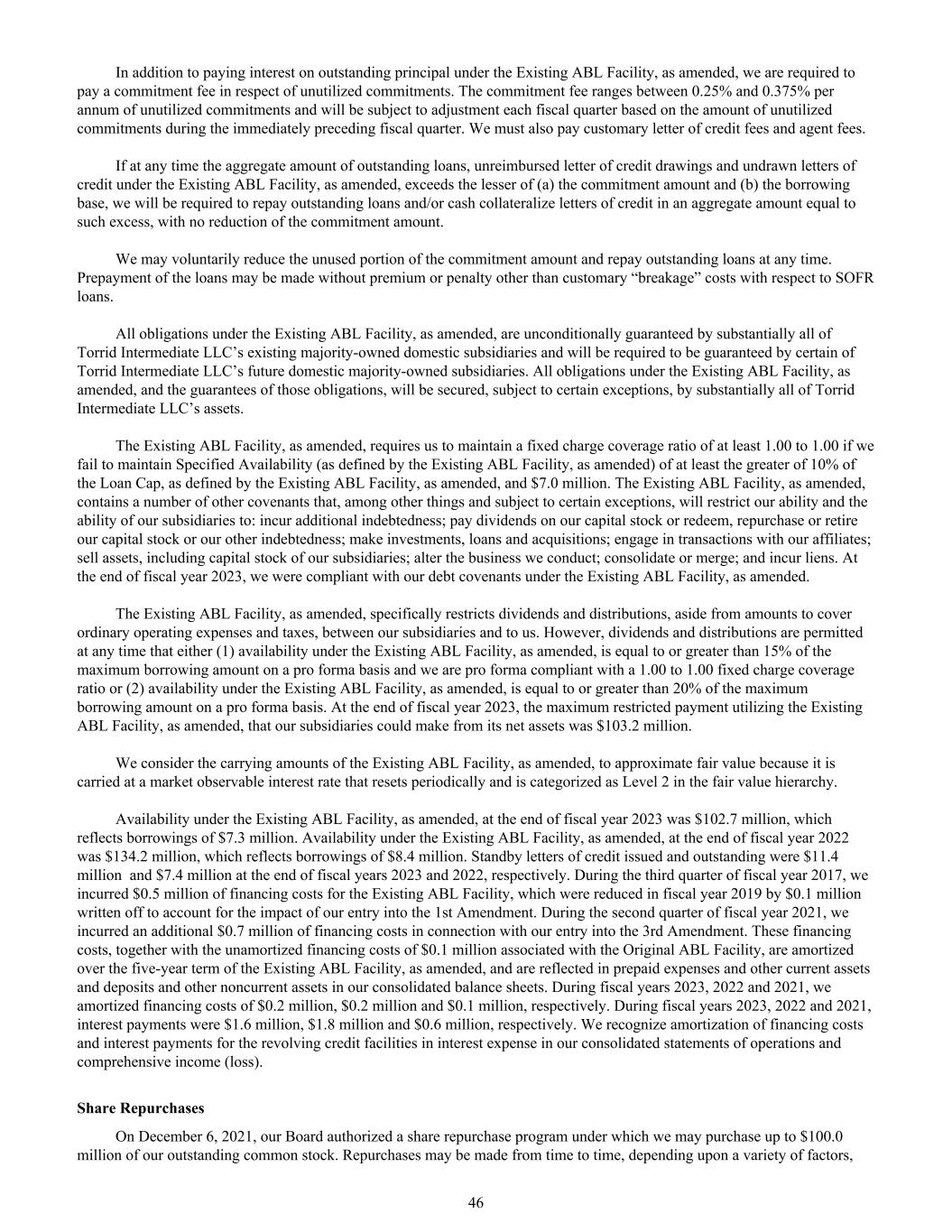 除了根据经修订的现有ABL融资支付未偿还本金的利息外,我们还需要就未使用的承诺支付承诺费。承诺费范围为每年0.25%至0.375%的未使用承诺,每个财政季度将根据上一个财政季度的未使用承诺金额进行调整。我们还必须支付惯常的信用证费用和代理费用。如果在任何时候,经修订的现有ABL融资下的未偿还贷款、未偿还信用证提款和未提取信用证的总额超过(a)承诺金额和(b)借款基数中的较低者,我们将被要求偿还未偿还贷款和/或现金抵押信用证,总额等于该超额部分,不减少承诺金额。我们可能会自愿减少承诺金额的未使用部分,并随时偿还未偿还的贷款。除SOFR贷款的惯常“破损”成本外,可以在没有溢价或罚款的情况下提前偿还贷款。经修订的现有ABL融资项下的所有义务由Torrid Intermediate LLC现有的几乎所有拥有多数股权的国内子公司提供无条件担保,并将被要求由Torrid Intermediate LLC未来的某些国内拥有多数股权的子公司提供担保。经修订的现有ABL融资下的所有债务以及这些债务的担保将由Torrid Intermediate LLC的几乎所有资产担保,但有某些例外情况。经修订的现有ABL融资要求,如果我们未能保持经修订的现有ABL融资所定义的贷款上限的10%和700万美元中的至少较高者的特定可用性(由经修订的现有ABL融资所定义),我们必须保持至少1.00至1.00的固定费用覆盖率。经修订的现有ABL融资包含若干其他契约,除其他外,除某些例外情况外,这些契约将限制我们和我们的子公司的能力:产生额外债务;支付我们股本的股息或赎回、回购或偿还我们的股本或我们的其他债务;进行投资、贷款和收购;与我们的关联公司进行交易;出售资产,包括我们子公司的股本;改变我们开展的业务;合并或合并;并产生留置权。在2023财年年底,我们遵守了经修订的现有ABL融资下的债务契约。经修订的现有ABL融资特别限制我们的子公司与我们之间的股息和分配,除了支付普通运营费用和税收的金额。然而,在任何时候允许股息和分配,即(1)经修订的现有ABL融资下的可用性等于或大于备考基础上最高借款金额的15%,而我们符合1.00至1.00固定费用覆盖率的备考标准,或(2)经修订的现有ABL融资下的可用性等于或大于备考基础上最高借款金额的20%。在2023财年末,我们的子公司可以利用经修订的现有ABL融资从其净资产中支付的最高限制性付款为1.032亿美元。我们认为经修订的现有ABL融资的账面金额接近公允价值,因为它按定期重置的市场可观察利率列账,在公允价值层次结构中被归类为第2级。截至2023财年末,经修订的现有ABL融资下的可用资金为1.027亿美元,反映了730万美元的借款。截至2022财年末,经修订的现有ABL融资下的可用资金为1.342亿美元,反映了840万美元的借款。截至2023和2022财年末,已签发和未结清的备用信用证分别为1140万美元和740万美元。在2017财年第三季度,我们为现有ABL融资产生了50万美元的融资成本,这些成本在2019财年减少了10万美元,以应对我们加入第1修正案的影响。在2021财年第二季度,我们因加入第3修正案而额外承担了70万美元的融资成本。这些融资成本,连同与原始ABL融资相关的未摊销融资成本10万美元,在经修订的现有ABL融资的五年期限内摊销,并在我们的综合资产负债表中反映在预付费用和其他流动资产以及存款和其他非流动资产中。在2023、2022和2021财年, 我们分别摊销了0.2百万美元、0.2百万美元和0.1百万美元的融资成本。在2023、2022和2021财年,利息支付分别为160万美元、180万美元和60万美元。我们在综合经营报表和综合收益(亏损)中的利息费用中确认融资成本和循环信贷额度的利息支付的摊销。股票回购2021年12月6日,我们的董事会批准了一项股票回购计划,根据该计划,我们可以购买最多1亿美元的已发行普通股。可能会不时进行回购,这取决于多种因素,46
