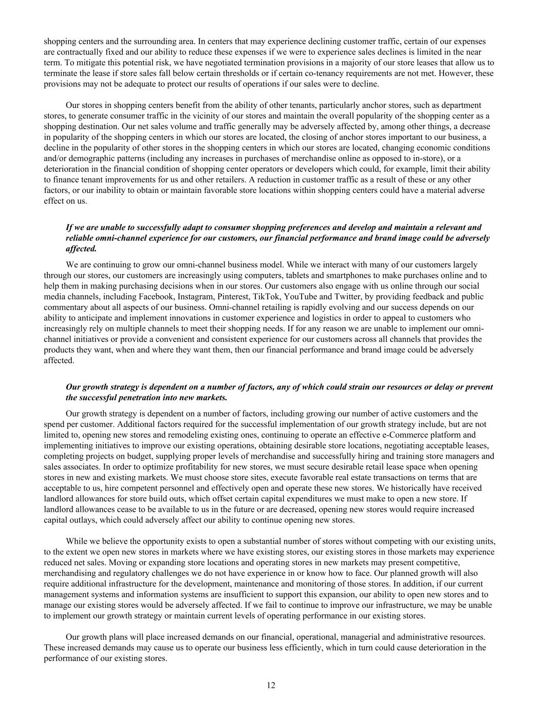 购物中心和周边地区。在可能遇到客户流量下降的中心,我们的某些费用是合同固定的,如果我们遇到销售下降,我们在短期内减少这些费用的能力是有限的。为减轻这一潜在风险,我们在大部分门店租约中协商了终止条款,允许我们在门店销售额低于某些门槛或某些合租要求未得到满足时终止租约。然而,如果我们的销售额下降,这些规定可能不足以保护我们的经营业绩。我们在购物中心的门店受益于其他租户的能力,特别是主力门店,例如百货公司,在我们的门店附近产生消费者流量,并保持购物中心作为购物目的地的整体热度。我们的净销售量和客流量一般可能受到不利影响,其中包括:我们的商店所在的购物中心受欢迎程度下降、对我们的业务很重要的主力商店关闭、我们的商店所在购物中心的其他商店受欢迎程度下降、不断变化的经济状况和/或人口模式(包括在线购买商品而不是在店内购买的任何增加),或购物中心运营商或开发商的财务状况恶化,这可能,例如,限制了他们为我们和其他零售商的租户改善提供资金的能力。由于这些或任何其他因素导致的客流量减少,或我们无法在购物中心内获得或维持有利的商店位置,可能会对我们产生重大不利影响。如果我们无法成功地适应消费者的购物偏好,并为我们的客户开发和维护相关和可靠的全渠道体验,我们的财务业绩和品牌形象可能会受到不利影响。我们正在继续发展我们的全渠道商业模式。虽然我们主要通过我们的商店与许多客户进行互动,但我们的客户越来越多地使用电脑、平板电脑和智能手机进行在线购买,并在我们的商店中帮助他们做出购买决定。我们的客户还通过我们的社交媒体渠道与我们在线互动,包括Facebook、Instagram、Pinterest、TikTok、YouTube和Twitter,通过就我们业务的各个方面提供反馈和公开评论。全渠道零售正在迅速发展,我们的成功取决于我们在客户体验和物流方面预测和实施创新的能力,以便吸引越来越依赖多种渠道来满足其购物需求的客户。如果出于任何原因,我们无法实施我们的全渠道举措,或无法在所有渠道为我们的客户提供方便和一致的体验,以提供他们想要的产品,无论何时何地,他们都想要这些产品,那么我们的财务业绩和品牌形象可能会受到不利影响。我们的增长战略取决于许多因素,其中任何一个因素都可能使我们的资源紧张,或推迟或阻止成功渗透到新市场。我们的增长战略取决于许多因素,包括增加我们的活跃客户数量和每位客户的支出。成功实施我们的增长战略所需的其他因素包括但不限于开设新门店和改造现有门店、继续运营有效的电子商务平台和实施举措以改善我们现有的运营、获得理想的门店位置、谈判可接受的租约、按预算完成项目、提供适当水平的商品以及成功雇用和培训门店经理和销售助理。为了优化新店的盈利能力,在新市场和现有市场开店时,我们必须确保理想的零售租赁空间。我们必须选择门店选址,以我们可以接受的条件执行有利的房地产交易,聘请有能力的人员并有效地开设和运营这些新门店。我们历史上曾收到过用于门店扩建的房东津贴,这抵消了我们必须为开设新门店而进行的某些资本支出。如果未来不再向我们提供房东津贴或减少,开设新店将需要增加资本支出,这可能会对我们继续开设新店的能力产生不利影响。虽然我们认为存在在不与现有单位竞争的情况下开设大量门店的机会,但就我们在拥有现有门店的市场开设新门店的程度而言,我们在这些市场的现有门店的净销售额可能会减少。移动或扩大门店位置并在新市场经营门店可能会呈现竞争性, 商品销售和监管挑战,我们没有经验,也不知道如何面对。我们计划的增长还将需要额外的基础设施来开发、维护和监测这些商店。此外,如果我们目前的管理系统和信息系统不足以支持这一扩张,我们开设新店和管理现有门店的能力将受到不利影响。如果我们未能继续改善我们的基础设施,我们可能无法实施我们的增长战略或在我们现有的门店中保持当前的经营业绩水平。我们的增长计划将对我们的财政、运营、管理和行政资源提出更高的要求。这些增加的需求可能导致我们的业务运营效率降低,进而可能导致我们现有门店的业绩恶化。12