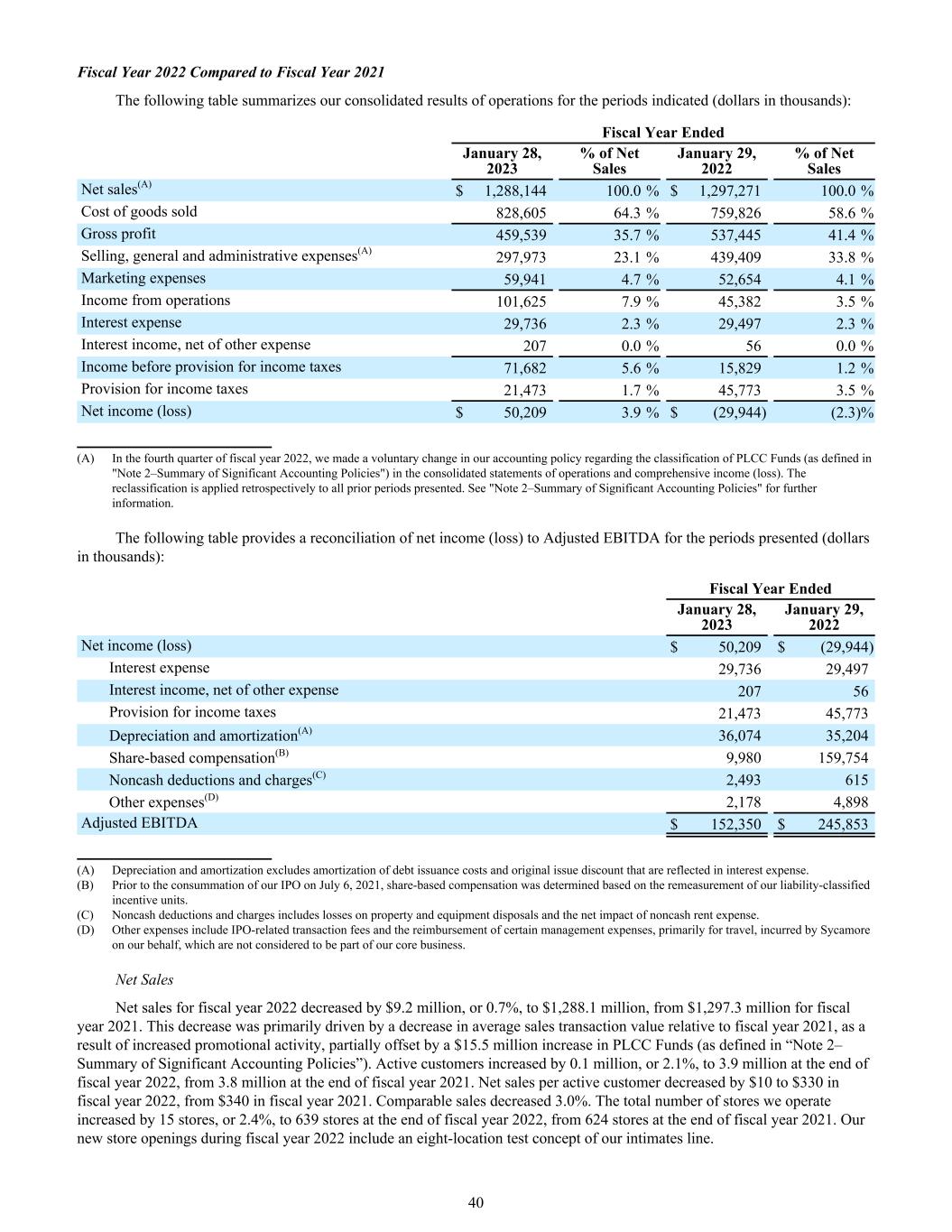 2022财年与2021财年相比,下表汇总了我们在所示期间的综合经营业绩(单位:千美元):截至2023年1月28日的财政年度净销售额的百分比2022年1月29日净销售额的百分比净销售额(a)1,288,144100.0% 1,297,271100.0%销售成本828,60564.3% 759,82658.6%毛利润459,53935.7% 537,44541.4%销售,一般及行政开支(A)297,97323.1% 439,40933.8%营销开支59,9414.7% 52,6544.1%营业收入101,6257.9% 45,3823.5%利息开支29,7362.3% 29,4972.3%利息收入,扣除其他开支2070.0% 56 0.0%所得税拨备前收入71,68 25.6% 15,8291.2%所得税拨备21,4731.7% 45,7733.5%净收入(亏损)$ 50,2093.9% $(29,944)(2.3)%(a)2022财年第四季度,我们自愿变更了关于PLCC基金(定义见“附注2 –重要会计政策摘要”)在综合经营和综合收益(亏损)报表中的分类的会计政策。重新分类追溯适用于所有以前呈报的期间。更多信息请参见“附注2 –重要会计政策摘要”。下表提供了所列期间净收入(亏损)与调整后EBITDA的对账(单位:千美元):截至2023年1月28日的财政年度2022年1月29日净收入(亏损)50,209美元(29,944)利息费用29,73629,497利息收入,扣除其他费用后的净额20756所得税准备金21,47345,773折旧和摊销(a)36,07435,204股份补偿(b)9,980159,754非现金扣除和费用(c)2,493615其他费用(d)2,1784,898调整后EBITDA 152,350美元245,853美元(a)折旧和摊销不包括反映在利息费用中的债务发行成本摊销和原始发行折扣。(b)在我们于2021年7月6日完成IPO之前,基于我们的负债分类激励单位的重新计量确定了基于股份的薪酬。(c)非现金扣除和费用包括财产和设备处置损失以及非现金租金费用的净影响。(d)其他费用包括与IPO相关的交易费用以及由Sycamore代表我们产生的某些管理费用的报销,主要是差旅费用,这些费用不被视为我们核心业务的一部分。净销售额2022财年的净销售额从2021财年的12.973亿美元下降920万美元,降幅为0.7%,至12.881亿美元。这一减少主要是由于促销活动增加导致平均销售交易额相对于2021财年减少,但被PLCC基金增加1550万美元(定义见“附注2 –重要会计政策摘要”)部分抵消。活跃客户从2021财年末的380万增加到2022财年末的390万,增幅为10万,增幅为2.1%。2022财年每位活跃客户的净销售额从2021财年的340美元下降10美元至330美元。可比销售额下降3.0%。我们经营的门店总数从2021财年末的624家增加到2022财年末的639家,增加了15家门店,增幅为2.4%。我们在2022财年的新店开业包括我们的intimates系列的八个地点测试概念。40