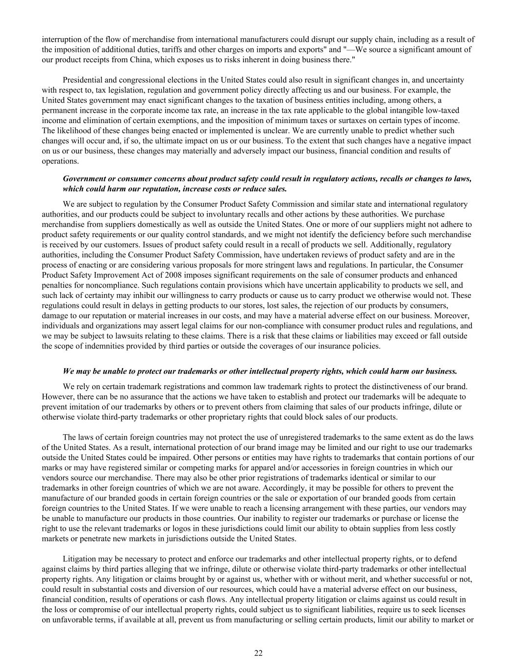 国际制造商的商品流中断可能会扰乱我们的供应链,包括对进出口征收额外关税、关税和其他费用”和“——我们从中国采购大量产品收据,这使我们面临在中国开展业务所固有的风险。”美国总统和国会选举也可能导致直接影响我们和我们业务的税收立法、法规和政府政策发生重大变化和不确定性。例如,美国政府可能会对商业实体的税收进行重大改革,其中包括永久提高企业所得税税率、提高适用于全球无形低税收入的税率并取消某些豁免,以及对某些类型的收入征收最低税或附加税。这些变化被颁布或实施的可能性尚不清楚。我们目前无法预测这些变化是否会发生,如果会,最终会对我们或我们的业务产生什么影响。如果这些变化对我们或我们的业务产生负面影响,这些变化可能会对我们的业务、财务状况和经营业绩产生重大不利影响。政府或消费者对产品安全的担忧可能会导致监管行动、召回或法律变更,这可能会损害我们的声誉、增加成本或减少销量。我们受到消费品安全委员会以及类似的州和国际监管机构的监管,我们的产品可能会受到这些机构的非自愿召回和其他行动。我们从美国国内和国外的供应商处采购商品。我们的一个或多个供应商可能不遵守产品安全要求或我们的质量控制标准,在客户收到此类商品之前,我们可能无法识别缺陷。产品安全问题可能会导致我们销售的产品被召回。此外,包括消费品安全委员会在内的监管部门已经对产品安全性进行了审查,并正在制定或正在考虑各种更严格的法律法规提案。特别是,2008年的《消费品安全改进法案》对消费品的销售提出了重大要求,并加强了对违规行为的处罚。此类法规包含的条款对我们销售的产品具有不确定的适用性,而这种缺乏确定性可能会抑制我们携带产品的意愿或导致我们携带我们原本不会携带的产品。这些规定可能导致延迟将产品送到我们的商店、失去销售、消费者拒绝我们的产品、损害我们的声誉或增加我们的成本,并可能对我们的业务产生重大不利影响。此外,个人和组织可能会就我们不遵守消费品规则和法规的行为提出法律索赔,我们可能会受到与这些索赔相关的诉讼。存在这些索赔或责任可能超过或超出第三方提供的赔偿范围或超出我们保单承保范围的风险。我们可能无法保护我们的商标或其他知识产权,这可能会损害我们的业务。我们依靠一定的商标注册和普通法商标权来保护我们品牌的独特性。然而,无法保证我们为建立和保护我们的商标而采取的行动将足以防止他人模仿我们的商标或防止他人声称我们的产品销售侵犯、稀释或以其他方式侵犯第三方商标或其他可能阻止我们产品销售的专有权利。某些外国的法律可能不会像美国的法律那样保护未注册商标的使用。因此,对我们品牌形象的国际保护可能会受到限制,我们在美国境外使用我们商标的权利可能会受到损害。其他个人或实体可能对包含我们部分标记的商标拥有权利,或者可能已在我们的供应商采购我们商品的外国注册了服装和/或配饰的类似或竞争标记。也可能存在我们不知道的其他外国与我们的商标相同或相似的其他商标的先前注册。因此,其他人可能会阻止在某些外国制造我们的品牌商品或从某些外国向美国销售或出口我们的品牌商品。如果我们无法与这些方面达成许可安排, 我们的供应商可能无法在这些国家生产我们的产品。我们无法在这些司法管辖区注册我们的商标或购买或许可使用相关商标或徽标的权利,这可能会限制我们从成本较低的市场获得供应或打入美国以外司法管辖区新市场的能力。诉讼可能是必要的,以保护和执行我们的商标和其他知识产权,或抗辩第三方声称我们侵犯、稀释或以其他方式侵犯第三方商标或其他知识产权的索赔。由我们或针对我们提起的任何诉讼或索赔,无论是否有根据,也无论是否成功,都可能导致大量成本和我们资源的转移,这可能对我们的业务、财务状况、经营业绩或现金流量产生重大不利影响。针对我们的任何知识产权诉讼或索赔可能导致我们的知识产权损失或受损,可能使我们承担重大责任,要求我们以不利的条款寻求许可,如果有的话,阻止我们制造或销售某些产品,限制我们的营销能力或22