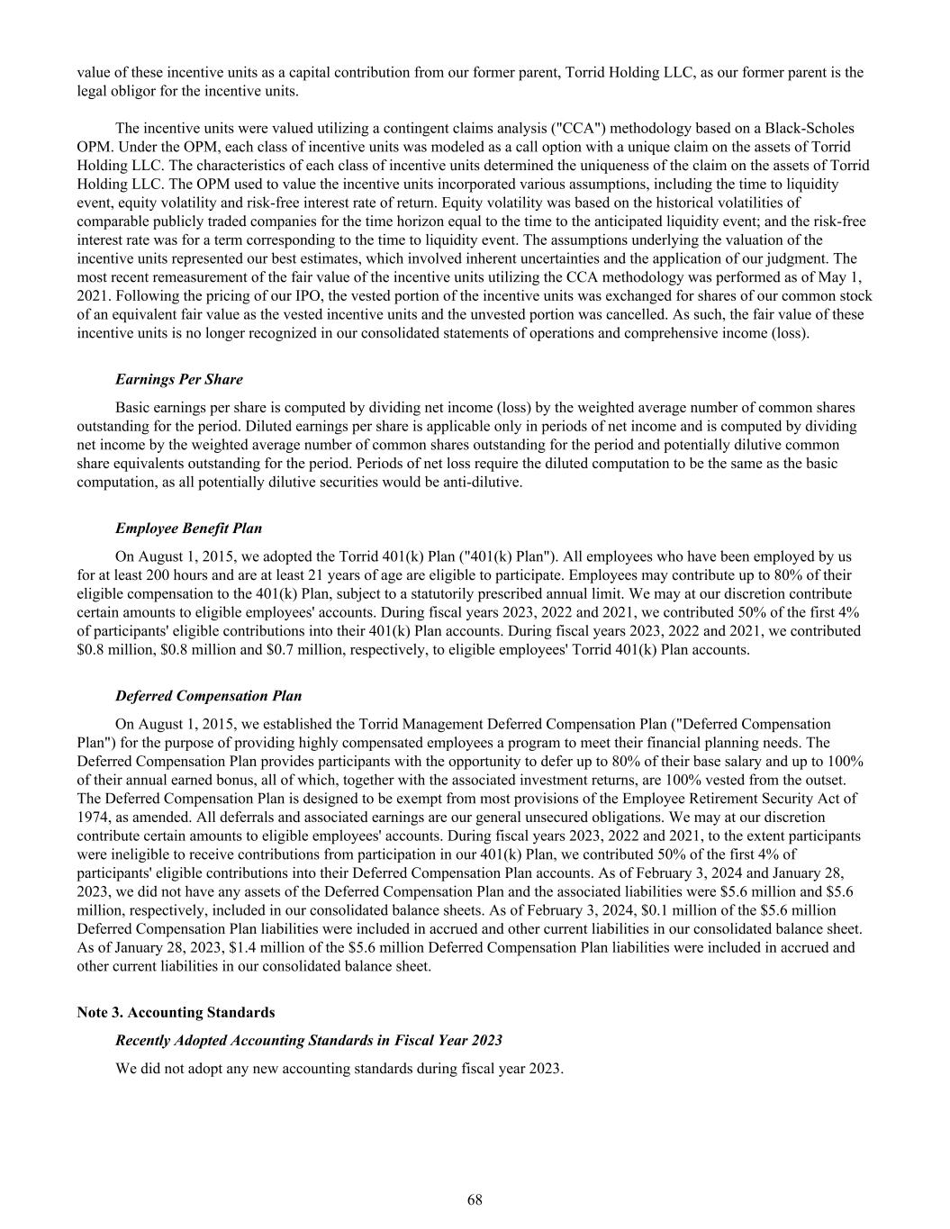 这些激励单位的价值作为我们的前母公司Torrid Holding LLC的出资,因为我们的前母公司是激励单位的法定义务人。使用基于Black-Scholes OPM的或有索赔分析(“CCA”)方法对激励单位进行估值。在OPM下,每一类激励单位都被建模为对Torrid Holding LLC的资产具有唯一索取权的看涨期权。每类激励单位的特点决定了Torrid Holding LLC资产债权的唯一性。用于对激励单位进行估值的OPM包含了各种假设,包括流动性事件发生的时间、股权波动性和无风险利率收益率。股票波动率是基于可比上市公司在与预期流动性事件发生时间相等的时间范围内的历史波动率;无风险利率是与流动性事件发生时间相对应的期限。激励单位估值背后的假设代表了我们的最佳估计,其中涉及内在的不确定性和我们判断的应用。采用CCA方法对激励单位公允价值进行的最近一次重新计量截至2021年5月1日。随着我们IPO的定价,激励单位的既得部分被交换为与既得激励单位同等公允价值的我们的普通股股票,未归属部分被注销。因此,这些激励单位的公允价值不再在我们的综合经营报表和综合收益(亏损)中确认。每股收益基本每股收益的计算方法是用净收益(亏损)除以当期已发行普通股的加权平均数。稀释每股收益仅适用于净收益期间,计算方法是将净收益除以该期间已发行普通股的加权平均数和该期间潜在稀释的已发行普通股等价物。净亏损期间要求稀释计算与基本计算相同,因为所有具有潜在稀释性的证券都将具有反稀释性。员工福利计划于2015年8月1日,我们采纳了Torrid 401(k)计划(“401(k)计划”)。所有受雇于我们至少200小时且年满21岁的员工都有资格参加。雇员最多可向401(k)计划提供其合格补偿的80%,但须遵守法定的年度限额。我们可能会酌情向符合条件的员工的账户提供一定数额的资金。在2023、2022和2021财年,我们将参与者前4%的合格供款的50%贡献到他们的401(k)计划账户中。在2023、2022和2021财年,我们分别为符合条件的员工的Torrid 401(k)计划账户贡献了0.8百万美元、0.8百万美元和0.7百万美元。递延薪酬计划2015年8月1日,我们建立了Torrid Management递延薪酬计划(“递延薪酬计划”),目的是为高薪酬员工提供满足其财务规划需求的方案。递延薪酬计划为参与者提供机会,最多可递延80%的基本工资和最多100%的年度已获奖金,所有这些,连同相关的投资回报,从一开始就100%归属。递延补偿计划旨在豁免经修订的1974年《雇员退休保障法》的大部分条款。所有递延和相关收益都是我们的一般无担保债务。我们可能会酌情向符合条件的员工账户提供一定金额的资金。在2023、2022和2021财年,如果参与者没有资格从参与我们的401(k)计划中获得供款,我们将参与者合格供款的前4%的50%贡献到他们的递延补偿计划账户中。截至2024年2月3日和2023年1月28日,我们没有递延补偿计划的任何资产,相关负债分别为560万美元和560万美元,包括在我们的综合资产负债表中。截至2024年2月3日,560万美元的递延薪酬计划负债中的10万美元被列入我们合并资产负债表的应计负债和其他流动负债。截至2023年1月28日,在560万美元的递延薪酬计划负债中,有140万美元包含在我们合并资产负债表的应计负债和其他流动负债中。注3。会计准则最近在2023财年采用了会计准则我们在2023财年没有采用任何新的会计准则。68