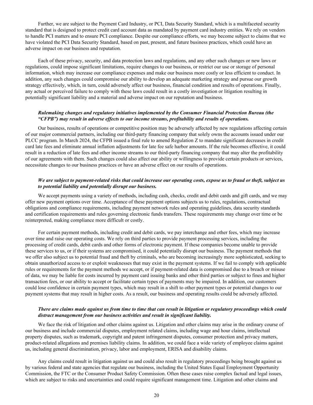 此外,我们还受制于支付卡行业,即PCI数据安全标准,这是一个多方面的安全标准,旨在保护支付卡行业实体规定的信用卡账户数据。我们依靠供应商来处理PCI事项,并确保PCI合规。尽管我们做出了合规努力,但基于过去、现在和未来的业务实践,我们可能会成为违反PCI数据安全标准的索赔对象,这可能会对我们的业务和声誉产生不利影响。这些隐私、安全和数据保护法律法规中的每一项,以及任何其他此类变更或新的法律或法规,都可能施加重大限制,要求对我们的业务进行变更,或限制我们使用或存储个人信息,这可能会增加我们的合规费用,并使我们的业务开展成本更高或效率更低。此外,任何此类变化都可能损害我们制定适当营销战略和有效追求增长战略的能力,进而可能对我们的业务、财务状况和经营业绩产生不利影响。最后,任何实际或被认为未能遵守这些法律的行为都可能导致代价高昂的调查或诉讼,从而导致潜在的重大责任,并对我们的声誉和业务产生重大不利影响。消费者金融保护局(“CFPB”)实施的规则制定变更和监管举措可能会对我们的收入流、盈利能力和经营业绩产生不利影响。我们的业务、经营业绩或竞争地位可能会受到影响我们某些主要商业合作伙伴的新法规的不利影响,包括我们的第三方融资公司,该公司仅拥有根据我们的PLCC计划发行的账户。2024年3月,CFPB发布了修订条例Z的最终规则,要求大幅降低信用卡滞纳金,并取消对滞纳金安全港金额的年度通胀调整。如果该规则生效,可能会导致我们的第三方融资公司的滞纳金和其他收入流减少,这可能会改变我们与他们达成的协议的盈利能力。这些变化也可能影响我们提供某些产品或服务的能力或意愿,需要改变我们的业务做法或对我们的经营业绩产生不利影响。我们面临与支付相关的风险,这些风险可能会增加我们的运营成本,使我们面临欺诈或盗窃,使我们承担潜在的责任,并可能扰乱我们的业务。我们接受使用多种方式付款,包括现金、支票、信用卡和借记卡以及礼品卡,随着时间的推移,我们可能会提供新的付款方式。接受这些支付选项使我们须遵守规则、法规、合同义务和合规要求,包括支付网络规则和操作指南、数据安全标准和认证要求以及管理电子资金转账的规则。这些要求可能会随着时间而改变或被重新解释,从而使合规变得更加困难或成本更高。对于某些支付方式,包括信用卡和借记卡,我们支付交换和其他费用,这可能会随着时间的推移而增加,并提高我们的运营成本。我们依赖第三方提供支付处理服务,包括信用卡、借记卡和其他形式的电子支付的处理。如果这些公司变得无法向我们提供这些服务,或者他们的系统受到损害,这可能会扰乱我们的业务。我们提供的支付方式也使我们受到犯罪分子的潜在欺诈和盗窃,他们正变得越来越复杂,试图获得未经授权的访问权限或利用支付系统中可能存在的弱点。如果我们未能遵守我们接受的支付方式的适用规则或要求,或者如果支付相关数据因数据泄露或滥用而受到损害,我们可能会对支付卡发卡银行和其他第三方产生的成本承担责任或受到罚款和更高的交易费用,或者我们接受或促进某些类型的支付的能力可能会受到损害。此外,我们的客户可能会对某些支付类型失去信心,这可能会导致转向其他支付类型或我们的支付系统的潜在变化,从而可能导致更高的成本。因此,我们的业务和经营业绩可能会受到不利影响。不时有针对我们的索赔可能导致诉讼或监管程序,这可能会分散管理层对我们业务活动的注意力并导致重大责任。我们面临对我们的诉讼和其他索赔的风险。诉讼和其他索赔可能会在我们的日常业务过程中产生,包括商业纠纷、与雇佣相关的索赔,包括工资和工时索赔, 知识产权纠纷,如商标、版权和专利侵权纠纷、消费者保护和隐私事项、产品相关指控和房地责任索赔等。此外,我们可能面临各种各样的针对我们的员工索赔,包括一般歧视、隐私、劳动和就业、ERISA和残疾索赔。任何索赔都可能导致对我们的诉讼,也可能导致监管我们业务的各种联邦和州机构对我们提起监管诉讼,包括美国平等就业机会委员会、FTC或消费品安全委员会。这些案件通常会引发复杂的事实和法律问题,这些问题会受到风险和不确定性的影响,可能需要大量的管理时间。诉讼和其他索赔和20