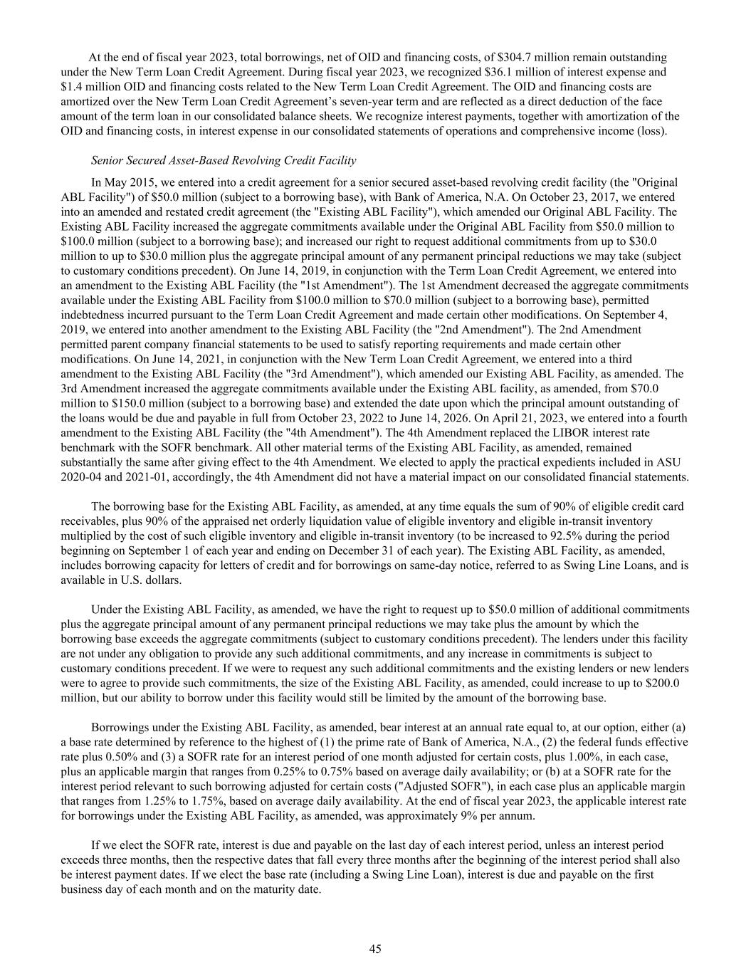 截至2023财年年底,根据新的定期贷款信贷协议,未偿还的借款总额(扣除OID和融资成本)为3.047亿美元。在2023财年,我们确认了3610万美元的利息支出以及140万美元的OID和与新定期贷款信贷协议相关的融资成本。OID和融资成本在新的定期贷款信贷协议的七年期限内摊销,并在我们的综合资产负债表中反映为直接扣除定期贷款的面值。我们在我们的综合经营报表和综合收益(亏损)中将利息支付以及OID和融资成本的摊销确认为利息费用。2015年5月,我们与美国银行(Bank of America,N.A.)就5000万美元(取决于借款基础)的高级担保资产基础循环信贷融资(“原始ABL融资”)签订了信贷协议。2017年10月23日,我们与美国银行(Bank of America,N.A.)签订了经修订和重述的信贷协议(“现有ABL融资”),该协议对我们的原始ABL融资进行了修订。现有ABL融资将原始ABL融资下可用的承付款总额从5000万美元增加到1亿美元(取决于借款基础);并将我们要求追加承付款的权利从最多3000万美元增加到最多3000万美元,外加我们可能采取的任何永久性本金削减的本金总额(取决于惯例先决条件)。于2019年6月14日,连同定期贷款信贷协议,我们订立了对现有ABL融资的修订(“第1次修订”)。第1修正案将现有ABL融资下可用的承付款总额从1亿美元降至7000万美元(取决于借款基础),允许根据定期贷款信贷协议产生的债务,并进行了某些其他修改。于2019年9月4日,我们订立另一项对现有ABL融资的修订(「第2次修订」)。第二修正案允许使用母公司财务报表来满足报告要求,并进行了某些其他修改。2021年6月14日,结合新的定期贷款信贷协议,我们对现有ABL融资进行了第三次修订(“第三次修订”),修订了经修订的现有ABL融资。第3次修正将经修正的现有ABL贷款下的可用承诺总额从7000万美元增加到1.50亿美元(取决于借款基础),并将未偿还贷款本金到期并全额支付的日期从2022年10月23日延长至2026年6月14日。2023年4月21日,我们对现有ABL融资进行了第四次修订(“第四次修订”)。第四修正案以SOFR基准取代LIBOR利率基准。经修订的现有ABL融资的所有其他重要条款在第4次修订生效后基本保持不变。我们选择应用ASU 2020-04和2021-01中包含的实务变通,因此,第4次修订对我们的合并财务报表没有重大影响。经修订的现有ABL融资的借款基数在任何时候等于符合条件的信用卡应收账款的90%的总和,加上符合条件的库存和符合条件的在途库存的评估净有序清算价值的90%乘以该等符合条件的库存和符合条件的在途库存的成本(在每年9月1日开始至每年12月31日结束的期间增加至92.5%)。经修订的现有ABL贷款包括信用证和同日通知借款的借款能力,称为周转额度贷款,以美元提供。根据经修订的现有ABL融资,我们有权要求最多5000万美元的额外承诺加上我们可能采取的任何永久性本金削减的本金总额加上借款基础超过承诺总额的金额(根据惯例先决条件)。该融资下的贷方没有任何义务提供任何此类额外承诺,任何增加的承诺均受惯例先决条件的约束。如果我们要求任何此类额外承诺,而现有贷方或新贷方同意提供此类承诺,经修订的现有ABL融资规模可能会增加至多2亿美元,但我们在该融资下借款的能力仍将受到借款基础金额的限制。经修订的现有ABL贷款下的借款按年利率计息,我们可以选择(a)参考美国银行最优惠利率(1)中的最高者确定的基准利率, 不适用,(2)联邦基金有效利率加0.50%和(3)一个月的利息期SOFR利率,按某些成本调整,在每种情况下加1.00%,加上基于平均每日可用性的范围为0.25%至0.75%的适用保证金;或(b)按针对某些成本调整的此类借款相关利息期的SOFR利率(“调整后SOFR”),在每种情况下加上基于平均每日可用性的范围为1.25%至1.75%的适用保证金。截至2023财年末,经修订的现有ABL融资下借款的适用利率约为每年9%。如果我们选择SOFR利率,利息在每个利息期的最后一天到期支付,除非一个利息期超过三个月,那么在利息期开始后每三个月下降的相应日期也应是付息日。如果我们选择基准利率(包括周转额度贷款),利息在每个月的第一个工作日和到期日到期支付。45
