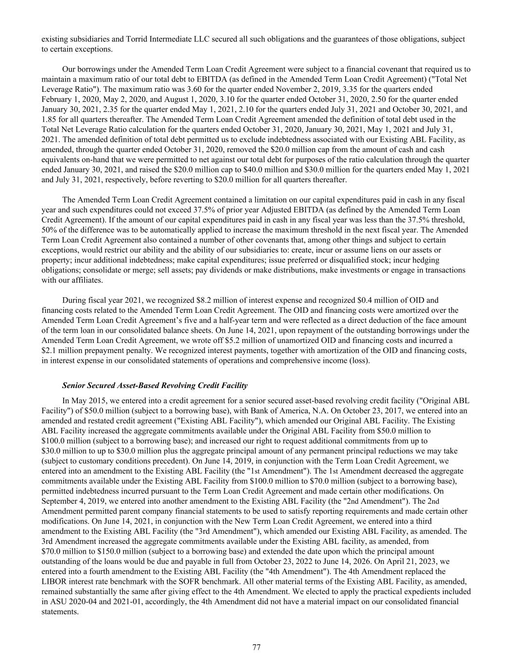 现有子公司和Torrid Intermediate LLC为所有此类义务和这些义务的担保提供担保,但有某些例外情况。我们在经修订的定期贷款信贷协议下的借款受一项财务契约的约束,该契约要求我们维持总债务与EBITDA的最高比率(定义见经修订的定期贷款信贷协议)(“总净杠杆比率”)。截至2019年11月2日止季度的最高比率为3.60,截至2020年2月1日、2020年5月2日及2020年8月1日止季度的最高比率为3.35,截至2020年10月31日止季度的最高比率为3.10,截至2021年1月30日止季度的最高比率为2.50,截至2021年5月1日止季度的最高比率为2.35,截至2021年7月31日及2021年10月30日止季度的最高比率为2.10,其后所有季度的最高比率为1.85。经修订的定期贷款信贷协议修订了截至2020年10月31日、2021年1月30日、2021年5月1日和2021年7月31日止季度的总净杠杆率计算中使用的总债务定义。修订后的总债务定义允许我们在截至2020年10月31日的季度之前排除与经修订的现有ABL融资相关的债务,取消了手头现金和现金等价物金额中的2000万美元上限,我们被允许在截至2021年1月30日的季度之前为比率计算的目的从我们的总债务中扣除,并将截至2021年5月1日和2021年7月31日的季度的2000万美元上限分别提高到4000万美元和3000万美元,之后所有季度恢复到2000万美元。经修订的定期贷款信贷协议包含对我们在任何财政年度以现金支付的资本支出的限制,此类支出不得超过上一年调整后EBITDA(由经修订的定期贷款信贷协议定义)的37.5%。如果我们在任何一个财政年度以现金支付的资本支出金额低于37.5%的门槛,则将自动应用差额的50%,以在下一个财政年度提高最高门槛。经修订的定期贷款信贷协议还包含若干其他契约,除其他外,除某些例外情况外,这些契约将限制我们和我们的子公司的能力:对我们的资产或财产创建、产生或承担留置权;产生额外债务;进行资本支出;发行优先股或不合格股票;产生对冲义务;合并或合并;出售资产;支付股息或进行分配、进行投资或与我们的关联公司进行交易。在2021财年,我们确认了820万美元的利息支出,并确认了与经修订的定期贷款信贷协议相关的40万美元的OID和融资成本。OID和融资成本在经修订的定期贷款信贷协议的五年半期限内摊销,并在我们的综合资产负债表中反映为直接扣除定期贷款的面值。2021年6月14日,在根据经修订的定期贷款信贷协议偿还未偿还借款后,我们注销了520万美元的未摊销OID和融资成本,并产生了210万美元的提前还款罚款。我们在综合经营报表和综合收益(亏损)中将利息支付以及OID和融资成本的摊销确认为利息费用。2015年5月,我们与美国银行(Bank of America,N.A.)就5000万美元(取决于借款基础)的高级担保资产基础循环信贷融资(“原始ABL融资”)签订了信贷协议。2017年10月23日,我们与美国银行(Bank of America,N.A.)签订了经修订和重述的信贷协议(“现有ABL融资”),该协议对我们的原始ABL融资进行了修订。现有ABL融资将原始ABL融资下可用的承付款总额从5000万美元增加到1亿美元(取决于借款基础);并将我们要求追加承付款的权利从最多3000万美元增加到最多3000万美元,外加我们可能采取的任何永久性本金削减的本金总额(取决于惯例先决条件)。于2019年6月14日,连同定期贷款信贷协议,我们订立了对现有ABL融资的修订(“第1次修订”)。第1修正案将现有ABL融资下可用的承付款总额从1亿美元降至7000万美元(取决于借款基础),允许根据定期贷款信贷协议产生的债务,并进行了某些其他修改。于2019年9月4日,我们订立另一项对现有ABL融资的修订(「第2次修订」)。第二修正案允许使用母公司财务报表来满足报告要求,并进行了某些其他修改。于2021年6月14日,连同新定期贷款信贷协议, 我们对现有ABL融资进行了第三次修订(“第三次修订”),该修订对我们现有的ABL融资进行了修订。第3次修正将经修正的现有ABL贷款下的可用承诺总额从7000万美元增加到1.50亿美元(取决于借款基础),并将未偿还贷款本金到期并全额支付的日期从2022年10月23日延长至2026年6月14日。2023年4月21日,我们对现有ABL融资进行了第四次修订(“第四次修订”)。第四修正案以SOFR基准取代LIBOR利率基准。经修订的现有ABL融资的所有其他重要条款在第4次修订生效后基本保持不变。我们选择应用ASU 2020-04和2021-01中包含的实务变通,因此,第4次修订对我们的合并财务报表没有重大影响。77