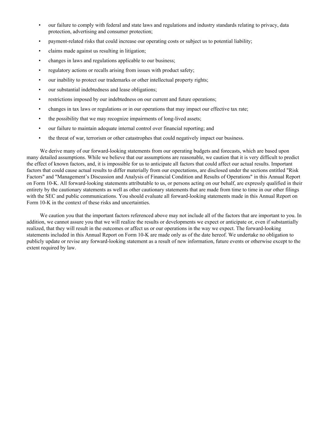 •我们未能遵守与隐私、数据保护、广告和消费者保护;•可能增加我们的运营成本或使我们承担潜在责任的与支付相关的风险;•对我们提出索赔导致诉讼;•适用于我们业务的法律法规发生变化;•因产品安全问题而产生的监管行动或召回;•我们无法保护我们的商标或其他知识产权;•我们的巨额债务和租赁义务;•我们的债务对我们当前和未来的运营施加的限制;•税法或法规或我们的运营发生变化这可能会影响我们的有效税率;•我们可能会确认长期资产的减值;•我们未能保持对财务报告的充分内部控制;以及•可能对我们的业务产生负面影响的战争、恐怖主义或其他灾难的威胁。我们的许多前瞻性陈述来自我们的运营预算和预测,它们基于许多详细的假设。虽然我们认为我们的假设是合理的,但我们警告说,很难预测已知因素的影响,而且,我们不可能预测所有可能影响我们实际结果的因素。可能导致实际结果与我们的预期存在重大差异的重要因素,在本年度报告10-K表格中题为“风险因素”和“管理层对财务状况和经营业绩的讨论和分析”的章节中披露。所有可归属于我们或代表我们行事的人的前瞻性陈述,都完全受到我们向SEC提交的其他文件和公开通讯中不时做出的警示性陈述以及其他警示性陈述的明确限定。您应该在这些风险和不确定性的背景下评估本年度报告中关于表格10-K的所有前瞻性陈述。我们提醒您,上面提到的重要因素可能并不包括对您很重要的所有因素。此外,我们无法向您保证,我们将实现我们预期或预期的结果或发展,或者,即使实质上已实现,它们将导致结果或以我们预期的方式影响我们或我们的运营。本年度报告中包含的10-K表格前瞻性陈述仅在本报告发布之日作出。除法律要求的范围外,我们不承担因新信息、未来事件或其他原因而公开更新或修改任何前瞻性陈述的义务。