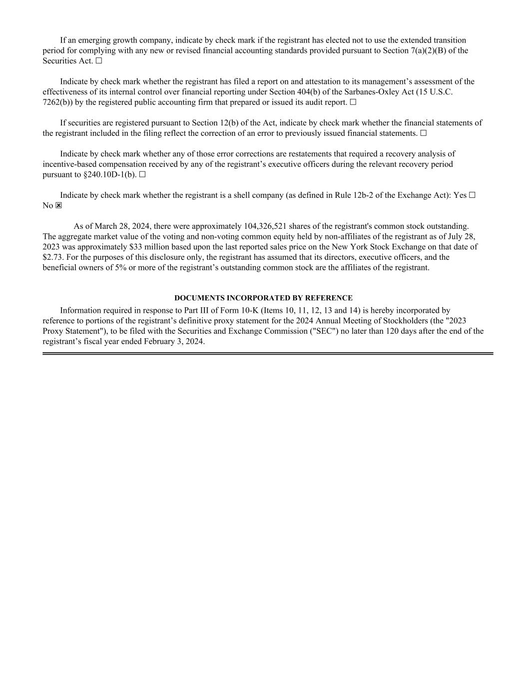 如果是新兴成长型公司,请用复选标记表明注册人是否选择不使用延长的过渡期来遵守根据《证券法》第7(a)(2)(b)节规定的任何新的或修订的财务会计准则。☐用复选标记表明注册人是否已就其管理层对编制或出具审计报告的注册会计师事务所根据《萨班斯-奥克斯利法案》(15 U.S.C.7262(b))第404(b)节对其财务报告内部控制有效性的评估提交报告和证明。如果证券是根据该法第12(b)节进行登记的,请用复选标记表明备案中包含的登记人的财务报表是否反映了对先前发布的财务报表的更正错误。☐用复选标记表明这些错误更正中是否有任何重述需要对注册人的任何执行官根据§ 240.10D-1(b)在相关恢复期间收到的基于激励的薪酬进行恢复分析。☐用复选标记表明注册人是否为壳公司(定义见《交易法》第12b-2条):是☐没有截至2024年3月28日,注册人的已发行普通股约为104,326,521股。截至2023年7月28日,注册人的非关联公司持有的有投票权和无投票权的普通股的总市值约为3300万美元,基于该日期纽约证券交易所上一次报告的销售价格为2.73美元。仅为本披露的目的,注册人假定其董事、执行官以及注册人已发行普通股5%或以上的实益拥有人是注册人的关联公司。根据表格10-K第III部分(第10、11、12、13和14项)要求的引用信息并入的文件,特此通过引用注册人关于2024年年度股东大会的最终代理声明(“2023年代理声明”)的部分内容并入,该声明将在注册人截至2024年2月3日的财政年度结束后的120天内提交给美国证券交易委员会(“SEC”)。