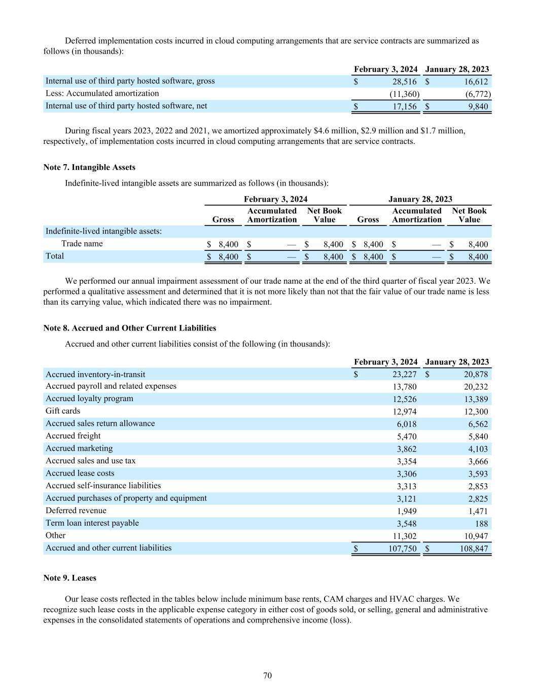 属于服务合同的云计算安排产生的递延实施成本汇总如下(单位:千):2024年2月3日2023年1月28日第三方托管软件的内部使用,毛额28,516美元16,612美元减:累计摊销(11,360)(6,772)第三方托管软件的内部使用,净额17,156美元9,840美元在2023、2022和2021财年,我们分别摊销了属于服务合同的云计算安排产生的实施成本约460万美元、290万美元和170万美元。注7。无形资产无限期无形资产汇总如下(单位:千):2024年2月3日2023年1月28日毛额累计摊销净帐面价值毛额累计摊销净帐面价值无限期无形资产:商品名8,400美元— 8,400美元— 8,400美元合计8,400美元— 8,400美元— 8,400美元我们在2023财年第三季度末对我们的商品名进行了年度减值评估。我们进行了定性评估,确定我们商号的公允价值低于其账面价值的可能性不大,这表明不存在减值。注8。应计及其他流动负债应计及其他流动负债构成如下(单位:千):2024年2月3日1月28日,2023应计在途库存23,227美元20,878美元应计工资和相关费用13,78020,232应计忠诚度计划12,52613,389礼品卡12,97412,300应计销售退货津贴6,0186,562应计运费5,4705,840应计营销3,8624,103应计销售和使用税3,3543,666应计租赁成本3,3063,593应计自保负债3,3132,853应计购置财产和设备3,1212,825递延收入1,9491,471应付定期贷款利息3,548188其他11,30210,947应计和其他流动负债107,750美元108,847美元注9。租赁我们在下表中反映的租赁成本包括最低基本租金、CAM费用和HVAC费用。我们在销售商品成本的适用费用类别中确认此类租赁成本,或在综合经营和综合收益(亏损)报表中确认销售、一般和管理费用。70