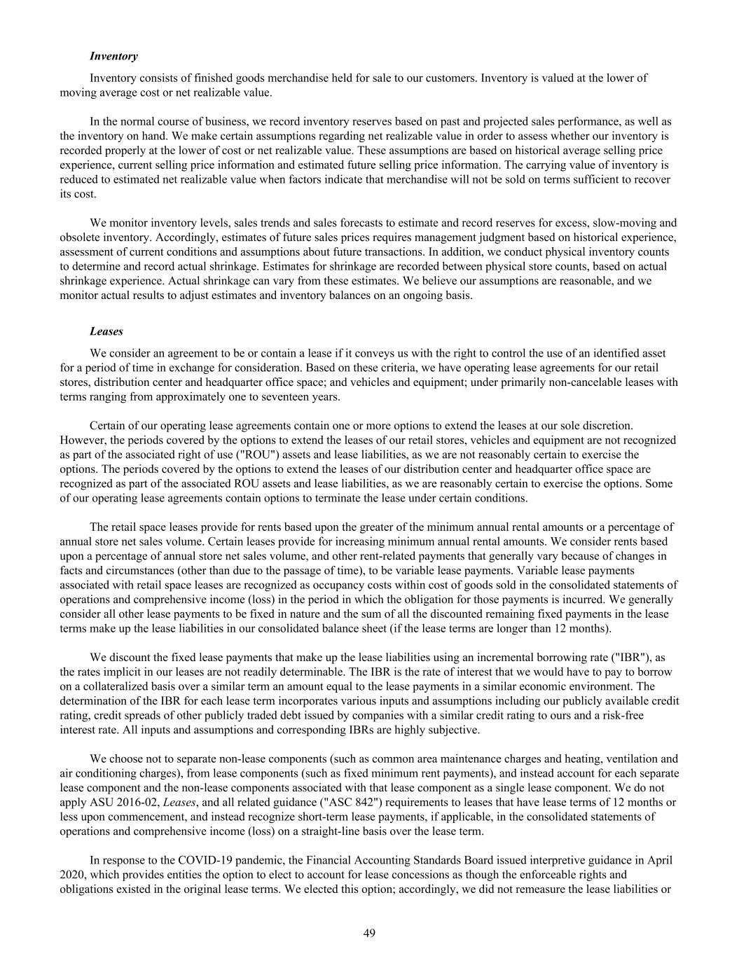 库存库存包括为出售给我们的客户而持有的成品商品。存货按移动平均成本或可变现净值孰低计估值。在正常业务过程中,我们根据过去和预计的销售业绩以及手头的库存记录库存储备。我们对可变现净值作出某些假设,以评估我们的存货是否按成本或可变现净值两者中较低者正确入账。这些假设是基于历史平均售价经验、当前售价信息和预计未来售价信息。当因素显示商品将不会以足以收回其成本的条款出售时,存货的账面价值减至估计可变现净值。我们监测库存水平、销售趋势和销售预测,以估计和记录过剩、滞销和过时库存的储备。因此,对未来销售价格的估计需要管理层根据历史经验、对当前状况的评估以及对未来交易的假设进行判断。此外,我们进行实物库存盘点,以确定并记录实际的缩减。根据实际收缩经验,在实体店数量之间记录对收缩的估计。实际收缩可能与这些估计不同。我们认为我们的假设是合理的,我们监控实际结果以持续调整估计和库存余额。租赁我们认为一项协议是或包含一项租赁,如果它向我们传达了在一段时间内控制一项已识别资产的使用以换取对价的权利。根据这些标准,我们的零售店、配送中心和总部办公空间;以及车辆和设备;主要是根据不可撤销的租约签订的经营租赁协议,租期约为一年至十七年。我们的某些经营租赁协议包含一个或多个选项,由我们自行决定延长租约。然而,延长我们的零售店、车辆和设备的租约的期权所涵盖的期间不被确认为相关使用权(“ROU”)资产和租赁负债的一部分,因为我们无法合理确定行使期权。延长我们配送中心和总部办公空间租约的期权所涵盖的期间被确认为相关ROU资产和租赁负债的一部分,因为我们有理由确定将行使期权。我们的一些经营租赁协议包含在特定条件下终止租赁的选择权。零售空间租赁按最低年租金金额或年店铺净销售量百分比中的较大者提供租金。某些租约规定增加最低年租金金额。我们认为基于每年商店净销售量的百分比的租金,以及通常因事实和情况的变化而不同的其他与租金相关的付款(除了由于时间的推移),是可变的租赁付款。与零售空间租赁相关的可变租赁付款在这些付款的义务发生期间在综合经营报表和综合收益(亏损)中的已售商品成本内确认为占用成本。我们一般认为所有其他租赁付款在性质上是固定的,并且租赁条款中所有贴现剩余固定付款的总和构成我们综合资产负债表中的租赁负债(如果租赁条款超过12个月)。我们使用增量借款利率(“IBR”)对构成租赁负债的固定租赁付款进行贴现,因为我们租赁中隐含的利率不易确定。IBR是在类似的经济环境中,我们必须支付的利率,才能在类似的期限内以抵押方式借款,金额等于租赁付款。每个租赁期限的IBR的确定包括各种输入和假设,包括我们公开的信用评级、与我们信用评级相似的公司发行的其他公开交易债务的信用利差和无风险利率。所有输入和假设以及相应的国际财务报告准则都是高度主观的。我们选择不将非租赁部分(如公共区域维护费和供暖、通风和空调费)与租赁部分(如固定最低租金付款)分开,而是将每个单独的租赁部分和与该租赁部分相关的非租赁部分作为单一租赁部分进行核算。我们不将ASU2016-02、租赁和所有相关指南(“ASC 842”)的要求应用于租赁期限在启动时为12个月或更短的租赁,而是确认短期租赁付款(如适用), 在租赁期内按直线法在合并经营报表和综合收益(亏损)表中。为应对新冠肺炎大流行,财务会计准则委员会于2020年4月发布了解释性指南,该指南为实体提供了选择对租赁特许权进行会计处理的选项,就好像原始租赁条款中存在可执行的权利和义务一样。我们选择了这个选项;因此,我们没有重新计量租赁负债或49