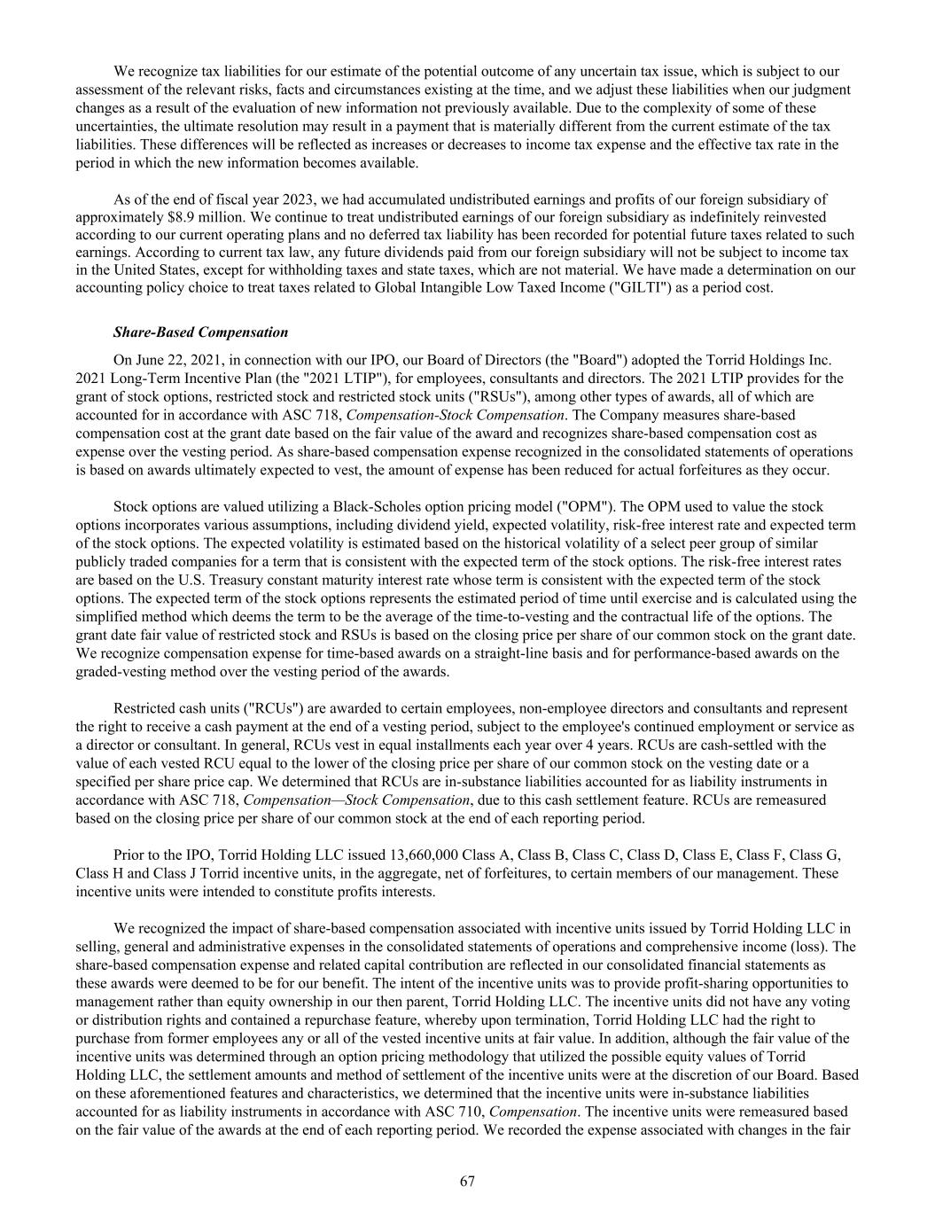 我们就我们对任何不确定税务问题的潜在结果的估计确认税务责任,这取决于我们对当时存在的相关风险、事实和情况的评估,当我们的判断因评估以前无法获得的新信息而发生变化时,我们会调整这些责任。由于其中一些不确定性的复杂性,最终解决方案可能会导致支付与当前估计的税务负债存在重大差异的款项。这些差异将反映为新信息可用期间的所得税费用和有效税率的增加或减少。截至2023财年末,我们的外国子公司累计未分配收益和利润约为890万美元。根据我们目前的经营计划,我们继续将我们的外国子公司的未分配收益视为无限期再投资,并且没有记录与此类收益相关的潜在未来税项的递延所得税负债。根据现行税法,未来从我们的外国子公司支付的任何股息将不需要在美国缴纳所得税,但预扣税和州税除外,这并不重要。我们已就我们的会计政策选择做出决定,将与全球无形低税收收入(“GILTI”)相关的税收视为期间成本。以股份为基础的薪酬2021年6月22日,就我们的首次公开募股而言,我们的董事会(“董事会”)通过了Torrid Holdings Inc. 2021年长期激励计划(“2021年长期激励计划”),对象为员工、顾问和董事。2021年LTIP规定授予股票期权、限制性股票和限制性股票单位(“RSU”),以及其他类型的奖励,所有这些都按照ASC 718,补偿-股票补偿进行会计处理。公司在授予日根据奖励的公允价值计量股份补偿成本,并在归属期内将股份补偿成本确认为费用。由于在综合经营报表中确认的股份补偿费用是基于最终预期归属的奖励,因此在发生实际没收时减少了费用金额。股票期权采用Black-Scholes期权定价模型(“OPM”)进行估值。用于股票期权估值的OPM包含了各种假设,包括股息收益率、预期波动率、无风险利率和股票期权的预期期限。预期波动率是根据与股票期权预期期限一致的类似上市公司的选定同业组的历史波动率估计的。无风险利率以期限与股票期权预期期限一致的美国国债恒定期限利率为基准。股票期权的预期期限是指至行使的估计期限,采用认为期限为期权归属时间和合同期限的平均值的简易法计算。限制性股票和RSU的授予日公允价值基于我们普通股在授予日的每股收盘价。我们在奖励归属期内按直线法确认基于时间的奖励以及按分级归属法确认基于业绩的奖励的补偿费用。受限制现金单位(“RCU”)授予某些雇员、非雇员董事和顾问,并代表在归属期结束时获得现金付款的权利,但须视雇员是否继续受雇或担任董事或顾问的情况而定。一般来说,RCU在4年内每年均等分期归属。RCU以现金结算,每个既得RCU的价值等于我们普通股在归属日的每股收盘价或特定的每股价格上限中的较低者。由于这种现金结算特征,我们根据ASC 718,补偿—股票补偿,确定RCU为作为负债工具核算的实质负债。RCU是根据每个报告期末我们普通股的每股收盘价重新计量的。在IPO之前,Torrid Holding LLC向我们管理层的某些成员发行了总计13,660,000个A类、B类、C类、D类、E类、F类、G类、H类和J类Torrid激励单位,扣除没收后。该等激励单位拟构成利润权益。我们认识到Torrid Holding LLC在出售、 综合经营报表及综合收益(亏损)中的一般及行政开支。股份补偿费用和相关出资反映在我们的综合财务报表中,因为这些奖励被认为是为了我们的利益。激励单位的意图是向管理层提供利润分享机会,而不是我们当时的母公司Torrid Holding LLC的股权所有权。激励单位没有任何投票权或分配权,并包含回购特征,据此,在终止时,Torrid Holding LLC有权以公允价值向前雇员购买任何或所有已归属的激励单位。此外,虽然激励单位的公允价值是通过利用Torrid Holding LLC可能的股权价值的期权定价方法确定的,但激励单位的结算金额和结算方法由我们的董事会酌情决定。基于前述这些特征和特征,我们按照ASC 710,薪酬确定激励单位为实质负债作为负债工具核算。根据各报告期末奖励的公允价值重新计量激励单位。我们记录了与交易会变化相关的费用67