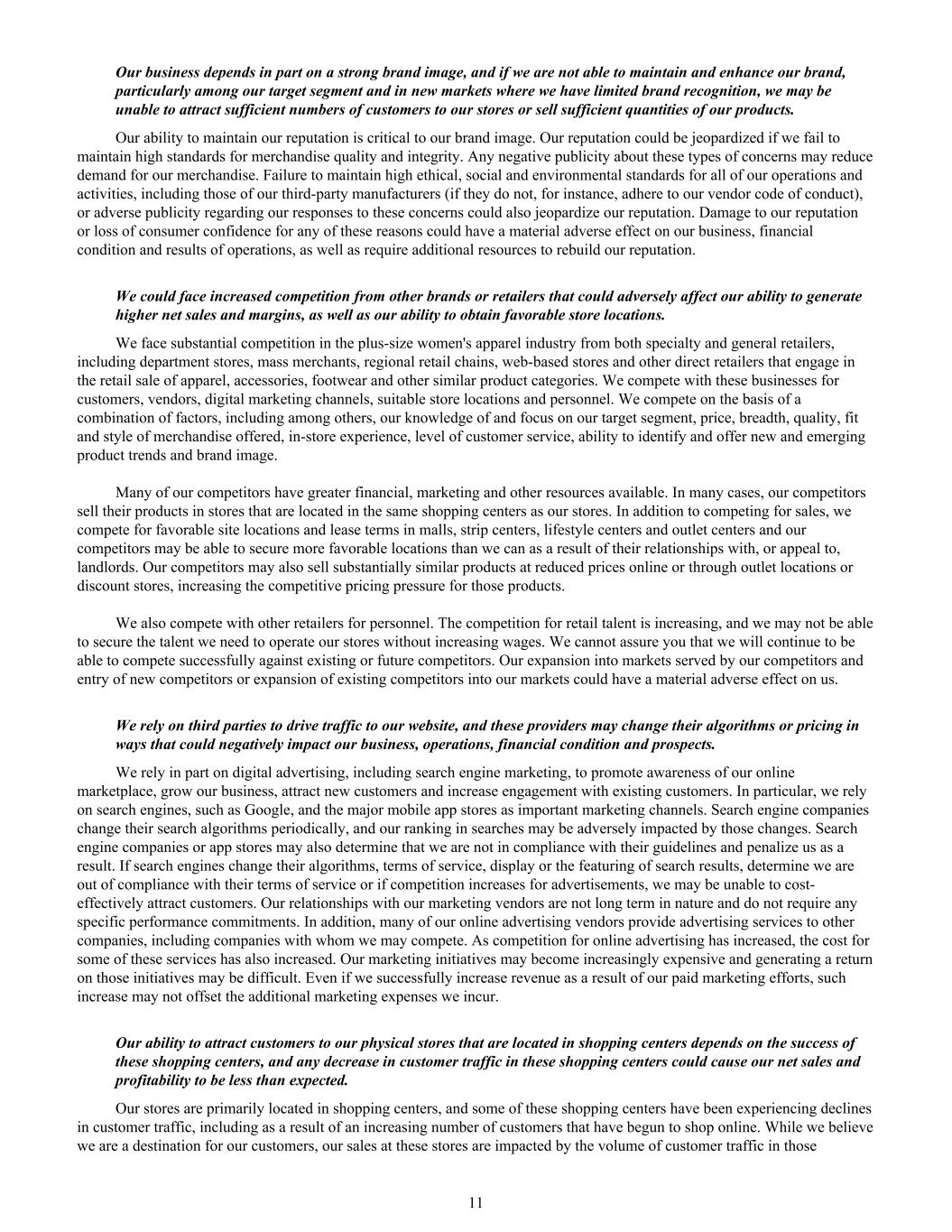 我们的业务部分取决于强大的品牌形象,如果我们不能保持和提升我们的品牌,特别是在我们的目标细分市场和我们的品牌认知度有限的新市场,我们可能无法吸引足够数量的顾客到我们的商店或销售足够数量的我们的产品。我们维持声誉的能力对我们的品牌形象至关重要。如果我们不能保持商品质量和诚信的高标准,我们的声誉可能会受到损害。任何有关这些类型的担忧的负面宣传都可能减少对我们商品的需求。未能为我们的所有运营和活动(包括我们的第三方制造商的运营和活动)保持较高的道德、社会和环境标准(例如,如果他们不遵守我们的供应商行为准则),或关于我们对这些担忧的回应的负面宣传也可能危及我们的声誉。由于任何这些原因对我们的声誉造成损害或失去消费者信心,都可能对我们的业务、财务状况和经营业绩产生重大不利影响,并需要额外的资源来重建我们的声誉。我们可能会面临来自其他品牌或零售商的竞争加剧,这可能会对我们产生更高净销售额和利润率的能力以及我们获得有利门店位置的能力产生不利影响。我们在大码女装行业面临来自专业和一般零售商的实质性竞争,包括百货公司、大众商家、区域零售连锁店、网络商店和其他从事服装、配饰、鞋类和其他类似产品类别零售的直接零售商。我们与这些商家争夺客户、供应商、数字营销渠道、合适的门店位置和人员。我们在综合因素的基础上进行竞争,其中包括我们对目标细分市场的了解和关注、所提供商品的价格、广度、质量、合身性和风格、店内体验、客户服务水平、识别和提供新的和新兴产品趋势的能力以及品牌形象。我们的许多竞争对手拥有更大的财务、营销和其他资源。在许多情况下,我们的竞争对手在与我们的商店位于同一购物中心的商店中销售他们的产品。除了竞争销售之外,我们还在购物中心、地带中心、生活方式中心和奥特莱斯中心竞争有利的场地位置和租赁条款,由于我们的竞争对手与房东的关系或吸引房东,我们可能能够获得比我们更有利的位置。我们的竞争对手也可能在网上或通过奥特莱斯或折扣店以降价销售基本相似的产品,从而增加了这些产品的竞争定价压力。我们还与其他零售商竞争人员。对零售人才的竞争日益加剧,我们可能无法在不增加工资的情况下获得经营门店所需的人才。我们无法向您保证,我们将继续能够成功地与现有或未来的竞争对手竞争。我们向竞争对手服务的市场扩张以及新竞争对手的进入或现有竞争对手向我们的市场扩张可能对我们产生重大不利影响。我们依赖第三方为我们的网站带来流量,这些提供商可能会以可能对我们的业务、运营、财务状况和前景产生负面影响的方式改变其算法或定价。我们部分依赖数字广告,包括搜索引擎营销,以提高对我们在线市场的认识,发展我们的业务,吸引新客户并增加与现有客户的互动。特别是,我们依赖搜索引擎,比如谷歌,以及各大移动应用商店作为重要的营销渠道。搜索引擎公司会定期改变他们的搜索算法,我们在搜索中的排名可能会受到这些变化的不利影响。搜索引擎公司或应用商店也可能判定我们不遵守他们的准则,并因此对我们进行处罚。如果搜索引擎改变他们的算法、服务条款、显示或搜索结果的特征,确定我们不遵守他们的服务条款,或者如果广告竞争加剧,我们可能无法以具有成本效益的方式吸引客户。我们与营销供应商的关系本质上不是长期的,不需要任何具体的业绩承诺。此外,我们的许多在线广告供应商向其他公司提供广告服务,包括我们可能与之竞争的公司。随着网络广告竞争加剧, 其中一些服务的成本也有所增加。我们的营销举措可能会变得越来越昂贵,并且很难在这些举措上产生回报。即使由于我们的有偿营销努力,我们成功地增加了收入,但这种增加可能无法抵消我们产生的额外营销费用。我们吸引顾客到位于购物中心的实体店的能力取决于这些购物中心的成功,而这些购物中心客流量的任何减少都可能导致我们的净销售额和盈利能力低于预期。我们的商店主要位于购物中心,其中一些购物中心的客流量一直在下降,包括由于越来越多的顾客开始在网上购物。虽然我们相信我们是客户的目的地,但我们在这些商店的销售受到这11个商店客流量的影响