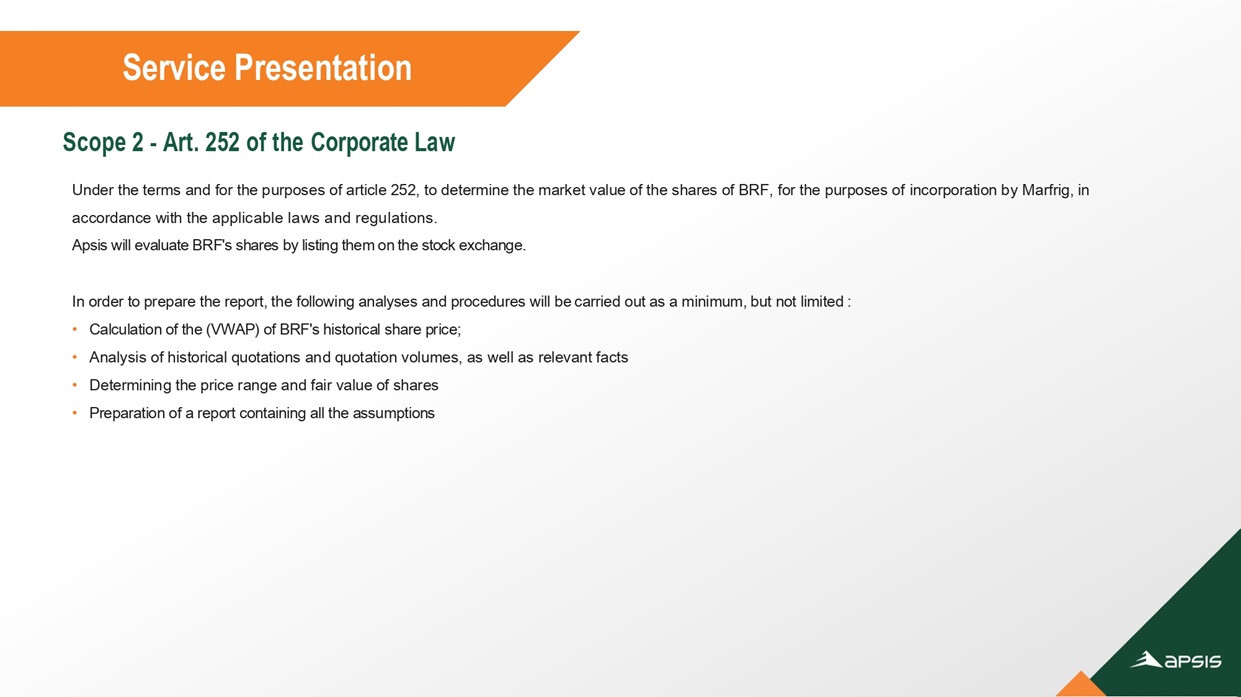| (三) | 批准任命总部位于里约热内卢州里约热内卢市、总部位于CEP 20021-290 Centro 6楼62号Rua do Passeio的CNPJ/MF第08.681.365/0001-30号和CRC/RJ第005112/O-9号注册的专业化公司Apsis Consultoria Empresarial Ltda.(“评估公司”)负责编制(a)将由MGF注册成立的BRF发行的股份的评估报告(按市场价值计算),在合并范围内(“合并评估报告”);及(b)载有计算BRF非控股股东所持股份交换比例的评估报告,以MGF和BRF股份的权益净值为基础,根据巴西公司法第264条,以相同标准并于2024年12月31日以市场价格对这两项资产进行评估(“264评估报告”); |