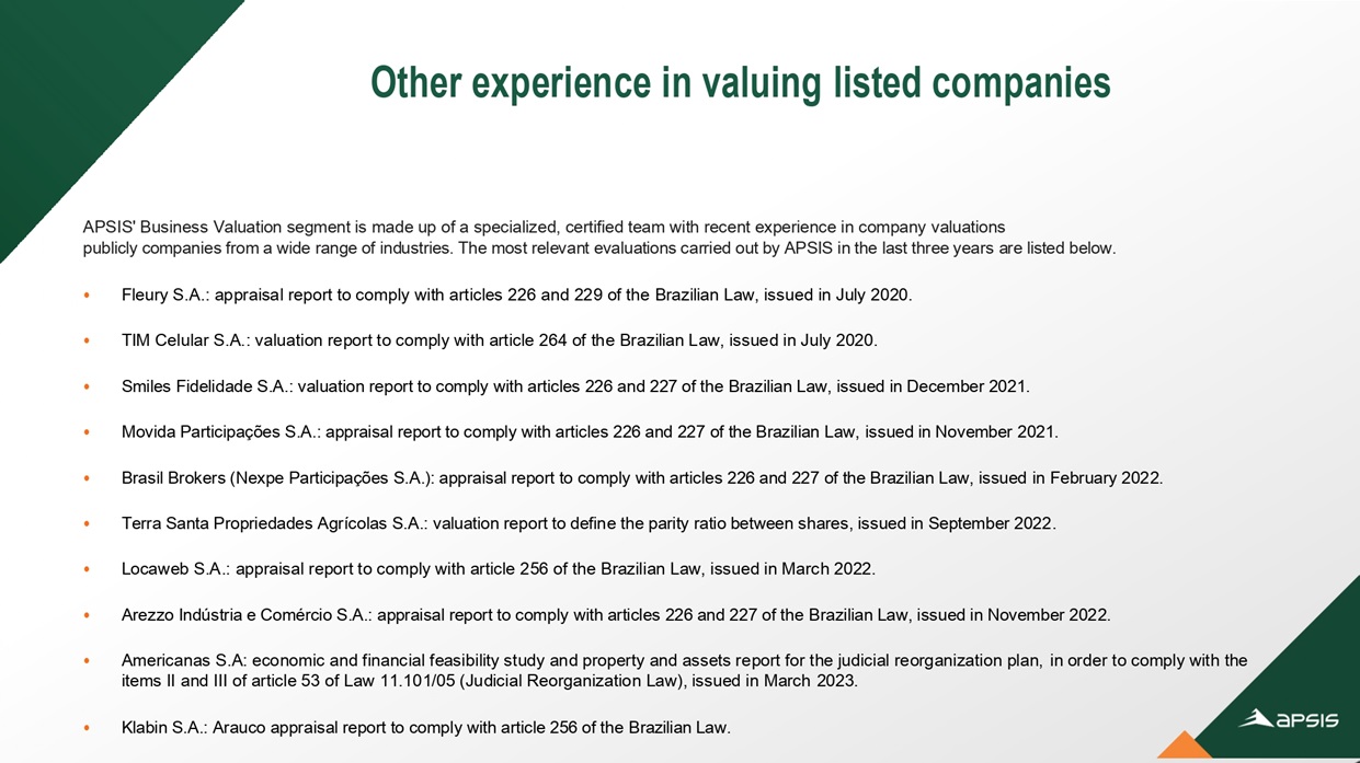 对上市公司进行估值的其他经验APSIS的业务估值部分由一支专业的、经过认证的团队组成,该团队近期具有来自广泛行业的公司估值公开公司的经验。以下列出最近三年APSIS开展的最相关评估。• Fleury S.A.:符合巴西法律第226条和第229条的评估报告,于2020年7月发布。• TIM Celular S.A.:符合巴西法律第264条的估值报告,于2020年7月发布。• Smiles Fidelidade S.A.:符合巴西法律第226条和第227条的估值报告,于2021年12月发布。• Movida Participa çõ es S.A.:符合巴西法律第226条和第227条的评估报告,于2021年11月发布。• Brasil Brokers(NEXPE Participa çõ es S.A.):符合《巴西法》第226条和第227条的评估报告,2022年2月发布。• Terra Santa Propriedades Agr í colas S.A.:定义股份间平价比率的估值报告,2022年9月发布。• Locaweb S.A.:符合巴西法律第256条的评估报告,2022年3月发布。• Arezzo Ind ú stria e Com é rcio S.A.:符合《巴西法律》第226条和第227条的评估报告,2022年11月发布。• Americanas S.A:司法重整计划的经济和金融可行性研究及财产和资产报告,以符合2023年3月发布的第11.10 1/05号法律(司法重整法)第53条第II和III项。• Klabin S.A.:Arauco评估报告符合巴西法律第256条。