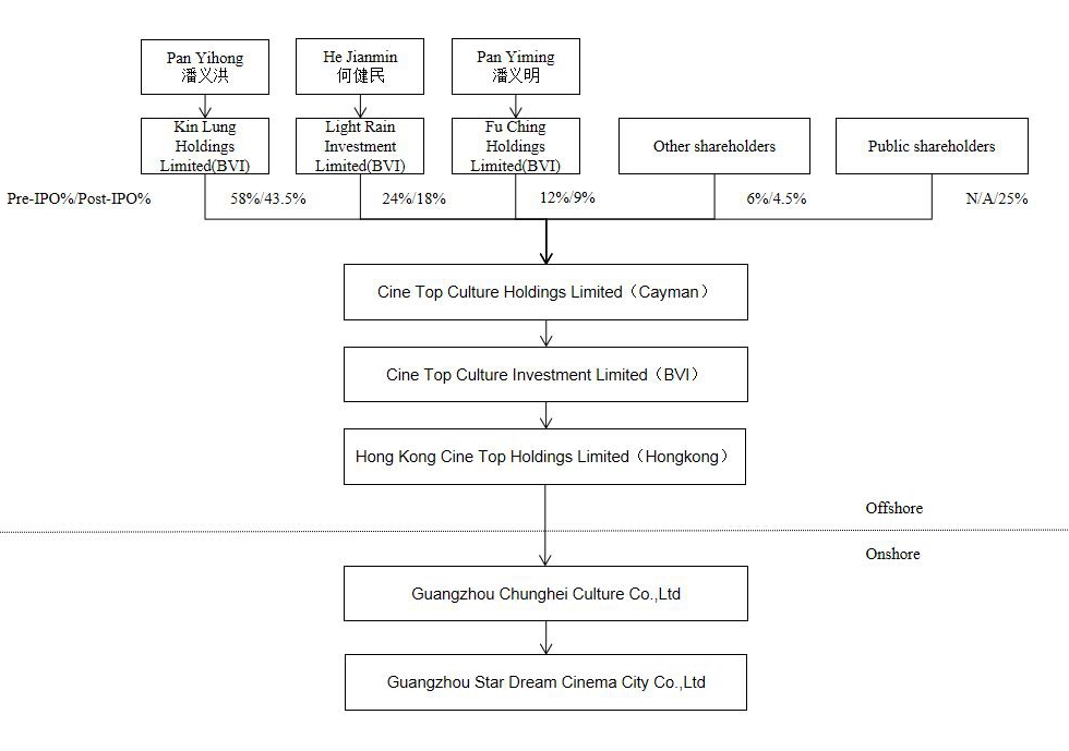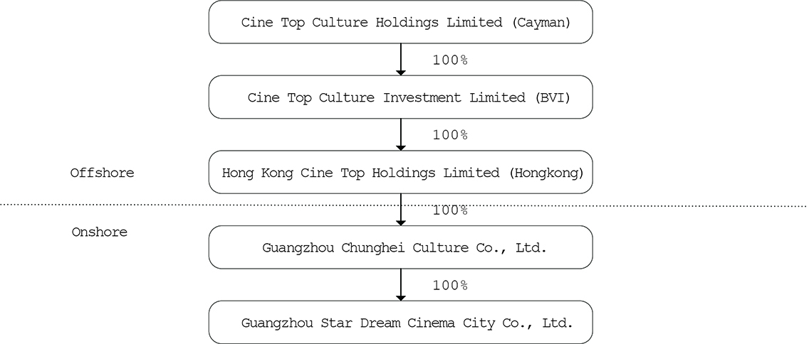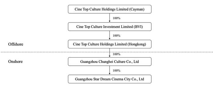 “本公司”、“Cine Holdings”、“我们”、“我们”、“我们的公司”和“我们的”是指Cine Top Culture Holdings Limited,一家根据开曼群岛法律注册成立的豁免公司。目前,我们几乎所有的业务都是通过我们在中国的间接全资子公司广州星梦电影城有限公司(简称“广州星梦”)进行的。广州星梦是广州中华文化有限公司(以下简称“中华文化”)的全资子公司,中华文化是一家在中国注册成立的控股公司,也是香港Cine Top控股有限公司(以下简称“香港Cine”)的全资子公司。香港电影公司是Cine Top Culture Investment Limited(“Cine Investment”)的全资子公司,Cine Top Culture Investment Limited是一家根据英属维尔京群岛法律注册成立的控股公司,也是Cine Holdings的全资子公司。本招股说明书提供的证券是Cine Holdings的证券,我们的开曼群岛控股公司和投资者购买的是Cine Holdings的权益,而不是我们在中国的经营实体。