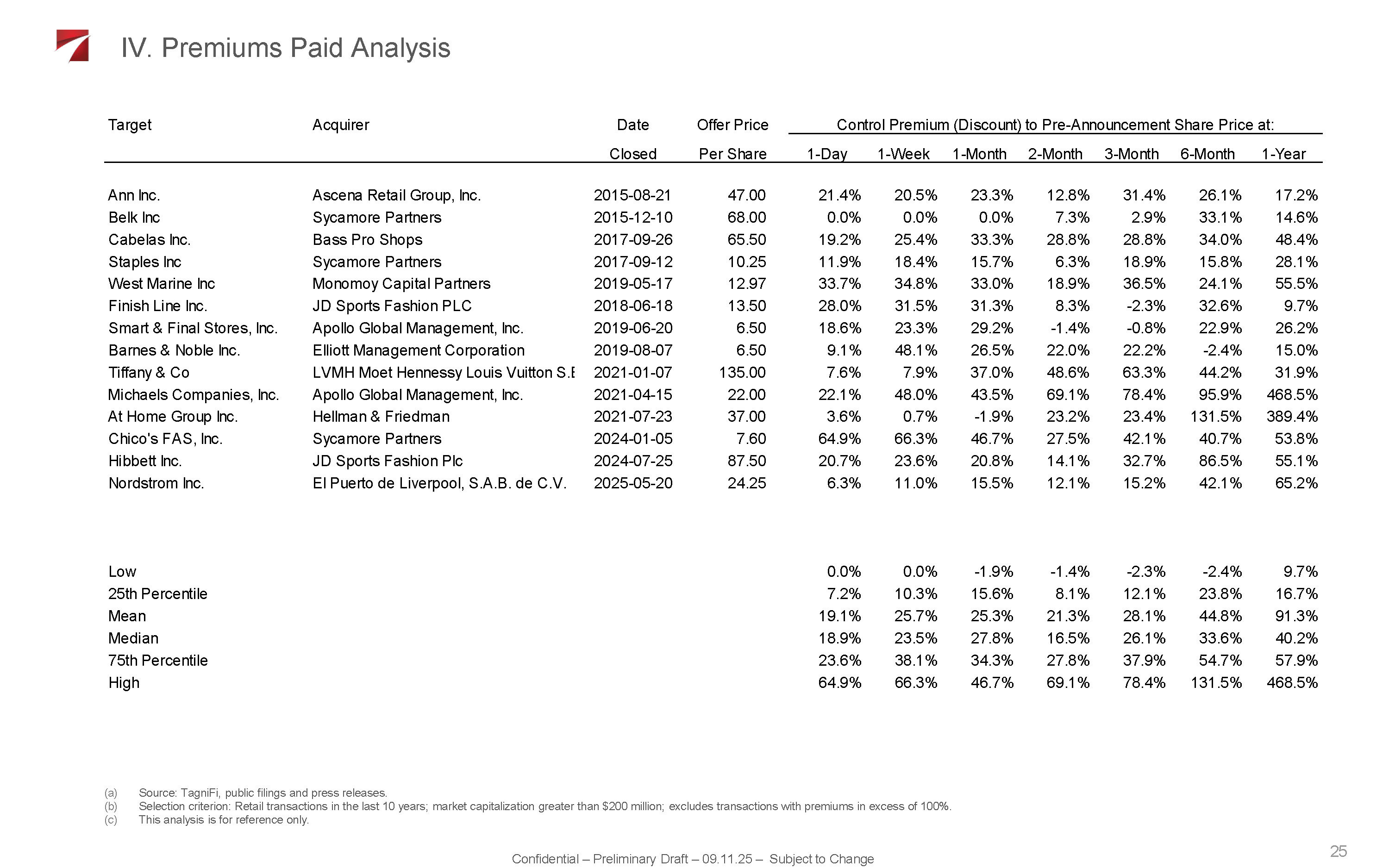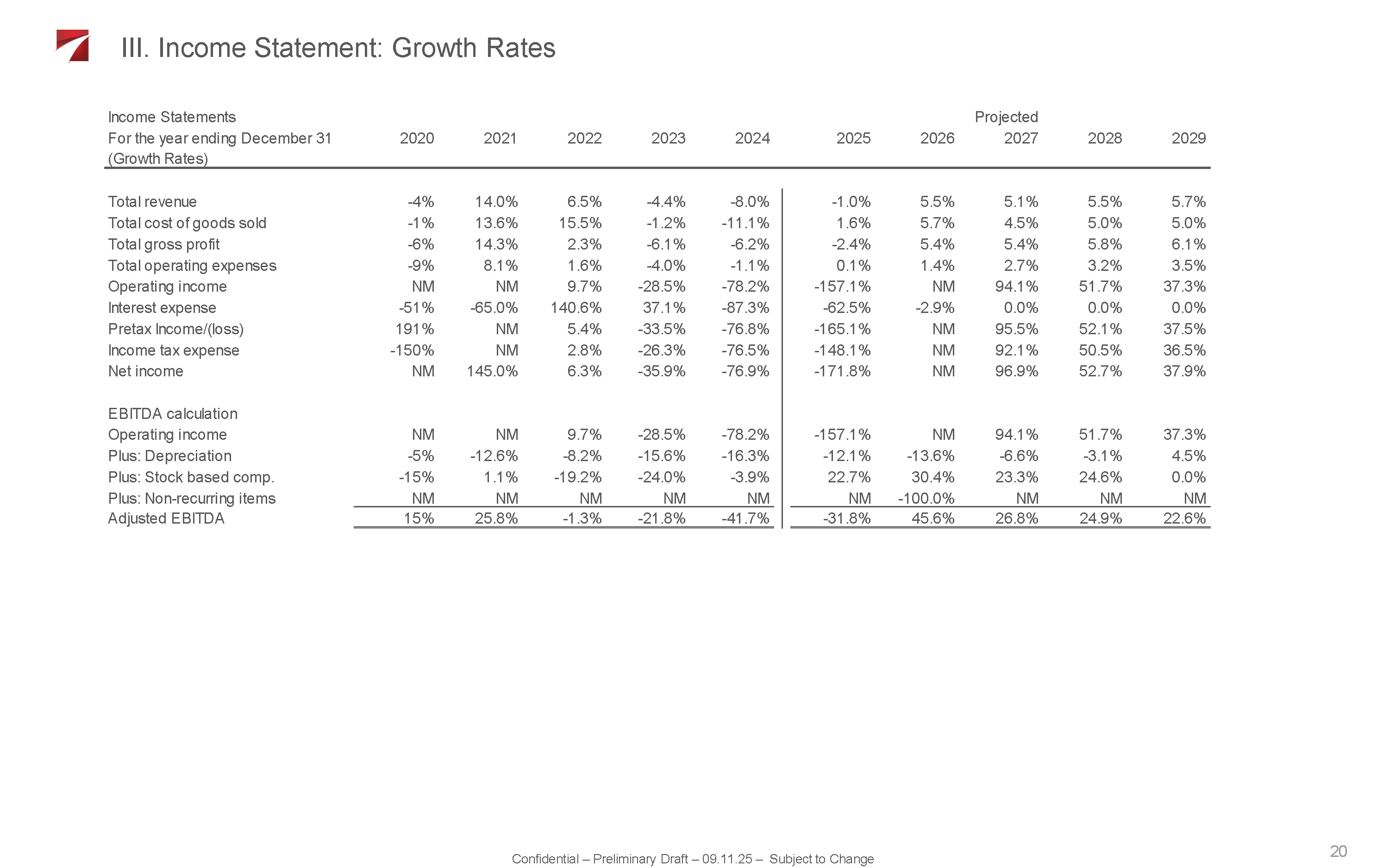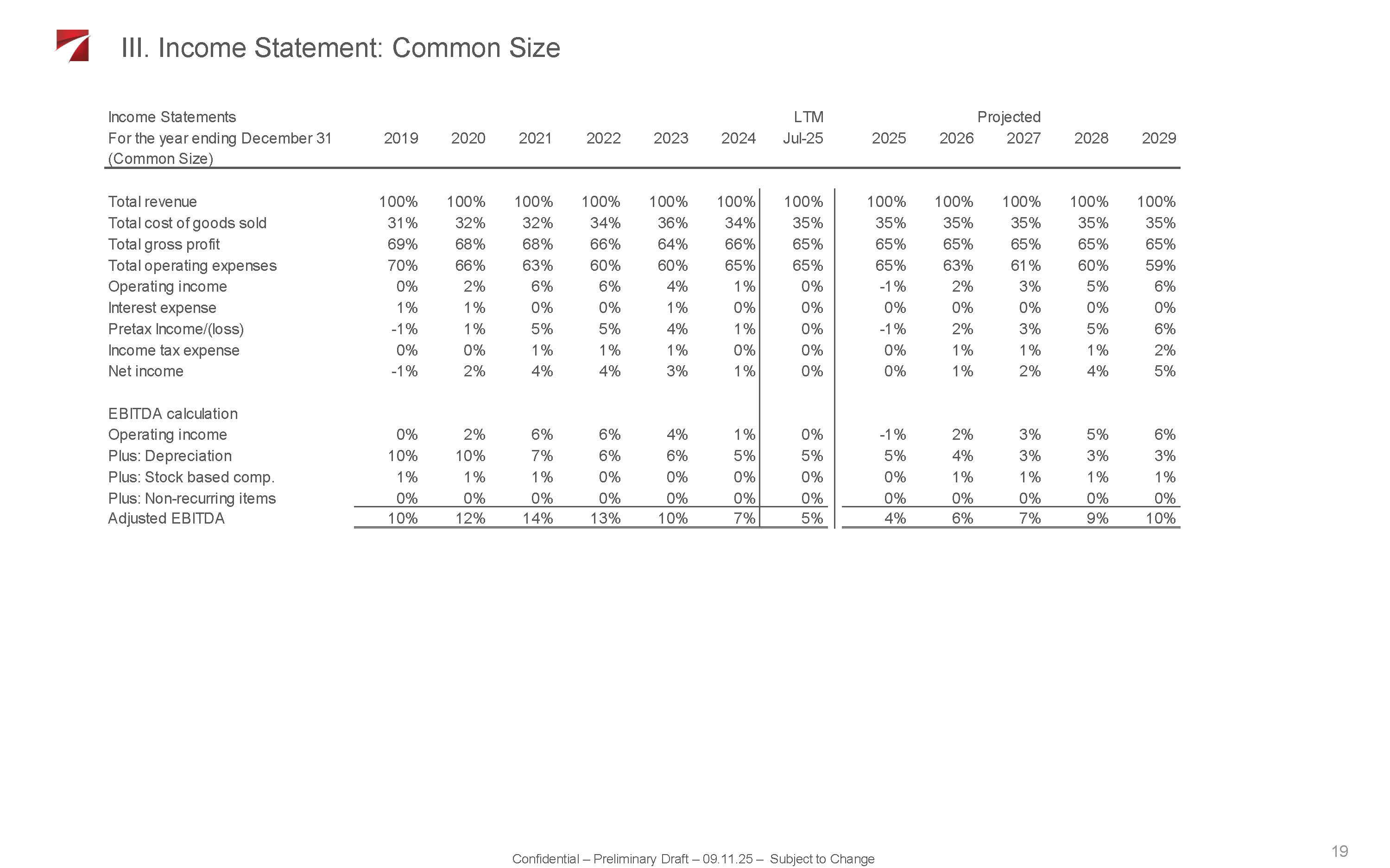 iii.资产负债表18机密–初稿– 09.11.25 –可能变动2019年12月31日止年度资产负债表2019202020212022202320247/31/25(单位:千)资产现金9,91910,27210,0137,7598,62020,95720,294应收账款3,3702,9753,2023,4112,8823,0853,708存货97,62074,29697,175120,95293,67986,26785,417应收所得税3,0908,1166,9233,8591298501,543其他流动资产8,1808,9959,76910,4229,2488,6637,744流动资产总额122,179104,654127,082146,403114,558119,8净额130,46 199,03582,28571,09564,31759,73358,511使用权资产137,737132,374123,101118,501129,092132,861130,006递延所得税资产7,1965,3416,9536,5365,2564,8904,553其他资产2,2411,2861,3373,2873,4492,2971,803固定资产净额277,635238,036213,676 199,419202,114 199,781194,874总资产399,814342,690340,758345,822316,672319,603313,580负债和权益应付账款18,18115,38230,88423,50623,34523,8081927,054流动负债合计69,85076,80497,71283,29178,74578,39476,217长期债务净额63,000-5,00045,400---长期租赁负债净额131,451122,678110,262103,353112,697113,700109,450其他长期负债4,6144,1465,5605,0095,5434,5975,067长期负债合计199,065126,824120,822153,762118,240118,297114,517负债合计268,915203,628218,534237,053196,985196,691190,733所有者权益130,899139,062122,224 108,769119,687122,912122,847负债和权益