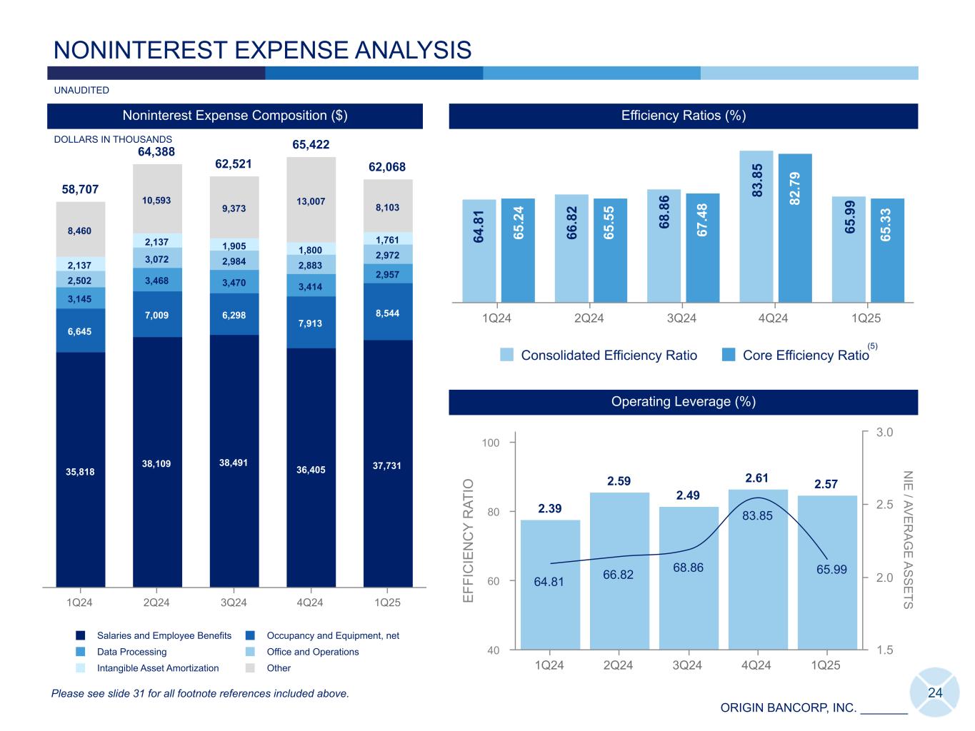 ORIGIN BANCORP,INC. _______24效率比率(%)以千为单位的非利息费用分析美元非利息费用构成($)综合效率比率核心效率比率1Q24 2Q24 3Q24 4Q24 1Q25经营杠杆(%)E FF IC IE N C Y R at IO N IE/AV E R A G E A S E TS 2.39 2.59 2.49 2.61 2.5764.81 66.8 268.8683.85 1Q24 2Q24 3Q24 1Q25 4060801001.5 2.0 2.5 3.06 4.81 65.24 465.55 66.82以上所有脚注参考请参见幻灯片31。67.4865.99(5)未经审计65.3368.8683.8582.79 58,70764,38862,52165,42262,06835,81838,10938,49136,40537,7316,6457,0096,2987,9138,5443,1453,4683,4703,4142,9572,5023,0722,9842,9832,9721,1371,9051,8001,7618,46010,5939,37313,0078,103工资和员工福利占用和设备、净数据处理办公室和运营无形资产摊销其他1Q24 2Q24 3Q24 4Q24 1Q25 65.99