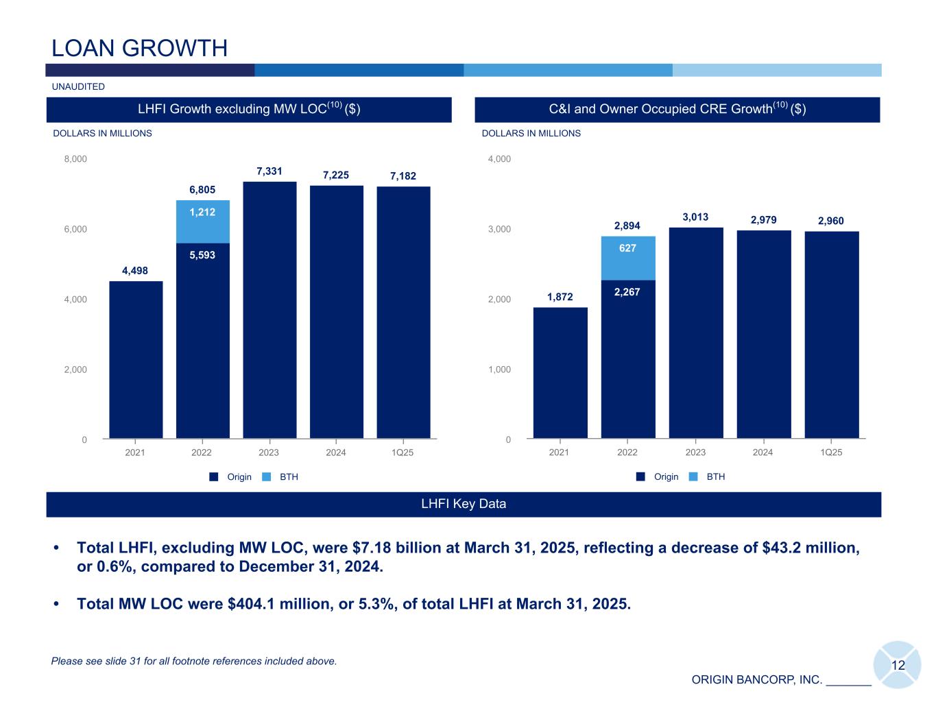 ORIGIN BANCORP,INC. ________ 12贷款增长4,4986,8057,3317,2257,1824,4985,5937,2257,1821,212 Origin BTH 2021202220232024 1Q25 02,0004,0004,0006,0008,000 LHFI关键数据美元,单位为百万IDT •截至2025年3月31日,不包括MW LOC的LHFI总额为71.8亿美元,与2024年12月31日相比减少了4320万美元,即0.6%。•截至2025年3月31日,总兆瓦LOC为4.041亿美元,占LHFI总额的5.3%。不包括MW LOC的LHFI增长(10)($)1,8722,8943,0132,9792,9601,8722,2672,9792,960627 Origin BTH 2021202220232024 1Q25 01,0002,0003,0004,000 C & I和所有者占用的CRE增长(10)($)请参见幻灯片31,了解以上所有脚注参考。百万美元未经审计