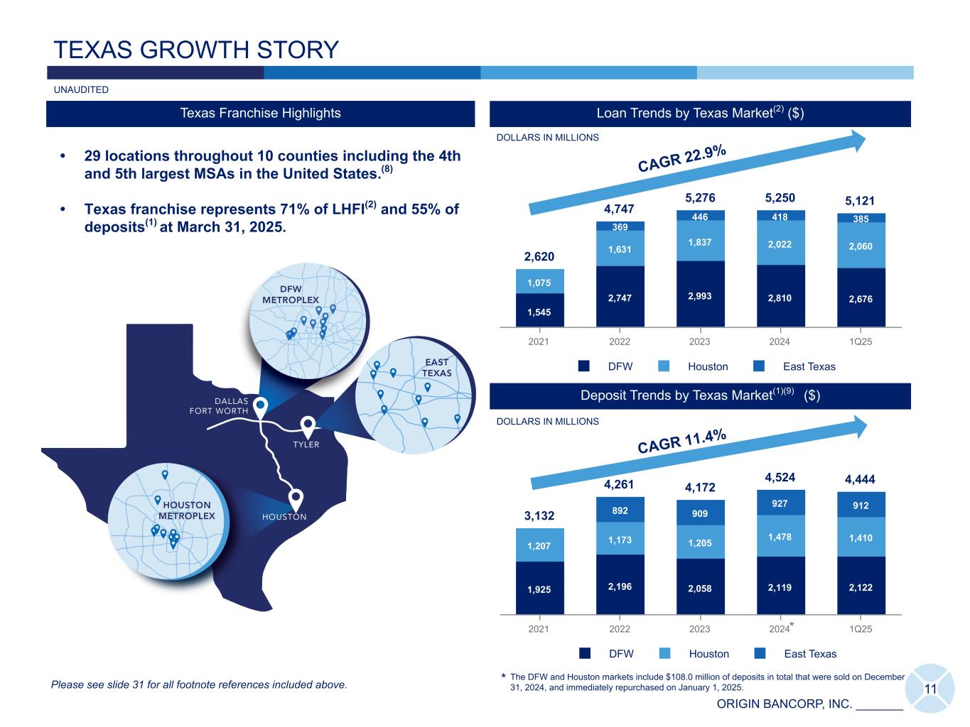 ORIGIN BANCORP,INC. ______路易斯安那州条目:1912笔贷款:1,482美元存款:3,169美元百万,未经审计(1)(2)3笔存款和国家贷款注:所有财务信息截至2025年3月31日。地图位置计数仅包括截至归档日期的完整服务分支。请参见幻灯片31,了解上面包含的所有脚注参考。密西西比州入境线:2010年贷款:555美元入境线:5867美元8% 38% 21% 55% 71%贷款(2)存款(1)ICS ICS TEXAS Dallas/Fort Worth Houston East Texas入境线:2008年入境线:2013年入境线:2022年贷款:2,676美元贷款:2,060美元贷款:385美元存款:2,122美元存款:1,410美元存款:912美元德克萨斯州贷款总额:5,121美元德克萨斯州存款总额:4,444美元东南(AL/FL)入境线:2024年贷款:24美元存款:58美元119917611在美国工作12年的最佳银行