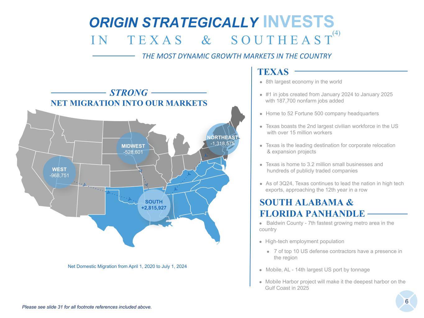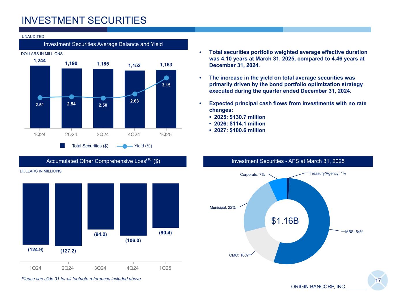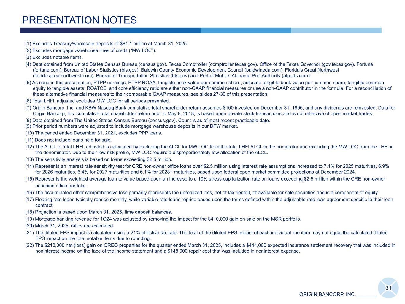 ORIGIN BANCORP,INC. ________ 31列报说明(1)不包括截至2025年3月31日的8110万美元国库/批发存款。(2)不包括抵押仓库信贷额度(“MW LOC”)。(3)不包括值得注意的项目。(4)数据来自美国人口普查局(census.gov)、德州审计长(comptroller.texas.gov)、德州州长办公室(gov.texas.gov)、《财富》(fortune.com)、劳工统计局(bls.gov)、鲍德温县经济发展委员会(baldwineda.com)、佛罗里达州大西北地区(floridasgreatnorthwest.com)、运输统计局(bts.gov)和阿拉巴马州港口管理局(alports.com)的莫比尔港。(5)如本演示文稿所用,PTPP收益、PTPP ROAA、每股普通股有形账面价值、调整后的每股普通股有形账面价值、有形普通股权益与有形资产、ROATCE和核心效率比率要么是非GAAP财务指标,要么在公式中使用非GAAP贡献者。有关这些替代财务指标与其可比GAAP指标的对账,请参阅本演示文稿的幻灯片27-30。(6)总LHFI,调整后不包括所有呈报期间的MW LOC。(7)Origin Bancorp,Inc.和KBW 纳斯达克银行累计股东总回报假设在1996年12月31日投资100美元,任何股息进行再投资。Origin Bancorp,Inc.在2018年5月9日之前的累计股东总回报数据基于非公开股票交易,不反映公开市场交易。(8)从美国人口普查局(census.gov)获得的数据。计数截至最近的实际可行日期。(9)前期数字进行了调整,以包括我们DFW市场的抵押仓库存款。(10)截至2021年12月31日止期间,不包括PPP贷款。(11)不包括持有待售贷款。(12)ALCL到总LHFI,调整后的计算方法是从分子中的总LHFI ALCL中剔除MW LOC的ALCL,从分母中的LHFI中剔除MW LOC。由于风险较低,MW LOC需要不成比例地低分配ALCL。(13)敏感性分析基于超过250万美元的贷款。(14)表示对超过250万美元的CRE非业主办公室贷款进行利率敏感性测试,使用利率假设,根据联邦公开市场委员会2024年12月的预测,2025年到期的利率提高到7.4%,2026年到期的利率提高到6.9%,2027年到期的利率提高到6.4%,2028年+到期的利率提高到6.1%。(15)表示加权平均贷款价值比,基于CRE非业主占用办公室组合内超过250万美元的贷款增加到10%的压力资本化率。(16)累计其他全面亏损主要指可供出售证券的未变现亏损(扣除税项利益),为权益的组成部分。(17)浮动利率贷款通常每月重新定价,而浮动利率贷款则根据特定于其贷款合同的可调整利率贷款协议中定义的条款重新定价。(18)预测以2025年3月31日定期存款余额为准。(19)对24年第一季度的抵押贷款银行业务收入进行了调整,剔除了销售收益41万美元对MSR投资组合的影响。(20)2025年3月31日,比率估计。(21)稀释后的每股收益影响采用21%的有效税率计算。由于四舍五入,每个单独行项目的稀释EPS影响的总和可能不等于计算的稀释EPS对总显着项目的影响。(22)截至2025年3月31日的季度,OREO物业的21.2万美元净(亏损)收益包括在损益表上计入非利息收入的44.4万美元预期保险结算回收和计入非利息费用的14.8万美元维修费用。