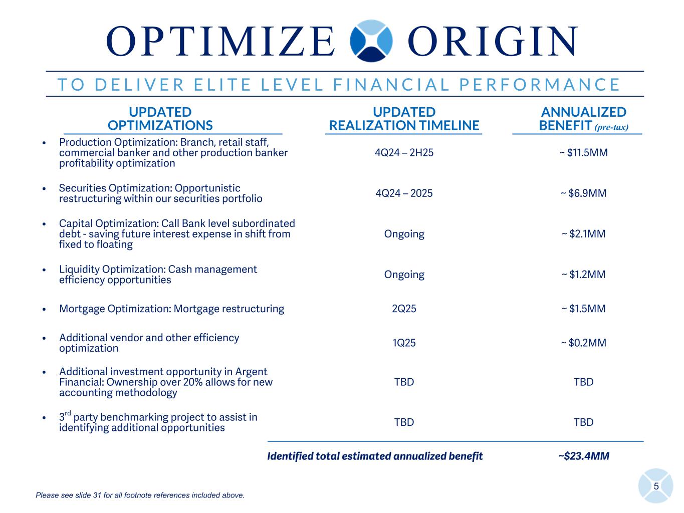 更新的优化更新的实现时间表年化效益(税前)•生产优化:分公司、零售人员、商业银行家和其他生产银行家盈利能力优化4Q24 – 2H25~$ 11.5mm •证券优化:我们证券投资组合中的机会性重组4Q24 – 2025~$ 6.9mm •资本优化:通知银行级别的次级债-在从固定到浮动的转变中节省未来的利息费用正在进行中~$ 2.1mm •流动性优化:现金管理效率机会正在进行中~$ 1.2mm •抵押贷款优化:抵押贷款重组2Q25~$ 1.5mm •额外的供应商和其他效率优化1Q25~$ 0.2mm • Argent Financial的额外投资机会:所有权超过20%允许有关新会计方法待定待定•第3方基准项目,以协助确定额外机会待定待定已确定的总估计年化收益~23.4mM 5 T O D E L I V E R E L I T E L E V E L F I N A N C I A L P E R F O R M A N C E O P T I M I Z E O R I G I N请参见幻灯片31,了解上述所有脚注参考。