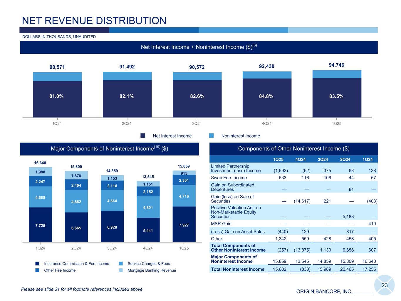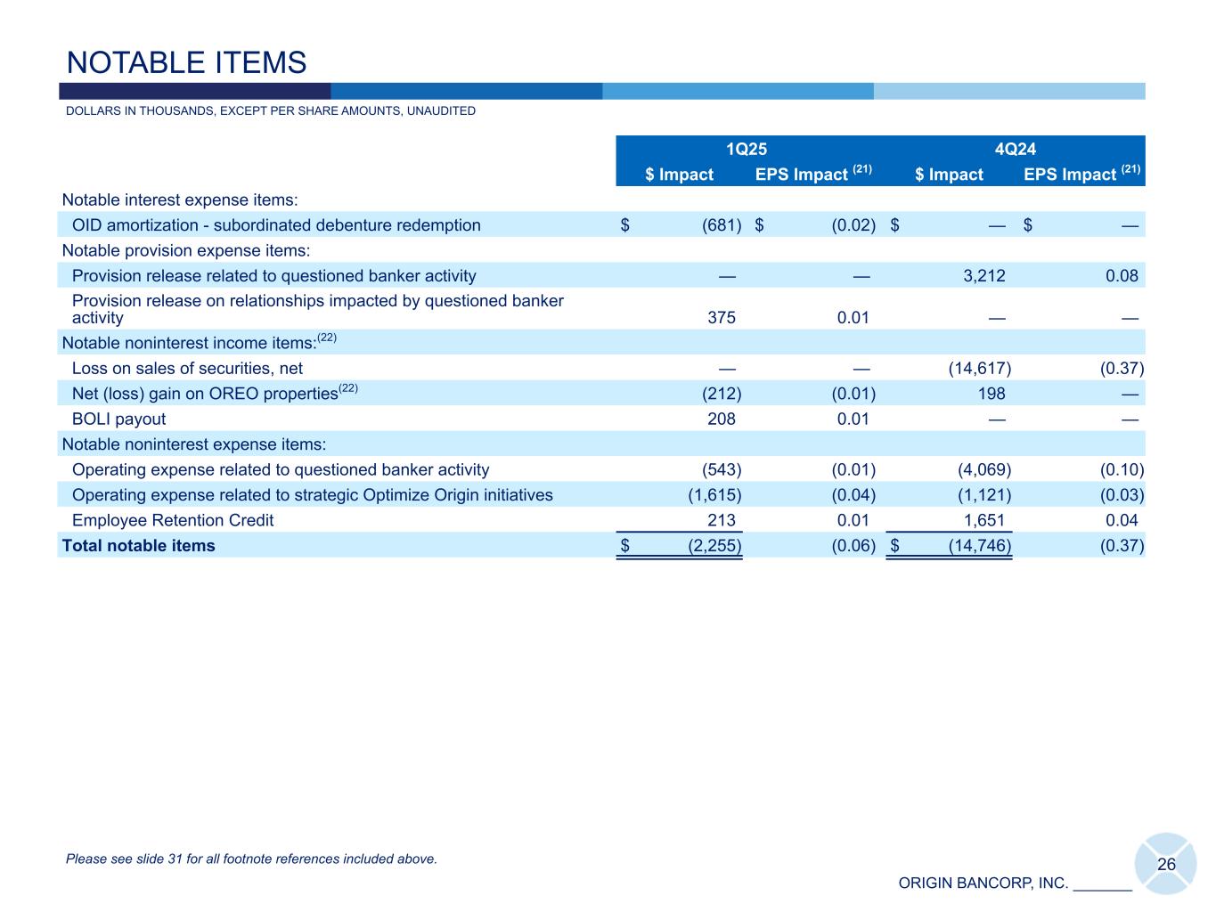 ORIGIN BANCORP,INC. ______ 1Q25 4Q24 $ Impact EPS Impact(21)$ Impact EPS Impact(21)值得注意的利息费用项目:OID摊销-次级债券赎回$(681)$(0.02)$ — $ —值得注意的拨备费用项目:与受质疑的银行家活动相关的拨备释放—— 3,2120.08对受质疑的银行家活动影响的关系的拨备释放3750.01 ——值得注意的非利息收入项目:(22)证券销售损失,净额——(14,617)(0.37)OREO物业净(亏损)收益(22)(212)(0.01)198 — BOLI支出2080.01 ——值得注意的非利息费用项目:与被质疑的银行家活动相关的运营费用(543)(0.01)(4,069)(0.10)与战略优化起源计划相关的运营费用(1,615)(0.04)(1,121)(0.03)员工保留信用2130.01 1,65 10.04值得注意的项目总额$(2,255)(0.06)$(14,746)(0.37)26美元,单位:千,每股金额除外,未经审计的应注意项目请参见幻灯片31,了解上述所有脚注参考。