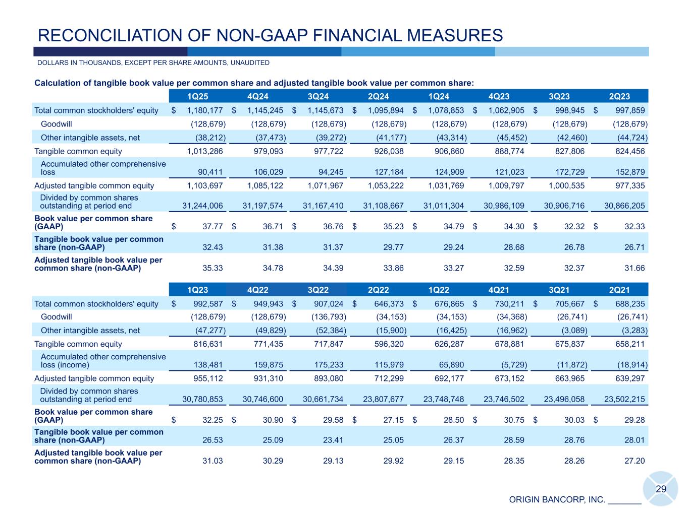 ORIGIN BANCORP,INC. _______计算每股普通股有形账面价值和调整后的每股普通股有形账面价值:1Q25 4Q24 3Q24 2Q24 1Q24 4Q23 3Q23 2Q23普通股股东权益总额$ 1,180,177 $ 1,145,245 $ 1,145,673 $ 1,095,894 $ 1,078,853 $ 1,062,905 $ 998,945 $ 997,859商誉(128,679)(128,679)(128,679)(128,679)(128,679)(128,679)(128,679)其他无形资产,净额(38,212)(37,473)(39,272)(41,177)(43,314)(45,452)(42,460)(44,724)有形普通股权益1,013,286979,093977,722926,038906,860888,774827,806824,456累计其他综合损失90,411106,0 2994,245127,184124,909121,023172,729152,879调整后有形普通股权益1,103,6971,085,1221,071,9671,053,2221,031,7691,009,7971,000,535977,335除以期末已发行普通股31,244,00631,197,57431,167,41031,每股普通股价值(非美国通用会计准则)35.33 34.78 34.39 33.86 33.2732.5932.37 31.66 1Q23 4Q22 3Q22 2Q22 1Q22 4Q21 3Q21 2Q21普通股股东权益总额$ 992,587 $ 949,943 $ 907,024 $ 646,373 $ 676,865 $ 730,211 $ 705,667 $ 688,235商誉(128,679)(128,679)(136,793)(34,153)(34,153)(34,368)(26,741)(26,741)其他无形资产,净额(47,277)(49,829)(52,384)(15,900)(16,425)(16,962)(3,089)(3,283)有形普通股权益816,631771,435717,847596,320626,287678,881675,837658,211累计其他综合亏损(收益)138,481159,875175,233115,97965,890(5,729)(11,872)(18,914)调整后有形普通股权益955,112931,310893,080712,299692,177673,152663,965639,297除以期末已发行普通股30,780,85330,746,60030,661,每股普通股账面价值(非公认会计原则)31.03 30.29 29.13 29.92 29.15 28.35 28.26 27.2029非公认会计原则财务措施调节单位:千美元,每股金额除外,未经审计