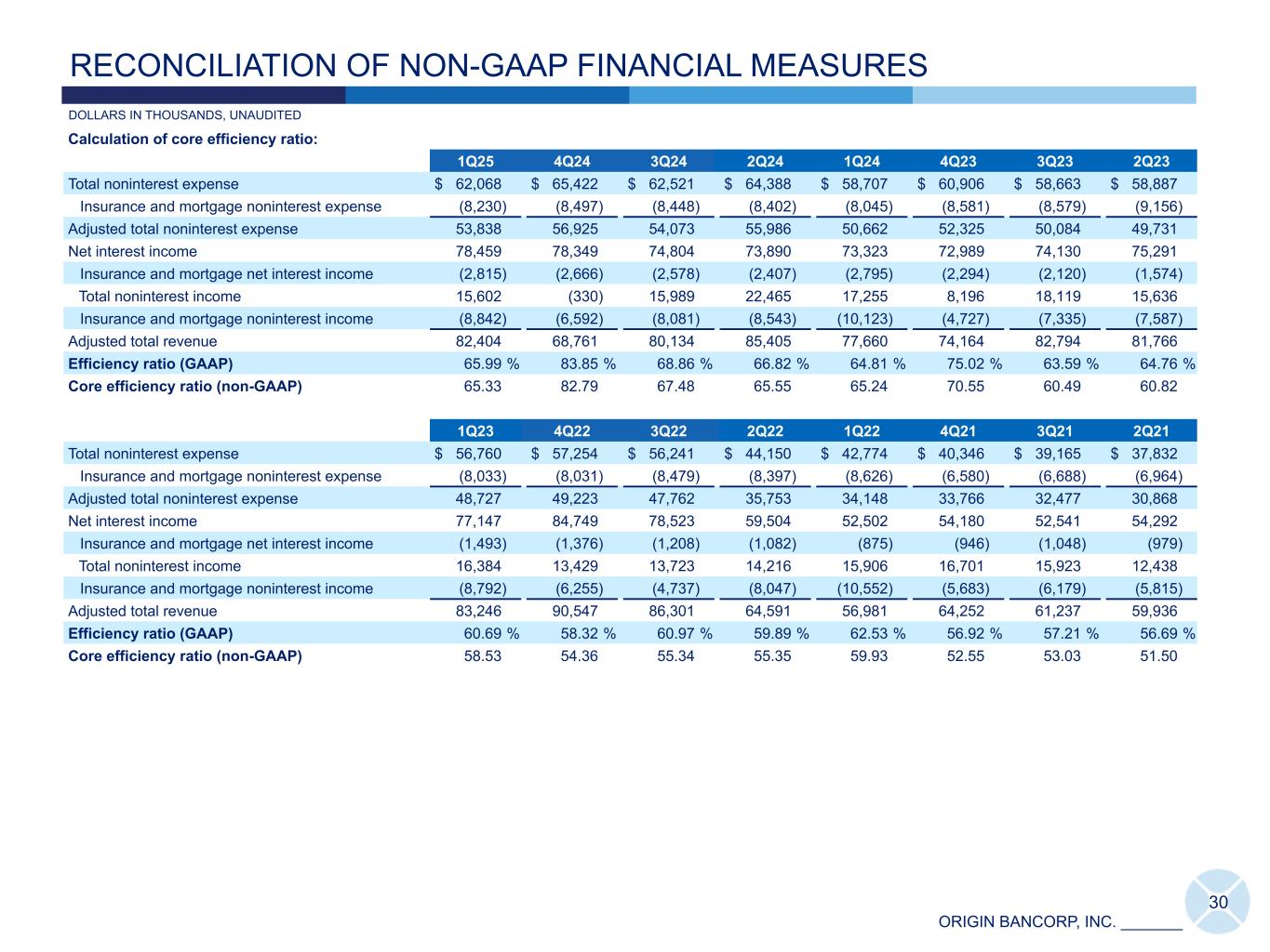 ORIGIN BANCORP,INC. _______非公认会计原则财务措施调节单位:千美元,核心效率比率的未经审计计算:1Q25 4Q24 3Q24 2Q24 1Q24 4Q23 3Q23 2Q23非利息支出总额62,068美元65,422美元62,521美元64,388美元58,707美元60,906美元58,663美元58,887美元保险和抵押贷款非利息支出(8,230)(8,497)(8,448)(8,402)(8,045)(8,581)(8,579)(9,156)调整后非利息支出总额53,83856,92554,07355,98650,66252,32550,08449,731净利息收入78,45978,34974,80473,89073,32372,98974,13075,291保险和抵押非利息收入(8,842)(6,592)(8,081)(8,543)(10,123)(4,727)(7,335)(7,587)调整后总收入82,40468,76180,13485,40577,66074,16482,79481,766效率比(GAAP)65.99% 83.85% 68.86% 66.82% 64.81% 75.02% 63.59%核心效率比(non-GAAP)65.3382.7967.4865.5565.24 70.55 60.49 60.82 1Q23 4Q22 3Q22 2Q22 1Q22 4Q21 3Q21 2Q21非利息费用总额$ 56,760 $ 57,254 $ 56,241 $ 44,150 $ 42,774 $ 40,346 $ 39,165 $ 37,832保险和抵押非利息支出(8,033)(8,031)(8,479)(8,397)(8,626)(6,580)(6,688)(6,964)调整后非利息支出总额48,72749,22347,76235,75334,14833,76632,47730,868净利息收入77,14784,74978,52359,50452,50254,18052,54154,292保险和抵押净利息收入(1,493)(1,376)(1,208)(1,082)(875)(946)(1,048)(979)非利息收入总额16,38413,42913,72314,21615,90616,70115,和抵押非利息收入(8,792)(6,255)(4,737)(8,047)(10,552)(5,683)(6,179)(5,815)调整后总收入83,24690,54786,30164,59156,98164,25261,23759,936效率比(GAAP)60.69% 58.32% 60.97% 59.89% 62.53% 56.92% 57.21% 56.69%核心效率比(non-GAAP)58.53 54.3655.3455.3559.93 52.5553.03 51.50 30