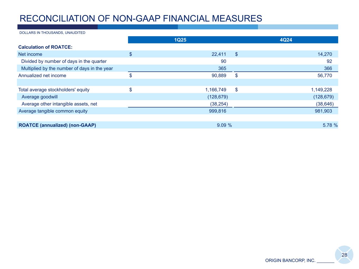 ORIGIN BANCORP,INC. ______ 1Q25 4Q24 ROATCE计算:净收入22,411美元14,270美元除以季度天数9092乘以年内天数365366年化净收入90,889美元56,770美元平均股东权益总额1,166,749美元1,149,228美元平均商誉(128,679)(128,679)平均其他无形资产净额(38,254)(38,646)平均有形普通股本999,816981,903 ROATCE(年化)(非公认会计原则)9.09% 5.78% 28美元以千计,非公认会计原则财务措施的未经审计调节