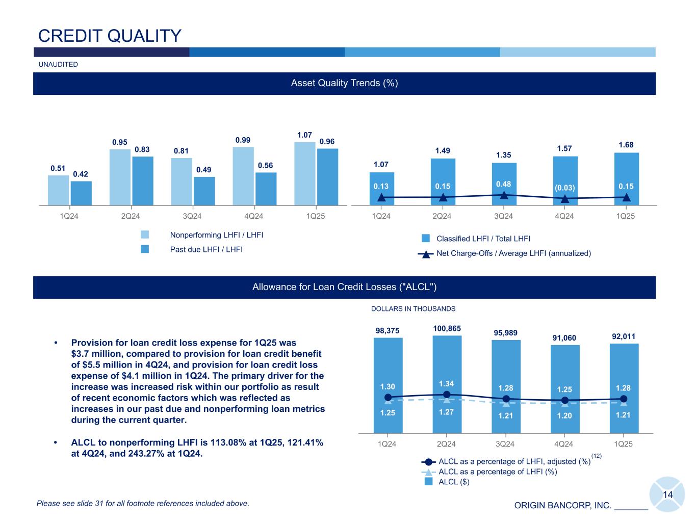 起源银行,INC. ________ Commercial & Industrial(“C & I”)27% Owner Occupied Commercial Real Estate(“CRE”)Non-Owner Occupied CRE 19% C & D:11% Multi-family real estate residential real estate-single family & consumer 13 Well-diversified loan portfolio(dollars in thousand)1Q25 4Q24 3Q24 2Q24 1Q24 C & I 2,022,0852,002,6342,074,0372,070,9472,154,151 Owner Occupied CRE 937,985975,947991,671959,850948,624 MW1,432,1291,414,0131,421,0271,373,532消费贷款21,89522,96722,92622,09922,199 LHFI总额7,585,5267,573,7137,956,7907,959,1717,900,027贷款组合详情(美元)非业主占用的CRE、建发和多户家庭:27.34亿美元C & I,业主占用的CRE和MW LOC:33.64亿美元C & I,业主占用的CRE,MW LOC:44%非业主占用的CRE、建发、多户家庭:截至2025年3月31日的36%贷款构成:75.86亿美元以上所有脚注参考请参见幻灯片31。未经审计(11)MW LOC 6% 20% 12% 5%房地产和建筑:8%多户房地产:6%零售购物:6%写字楼:5%在建多户:3%医疗保健:2%酒店:1%汽车相关:1%餐厅:1%消费者:1%金融和保险:1%专业服务:1%金融和保险:7%房地产和建筑:7%抵押仓库贷款:5%能源:3%运输服务:3%医疗保健:2%零售购物:2%零售经销商:1%专业服务:1%娱乐和娱乐:1%餐厅:1%消费者服务:1%银行:1%公用事业:1%商业服务:1%杂项。: 7%