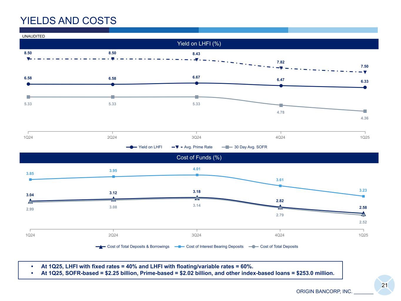ORIGIN BANCORP,INC. _______21 LHFI的收益率和成本(%)资金成本(%)•在2015年第一季度,固定费率的LHFI = 40%,浮动/可变费率的LHFI = 60%。•截至2015年第一季度,基于SOFR-的= 22.5亿美元,基于Prime的= 20.2亿美元,其他基于指数的贷款= 2.53亿美元。未经审计的6.586.586.6 76.476.33 8.508.508.4 37.8 27.505.33 5.33 5.33 4.78 4.36 LHFI平均收益率最优惠利率30天平均SOFR1Q24 2Q24 3Q24 4Q24 1Q25 3.04 3.12 3.18 2.82 2.58 3.85 3.95 4.01 3.61 3.23 2.99 3.08 3.14 2.79 2.52总存款成本&借款成本计息存款成本总存款成本1Q24 2Q24 3Q24 4Q24 1Q25