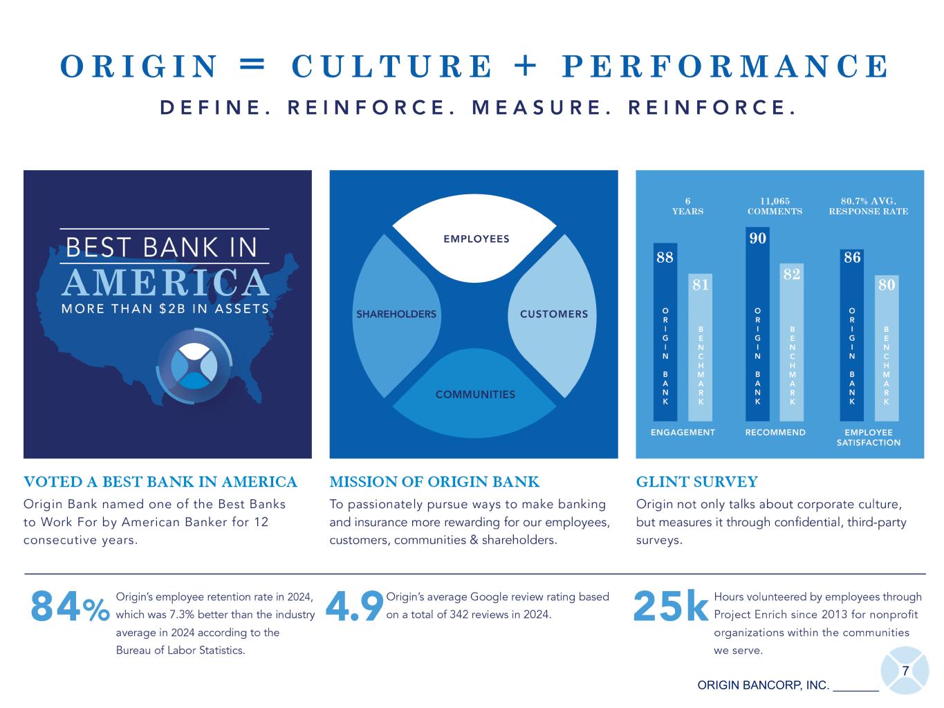 起源银行,INC. _______资产和股东权益增长1997-1Q25百万美元总资产(美元)1489,750199719981999199920002001200220032004200520062007200720082009201020112012201220132013201420152016201720182019202021202220232024 1Q25股东权益总额(美元)111,180199719981999199920002001200220032004200520052005200520062006200720072007200720072007200720072007200720072007200720072007200720072007200720072007200720072007200720072007200720072007200720072007200720107200620072008200920102011201220132014201520162017201820192020212021202220232024 1Q25CAGR16.6 % CAGR18.6 % 101,6811,764 Origin Bancorp,Inc.累计回报($)KBW 纳斯达克银行总回报指数($)12/31/9612/31/9712/31/9812/31/9912/31/0012/31/0112/31/0212/31/0312/31/0412/31/0512/31/0612/31/0712/31/0812/31/0912/31/1012/31/1112/31/1212/31/1312/31/1412/31/1512/31/1612/31/1712/31/1812/31/1912/31/2012/31/2112/31/2212/31/2312/31/2405001,0001,5002,0002,0002,500股东总回报(7)($)IPO请参见幻灯片31,了解上述所有脚注参考。百万美元未经审计