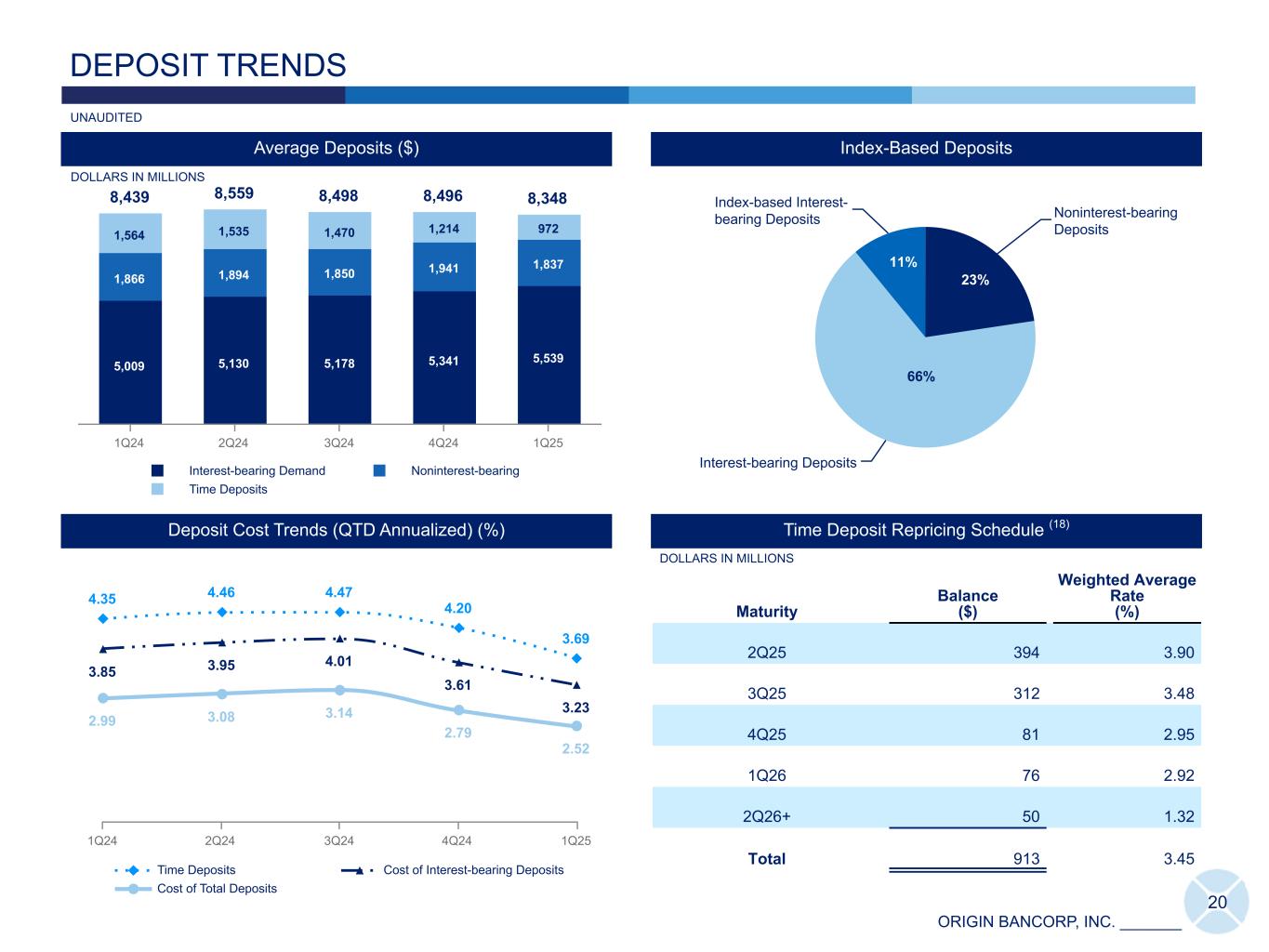 起源银行,INC. _______ 208,4398,5598,4988,4968,3485,0095,1305,1785,3415,5391,8661,8941,8501,9411,8371,5641,5351,4701,214972有息活期无息定期存款1Q24 2Q24 3Q24 4Q24 1Q25平均存款($)存款趋势IDT指数存款美元百万未审计存款成本趋势(QTD年化)(%)4.35 4.46 4.47 4.20 3.69 3.85 3.95 4.01 3.61 3.23 2.99 3.08 3.14 2.79 2.52定期存款有息存款成本总存款成本1Q24 2Q24 3Q24 4Q24 1Q25定期存款812.95 1Q26 762.92 2Q26 + 501.32合计9133.45百万美元无息存款计息存款指数型计息存款11% 66% 23%