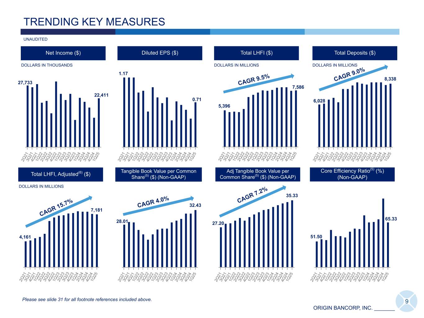 ORIGIN BANCORP,INC. _______趋势关键措施未经审计稀释每股收益(美元)净收入(美元)总LHFI,调整后(6)($)存款总额($)2Q1 21 Q3 21 Q4 21 Q1 22 Q2 22 Q3 22 Q4 22 Q1 23 Q3 23 Q3 23 Q4 23 Q1 24 Q2 24 Q4 24 Q1 25 Q2 21 Q3 21 Q4 21 Q1 22 Q2 22 Q3 22 Q3 22 Q3 22 Q4 22 Q1 23 Q3 23 Q3 23 Q4 23 Q4 23 Q4 23 Q4 23 Q1 24 Q3 24 Q4 24 Q1 258,338 Q2 21 Q3 21 Q4 21 Q1 22 Q3 22 Q3 22 Q4 22 Q1 23 Q3 23 Q3 23 Q4 23 Q1 24 Q3 24 Q4 24第一季度254,1617,1812Q21 Q3 21 Q4 21 Q1 22 Q2 22 Q3 22 Q4 22 Q4 22 Q1 23 Q3 23 Q4 23 Q4 23 Q1 24 Q2 24 Q3 24 Q4 24 Q1 25美元(千)9总LHFI(美元)美元(百万)5,396 Q2 21 Q3 21 Q4 21 Q4 21 Q1 22 Q2 22 Q3 22 Q4 22 Q4 22 Q1 23 Q2 23 Q3 23 Q3 23 Q4 23 Q4 23 Q1 24 Q3 24 Q4 24 Q1 25美元(百万美元)以上所有脚注参考请参见幻灯片31。CAGR9.5 % CAGR15.7 % CAGR9.0 % 6,02827,73322,411核心效率比率(5)(%)(Non-GAAP)51.50 2Q21 Q3 21 Q4 21 Q1 22 Q2 22 Q3 22 Q4 22 Q1 22 Q1 22 Q1 23 Q2 23 Q3 23 Q3 23 Q4 23 Q3 24 Q3 24 Q4 24 Q1 2532.43 2Q21 Q3 21 Q4 21 Q4 22 Q3 22 Q4 22 Q1 23 Q2 23 Q3 23 Q3 23 Q4 23 Q1 24 Q3 24 Q3 24 Q4 24 Q1 25每普通股有形账面价值(5)($)(Non-GAAP)35.33 2Q21 Q3 21 Q4 21 Q1 22 Q2 22Q3 22 Q4 22 Q1 23 Q2 23 Q3 23 Q4 23 Q1 24 Q2 24 Q3 24 Q4 24 Q4 24 Q1 25调整后每股普通股有形账面价值(5)(美元)(非美国通用会计准则)CAGR 4.0% CAGR 7.2% 1.17 0.71 28.01 27.207,58665.33