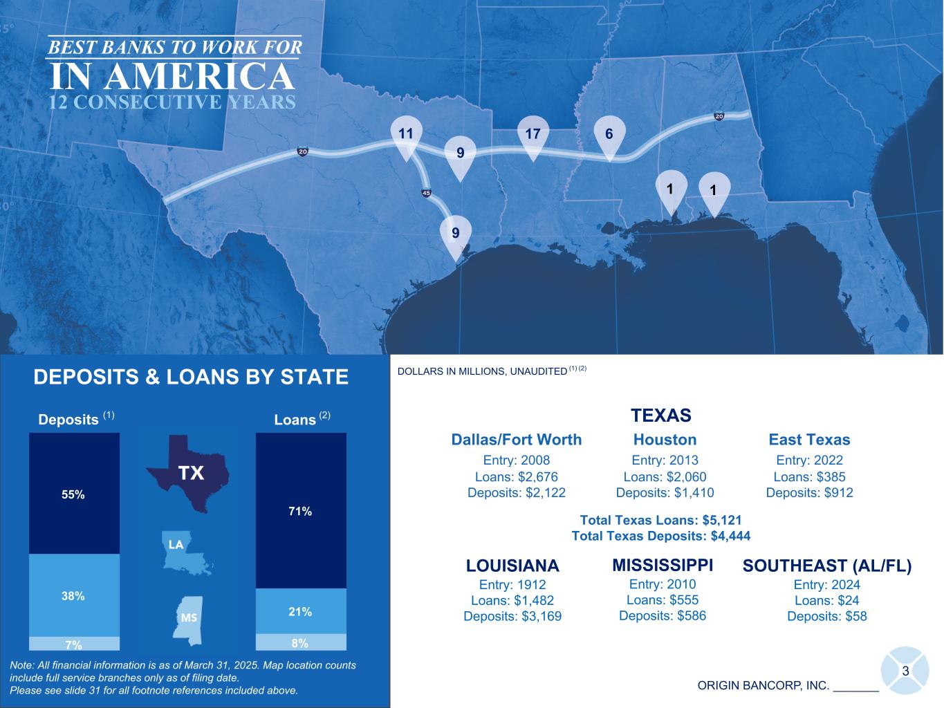 2前瞻性陈述和非公认会计原则措施本演示文稿包含1995年《私人证券诉讼改革法案》含义内的某些前瞻性陈述。前瞻性陈述包括有关Origin Bancorp,Inc(“Origin”、“我们”、“我们的”或“公司”)未来财务业绩、业务和增长战略、预计计划和目标,以及对其已发行普通股的任何预期购买,以及相关交易和其他基于宏观经济和行业趋势的预测的信息,包括美联储利率变化及其对Origin经营业绩的影响、估计的宽容金额以及对公司流动性的预期,包括与从FHLB获得的预付款有关的信息,这一切都可能发生变化,并且由于影响更广泛的经济和行业趋势的多重因素,可能在本质上是不可靠的,任何这样的变化都可能是重大的。此类前瞻性陈述基于各种事实,并利用重要假设和当前对Origin及其子公司的预期、估计和预测得出,其中任何一项都可能随着时间而改变,其中一些可能超出Origin的控制范围。前面、后面或以其他方式包含“假设”、“预期”、“相信”、“估计”、“预期”、“预见”、“打算”、“计划”、“项目”等词语的陈述或统计数据,以及类似的表达方式或未来或条件动词,例如“可能”、“可能”、“可能”、“应该”、“将”和“将”,这些术语的变体通常具有前瞻性性质,而不是历史事实,尽管并非所有前瞻性陈述都包含上述词语。此外,可能影响Origin未来业绩并导致实际结果与前瞻性陈述中表达的结果存在重大差异的某些因素包括但不限于:(1)当前和未来经济状况的总体影响以及金融服务业、国家和Origin主要市场领域内的影响,包括关税的影响,以及由于上述原因给借款人带来的财务压力以及客户和客户行为的变化;(2)基准利率的变化及其对净利息收入的影响;(3)Origin的资产质量恶化;(4)可能影响Origin贷款组合表现的因素,包括Origin一级市场领域的房地产价值和流动性;(5)Origin商业借款人的财务健康状况以及Origin融资的建设项目的成功;(6)担保Origin贷款的抵押品价值的变化;(7)生成人工智能的影响;(8)Origin预测利率变化和管理利率风险的能力;(9)监管要求提高的影响,如果我们的总资产在任何日历年的12月31日增长超过100亿美元,借方交换和透支收入减少,以及面临相关不利业务后果的可能性;(10)Origin的风险管理框架和量化模型的有效性;(11)Origin无法从Origin Bank获得股息和偿还债务,向Origin的普通股股东支付股息,回购Origin的普通股股份并在到期时履行义务;(12)劳动力压力的影响;(13)Origin的经营或扩张战略或Origin审慎管理其增长和执行其战略的能力发生变化;(14)管理人员变动;(15)Origin维护重要客户关系的能力,声誉或以其他方式避免流动性风险;(16)随着Origin增加存款而增加成本;(17)与Origin业务相关的运营风险;(18)资本或金融市场的重大动荡或中断以及市场中断和利率波动对我们投资证券的影响;(19)金融服务行业的竞争加剧,特别是来自区域和国家机构以及金融科技公司的竞争;(20)遵守政府和监管要求以及法律、规则、法规的变化,与金融机构有关的解释或政策;(21)对广泛的会计规则和最佳做法进行定期修改;(22)政府进一步干预美国金融体系;(23)美国长期主权债务的信用评级恶化;(24)Origin遵守适用的资本和流动性要求的能力,包括其在内部产生流动性或以优惠条件筹集资本的能力,包括继续进入债务和股权资本市场;(25)自然灾害和其他不利天气事件、流行病、恐怖主义行为、战争, 以及Origin无法控制的其他事项;(26)我们抵押银行业务的发展,包括贷款修改、一般需求以及司法或监管要求或指导的影响;(27)内部或外部行为者(包括Origin员工)的欺诈或不当行为;(28)网络安全威胁或安全漏洞及其防御成本;(29)Origin对财务和非财务报告保持充分内部控制的能力;(30)未决或未来诉讼、监管程序和执法行动导致的潜在索赔、损害赔偿、处罚、罚款、成本和声誉损害。有关这些和其他可能导致实际结果与预期不同的风险的讨论,请参阅Origin最近提交给美国证券交易委员会的10-K表格年度报告中标题为“关于前瞻性陈述的注意事项”和“风险因素”的部分,以及Origin随后的10-Q表格季度报告和8-K表格当前报告中列出的那些部分的任何更新。如果与这些或其他风险或不确定性相关的一个或多个事件成为现实,或者Origin的基本假设被证明是不正确的,实际结果可能与Origin的预期大相径庭。因此,您不应过分依赖任何前瞻性陈述。任何前瞻性陈述仅代表作出之日的情况,Origin不承担任何义务公开更新或审查任何前瞻性陈述,无论是由于新信息、未来发展或其他原因。新的风险和不确定性不时出现,Origin无法预测这些事件或它们可能如何影响Origin。此外,Origin无法评估每个因素对Origin业务的影响,也无法评估任何因素或因素组合在多大程度上可能导致实际结果与任何前瞻性陈述中包含的结果存在重大差异。本通讯中包含的所有前瞻性陈述,无论是明示的还是暗示的,都完全受到本警示性陈述的明确限定。这一警示性声明还应与Origin或代表Origin行事的人可能发布的任何后续书面或口头前瞻性声明联系起来考虑。年化、备考、调整、预测、估计数仅用于说明目的,并非预测,可能无法反映实际结果。本演示文稿包含与Origin相关的预计财务信息,包括与Origin的某些目标和战略举措及其预期收益相关的信息。这一预测财务信息构成前瞻性信息,仅用于说明目的,不应被视为必然是未来结